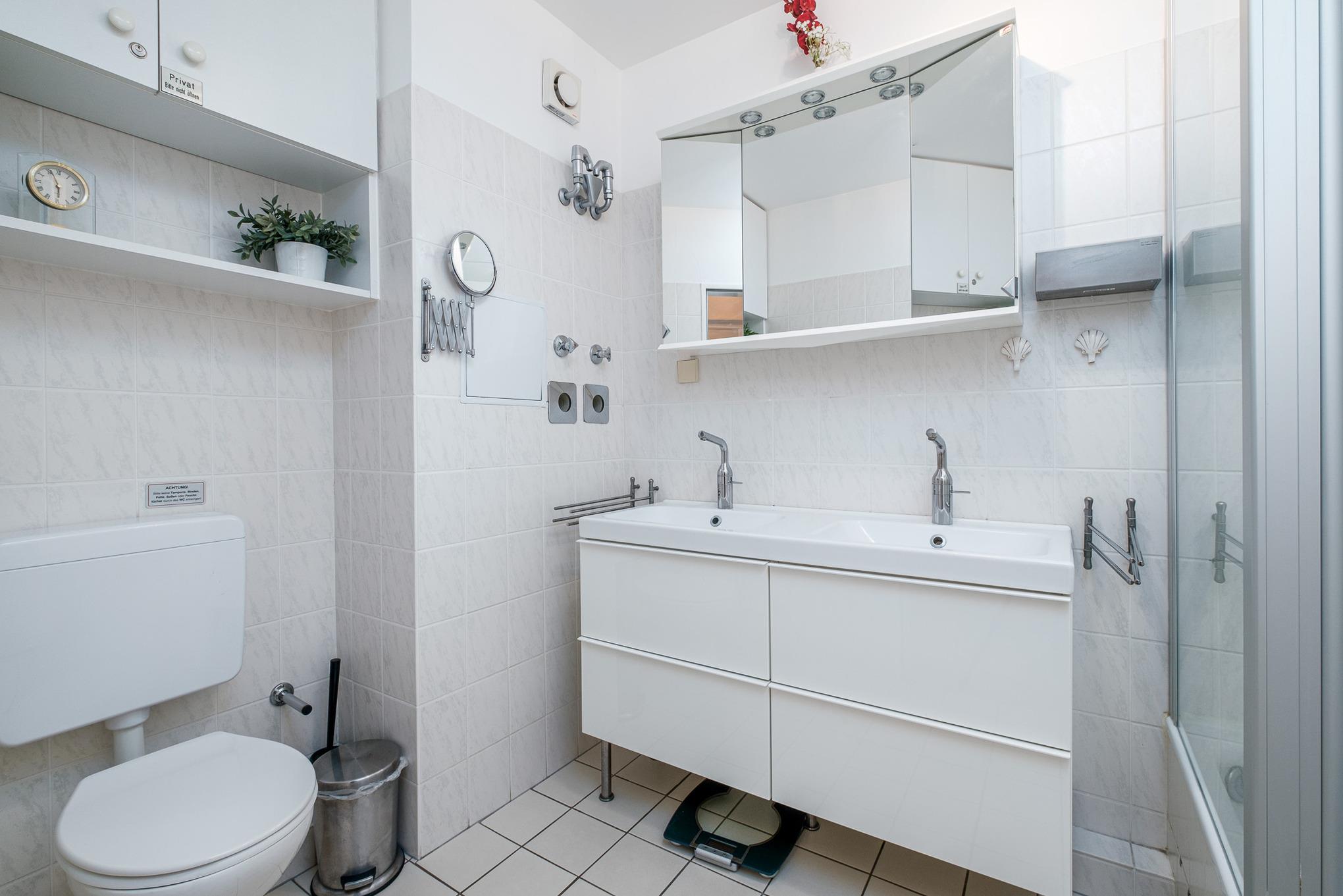 Zusätzlich befindet sich im unteren Bereich die voll ausgestattete Küche mit Geschirrspüler, Mikrowelle und auch einer Waschmaschine, ein Schlafzimmer mit Einzelbett (80 cm x 200 cm) sowie ein helles Badezimmer mit Dusche, WC, Fön und zwei Waschbecken.
