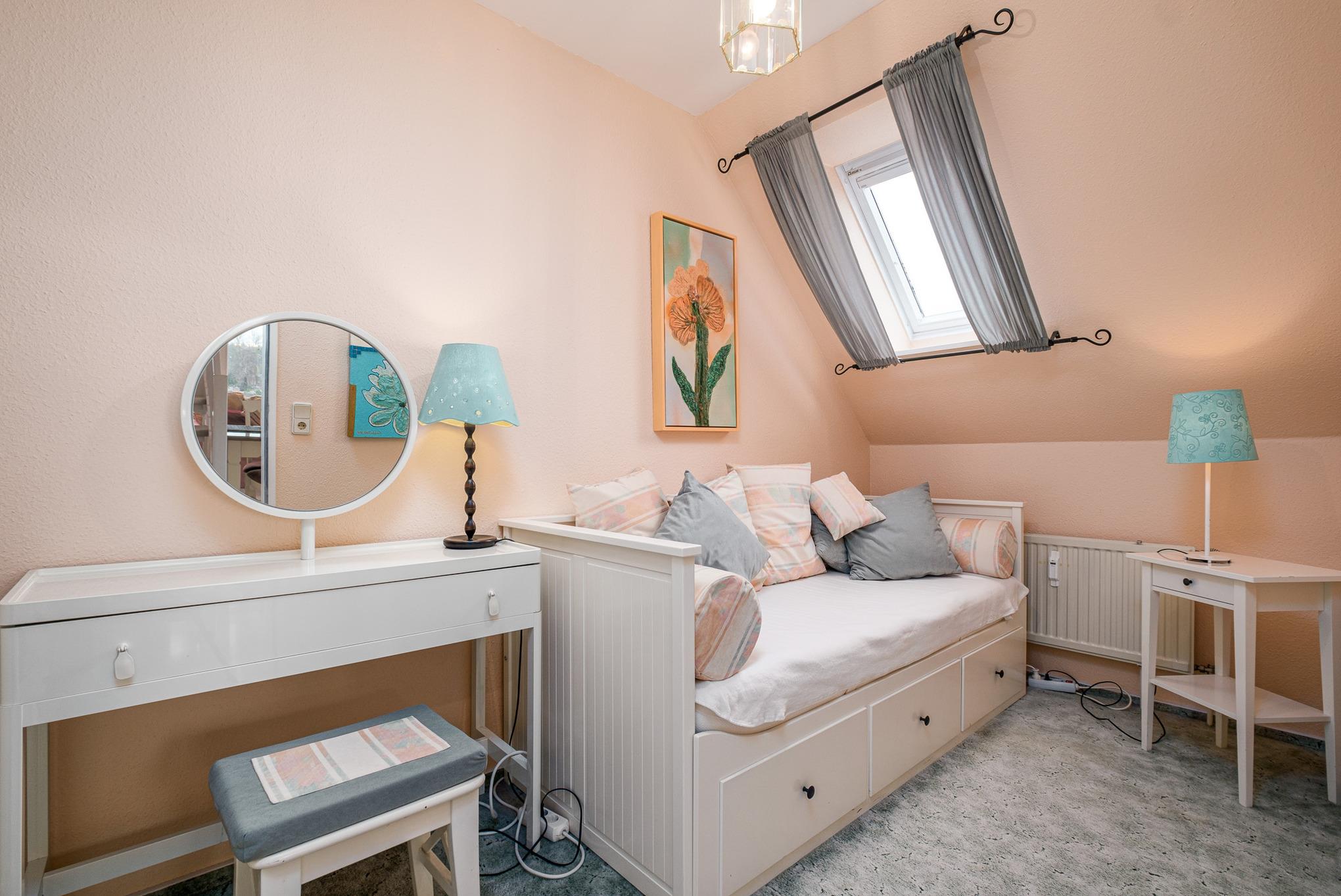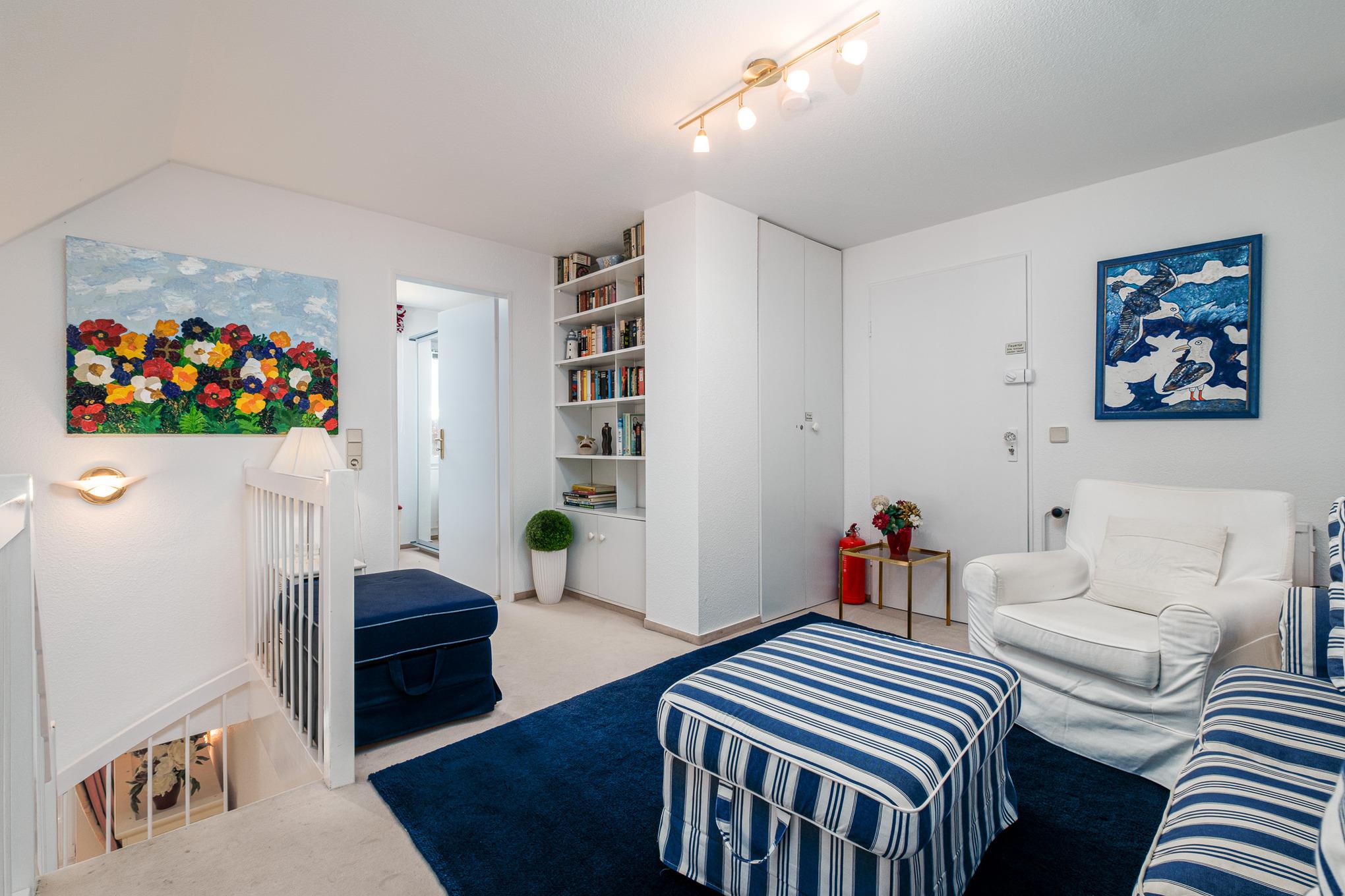 Auf der Galerie im oberen Wohnraum finden Sie eine gemütliche Schlafcouch (160 cm x 200 cm), Kabel-TV mit DVD-Player und Hi-Fi Anlage vor. Hier lassen sich entspannte Filmabende verbringen. Des Weiteren befindet auf der oberen Etage ein Schlafzimmer mit einem franz. Bett (140 cm x 200 cm). In der Ferienwohnung steht Ihnen Internet per WLAN zur Verfügung.