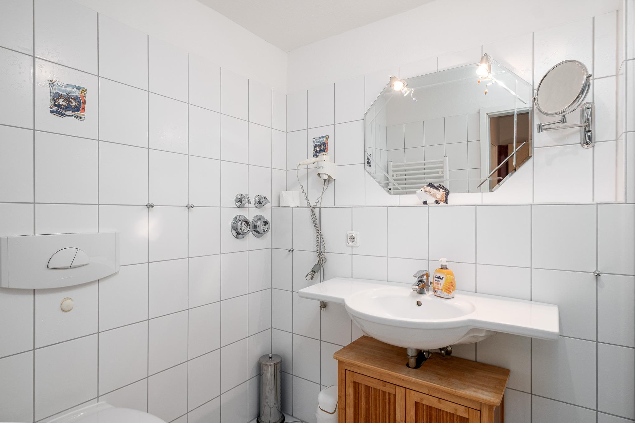 Im hellen Badezimmer mit Dusche, WC, Fön, Kosmetikspiegel sowie einem Handtuchwärmer erfrischen Sie sich von entspannten Tagen am Strand.