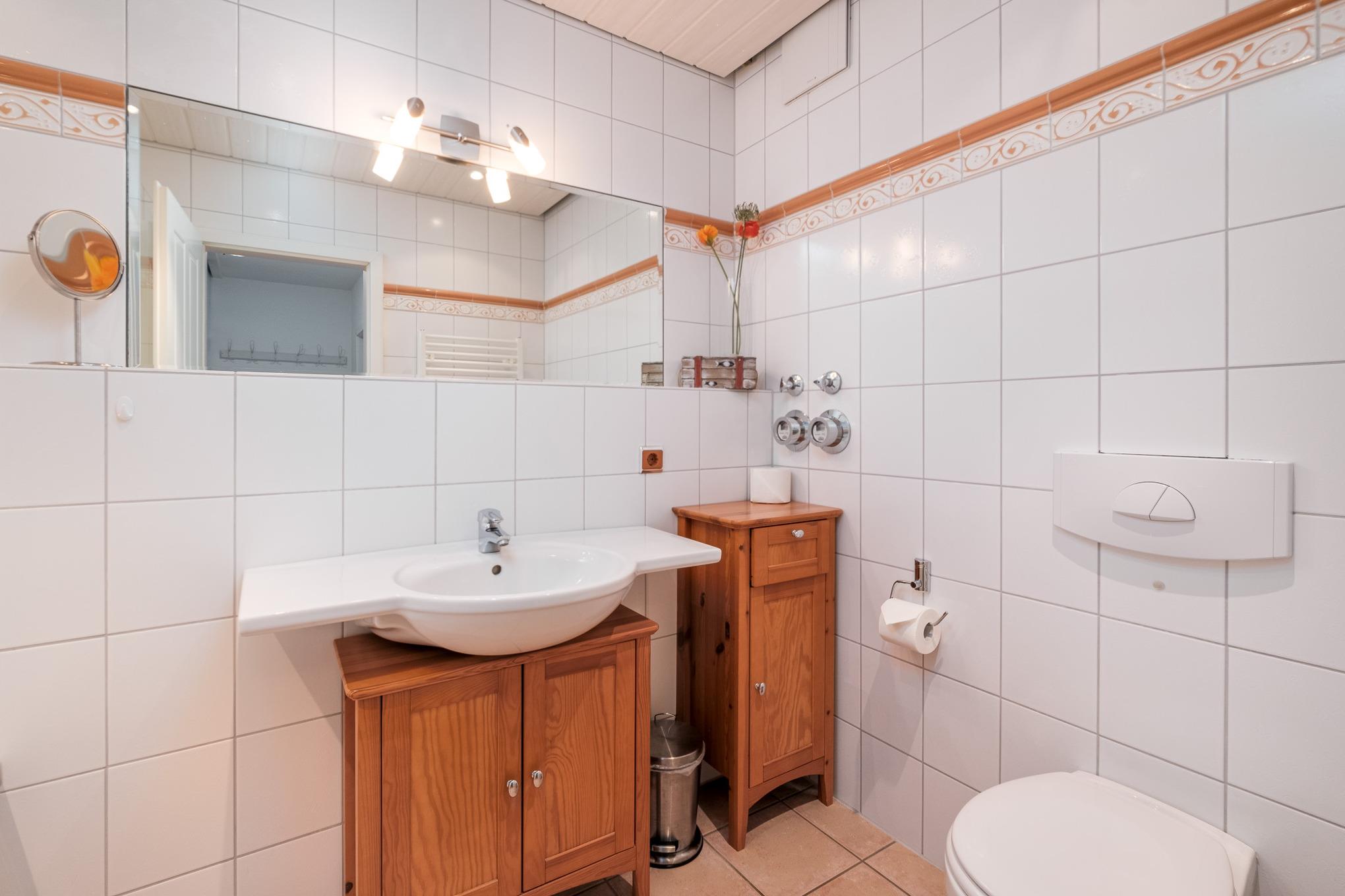 Im hellen Badezimmer gibt es eine Badewanne, WC, Fön und einen Kosmetikspiegel.