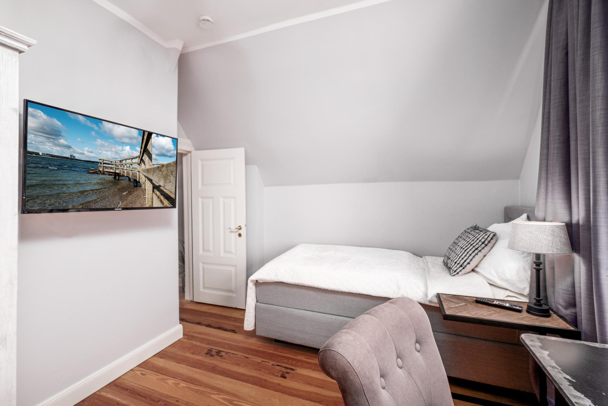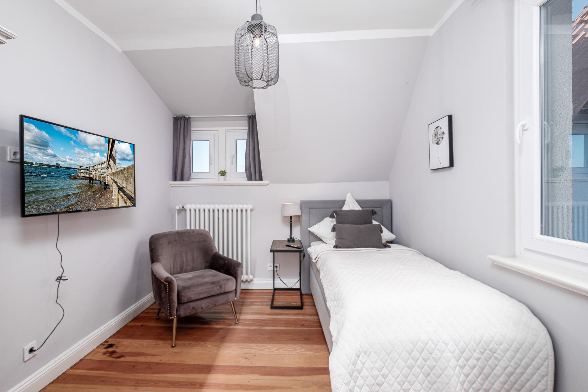 Zusätzlich verfügt diese schöne Niendorf Ferienwohnung mit Meerblick über 3 Schlafzimmer mit komfortablen Boxspringbetten und weiteren Digital-TVs - eines mit einem bequemen Einzelbett (90 cm x 200 cm), das Zweite mit komfortablen Doppelbett (1 x 180 cm x 200 cm) und das dritte Schlafzimmer mit 2 Einzelbetten (je 90 cm x 200 cm).