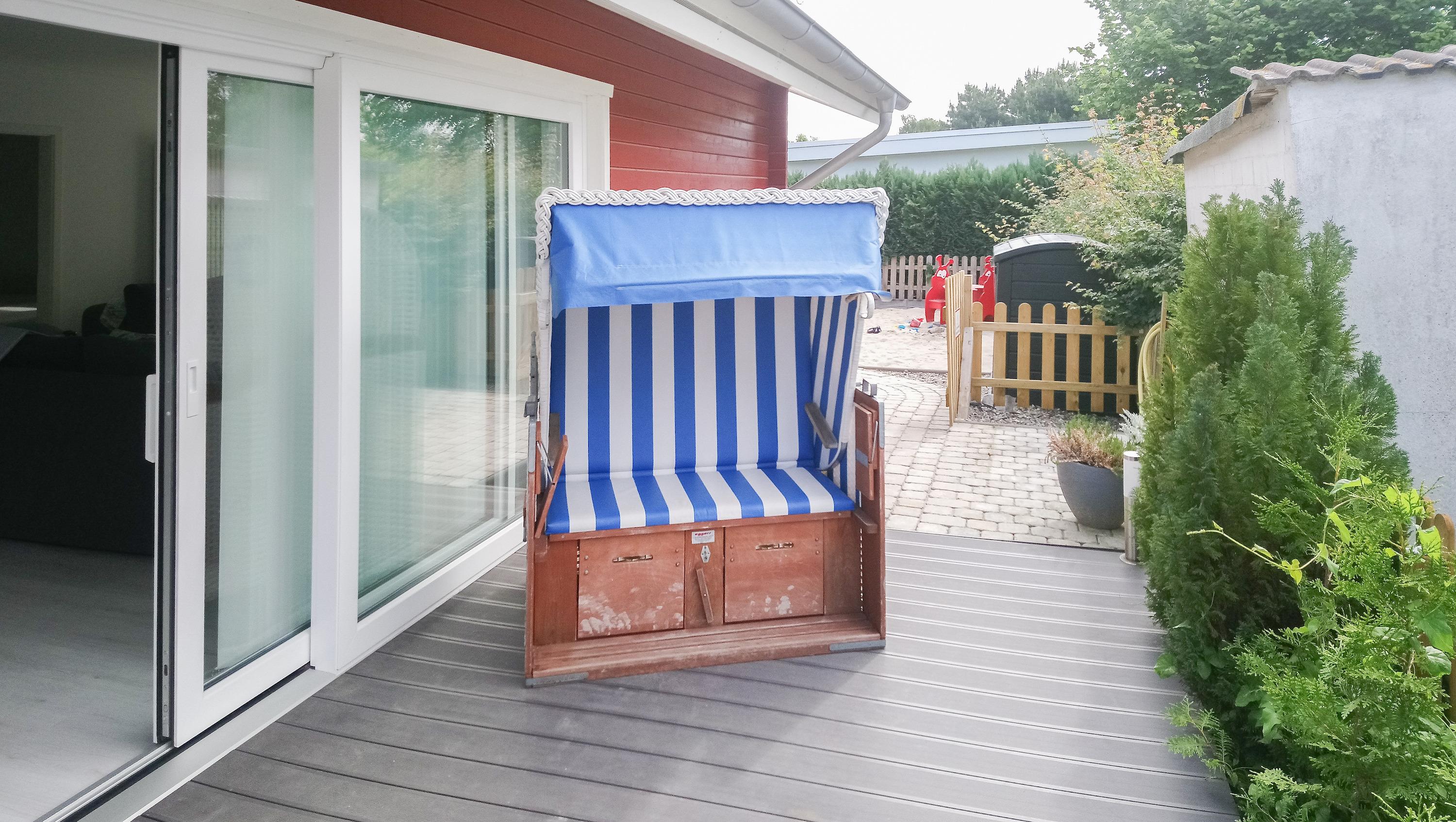 Genießen Sie die frische Ostseeluft auf der sonnigen voll umzäunten Terrasse. Hier erwarten Sie ein Strandkorb, maritime Lounge-Palettenmöbel, ein Grill und ein Sonnenschirm – ideal für lange Sommerabende. Der Garten ist perfekt für Familien, und der tolle Kinderspielplatz bietet Spaß, auch gemeinsam mit den kleinen Gästen des Nachbarhauses Baltic Blau. Für die Kleinsten stellen wir auf Wunsch ein Reisebett und einen Hochstuhl kostenlos zur Verfügung.