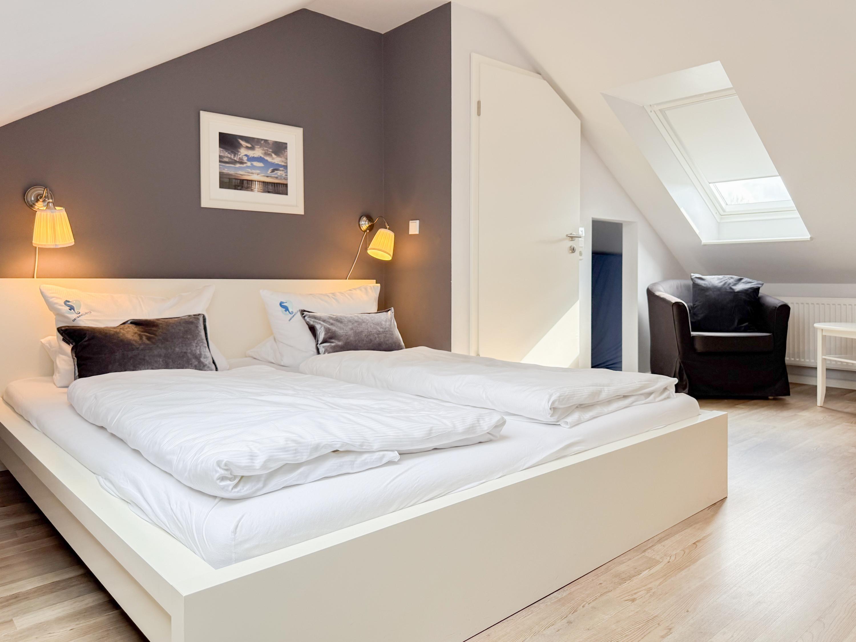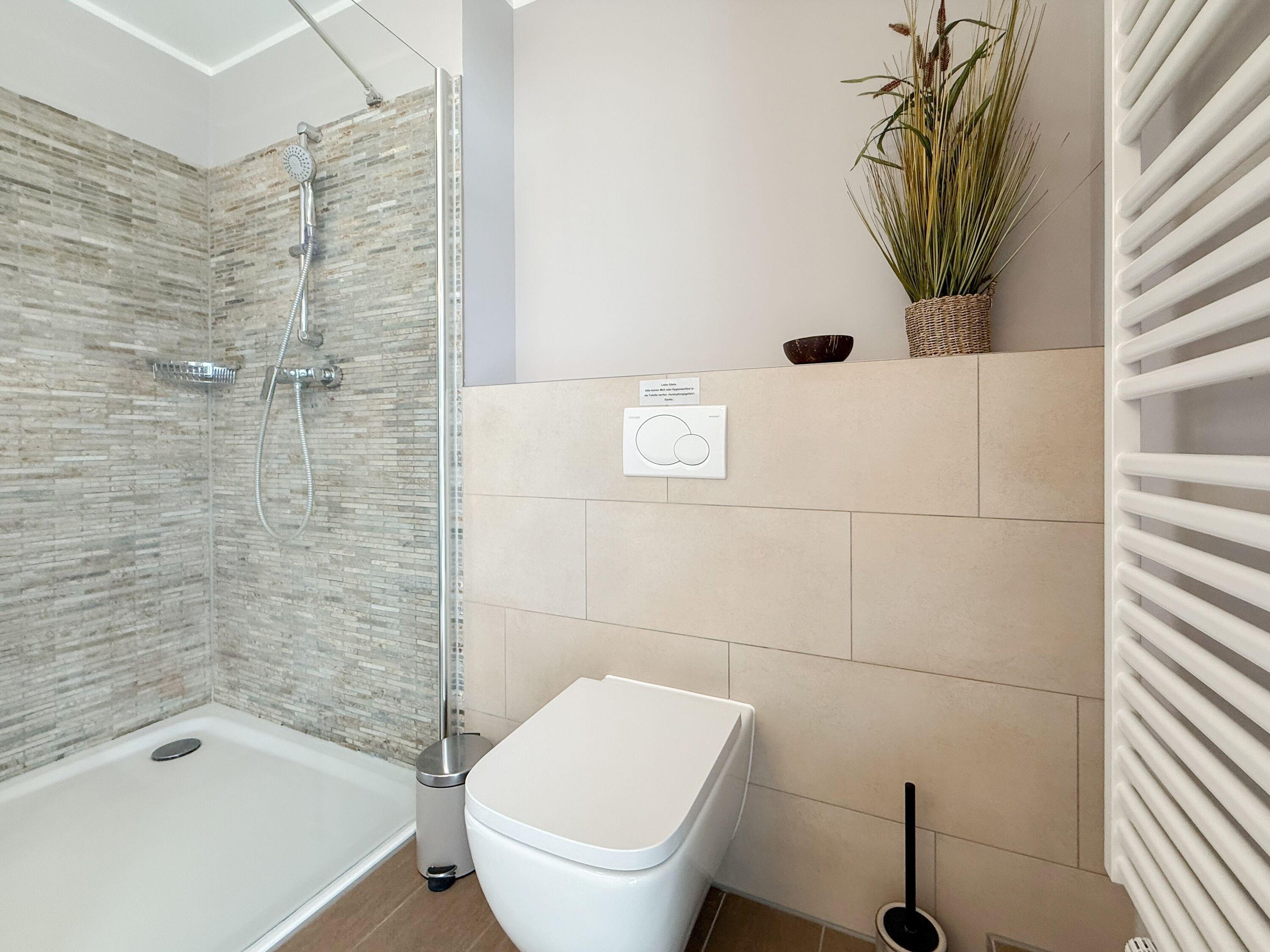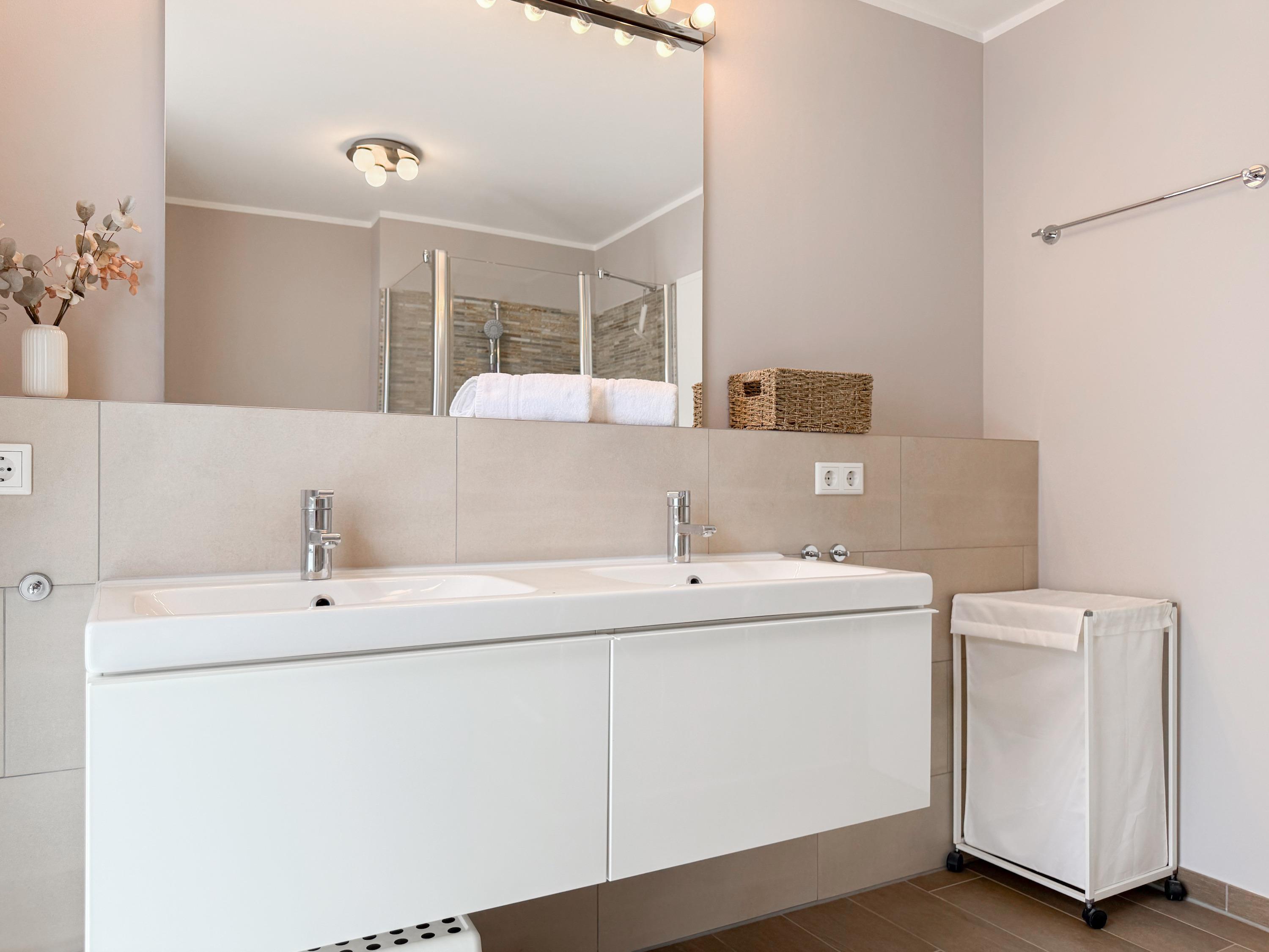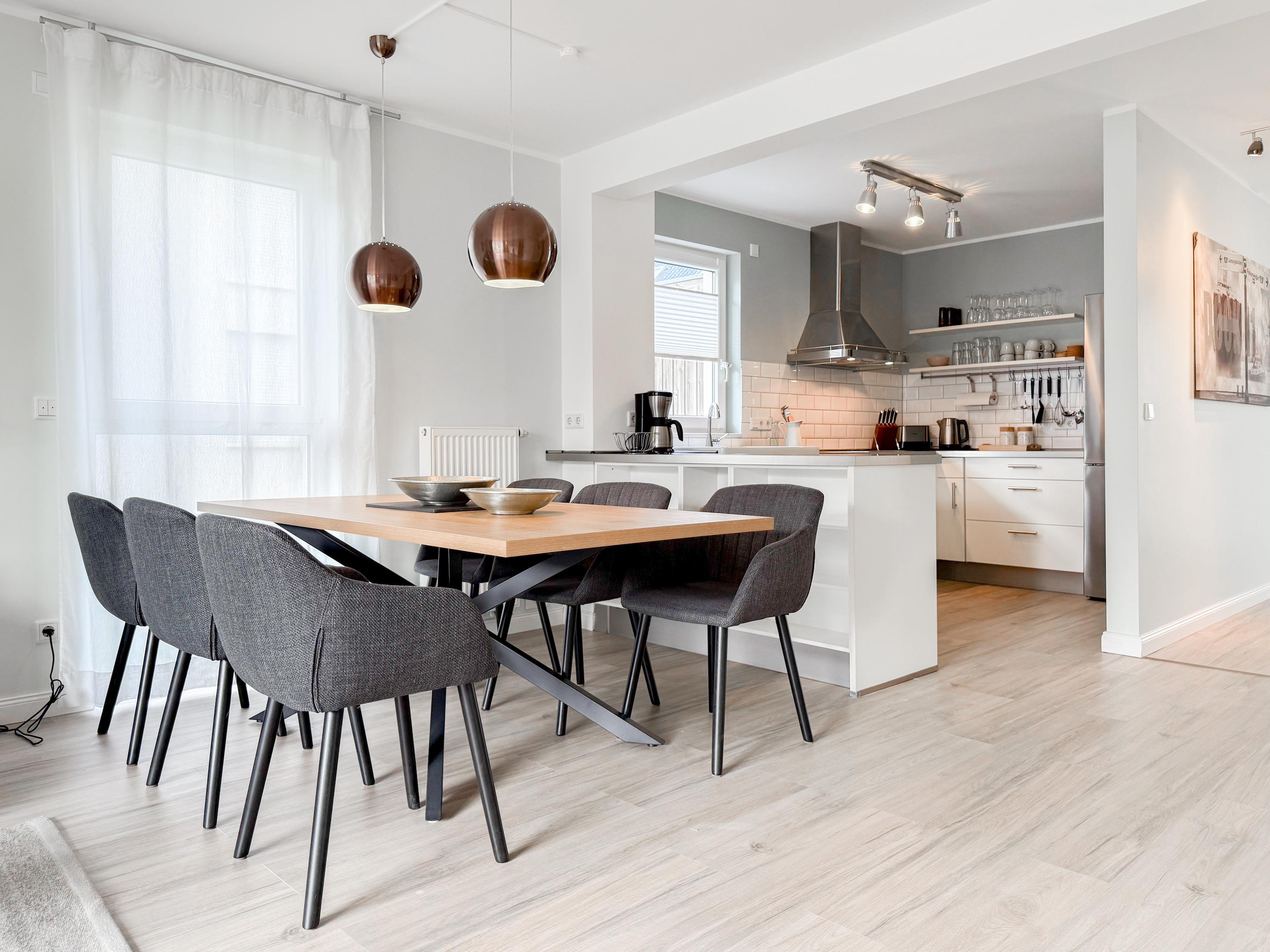 Es erwartet Sie ein tolles Doppelhaus mit 3 separaten Schlafzimmern und 2 Duschbädern. Sonnige Räumlichkeiten auf über 100 qm Wohnfläche und die geschmackvolle Einrichtung mit liebevollen Details schaffen ein behagliches Ambiente für 6 Personen. Im Erdgeschoss erwartet Sie ein großzügiger Wohnbereich, der mit einem gemütlichen Ecksofa und TV eingerichtet ist. Die vorgelagerte Sonnenterrasse in Südausrichtung garantiert erholsame Urlaubszeit. Die großzügige Einbauküche ist bestens ausgestattet und lädt zum gemeinsamen Kochen ein. Der anschließende Essbereich, mit großem Esstisch und gemütlichen Sesseln, bietet ausreichend Platz für gemeinsame Mahlzeiten und geselliges Beisammensein. Im Eingangsbereich befindet sich eine Garderobe und ein neuwertiges Tageslichtbad mit Dusche, Waschbecken und WC. Eine Waschmaschine ist im separaten Abstellraum untergebracht, ebenfalls im Erdgeschoss. Im Obergeschoss befindet sich ein weiteres Duschbad mit Doppelwaschtisch und Fenster sowie 2 separate Schlafzimmer. Schlafzimmer 1 ist äußerst großzügig und mit einem Doppelbett, einer Sitzecke mit TV und einem Schreibtisch für das Home Office eingerichtet. Schlafzimmer 2 verfügt über 2 Einzelbetten und einen gemütlichen Relaxsessel. Im Dachgeschoss befindet sich das 3. Schlafzimmer mit einem Doppelbett (180x200), Kleiderschrank und Sessel. Die Dachflächenfenster lassen sich über ein Rollo verdunkeln, alle anderen Fenster des Hauses sind mit elektrischen Außenjalousien versehen. WLAN steht selbstverständlich kostenlos zur Verfügung. Vor dem Haus befinden sich zwei Parkplätze. (1 Carport und 1 Außenstellplatz). Fahrräder können sicher und trocken im Schuppen am Haus untergestellt werden. [nbsp]