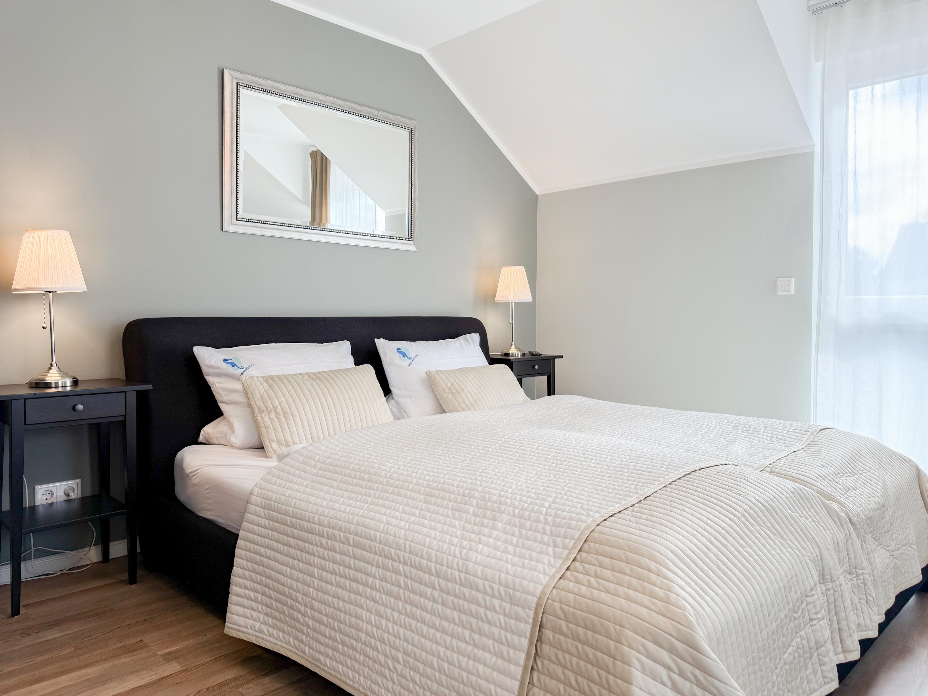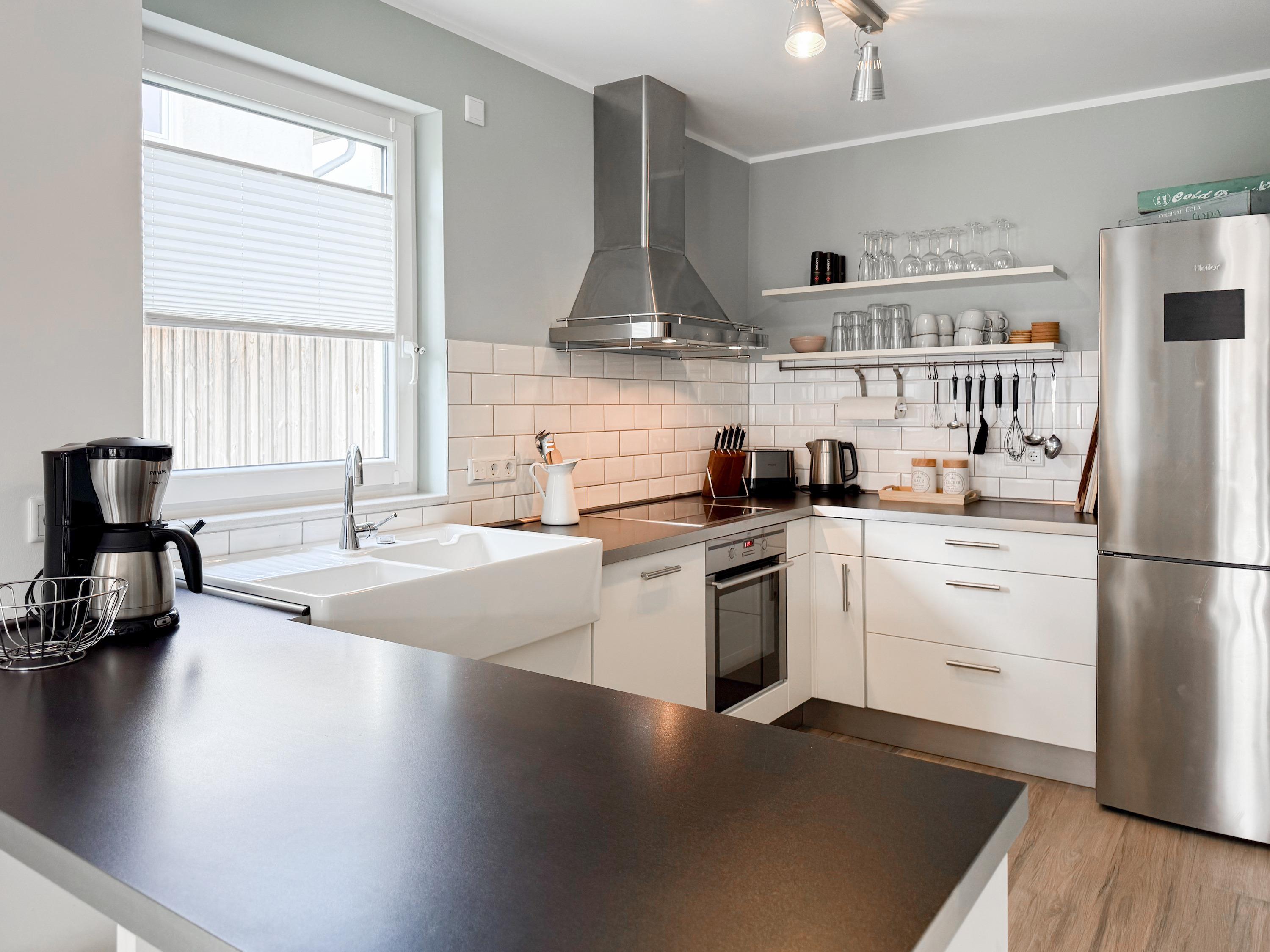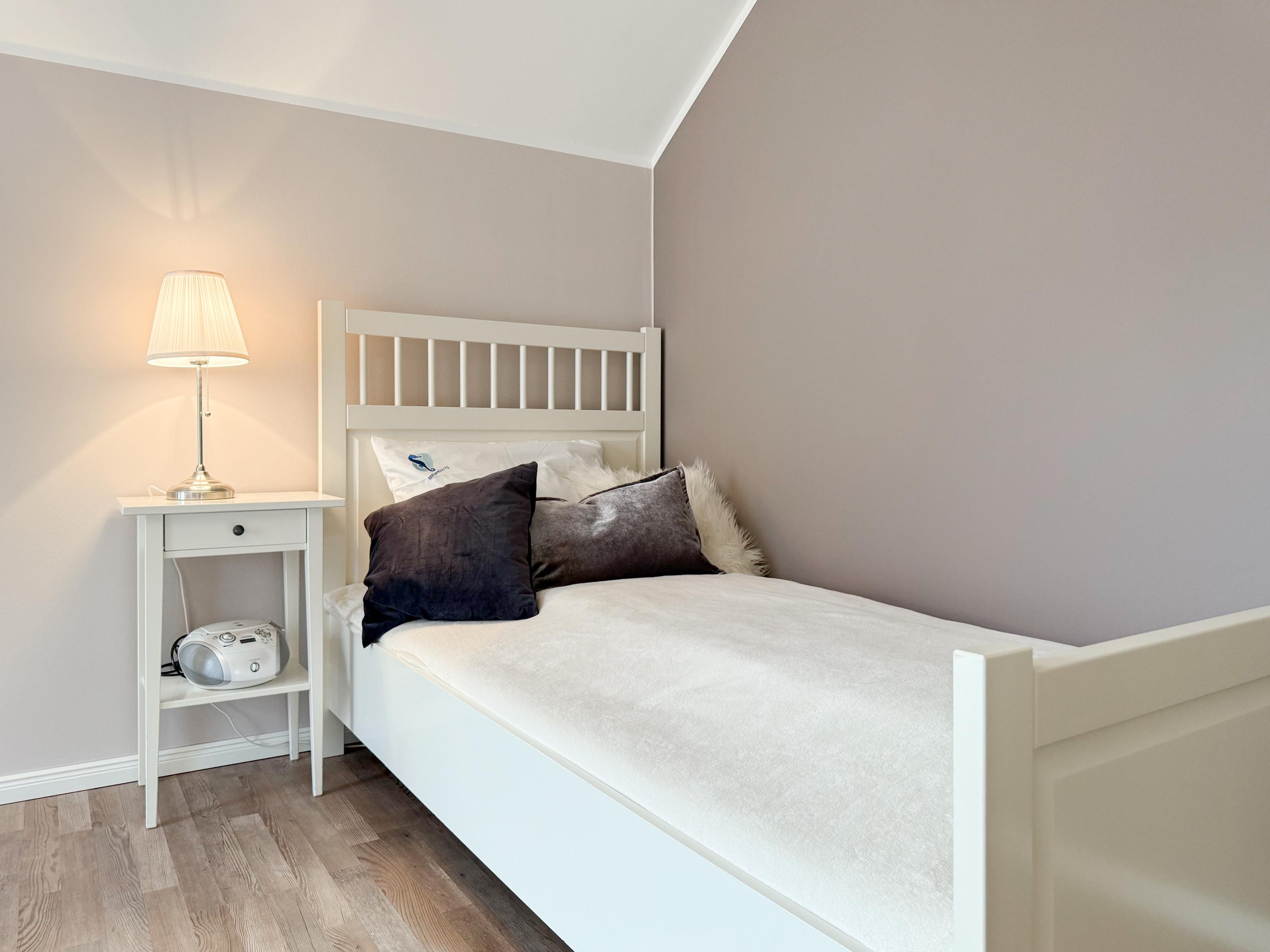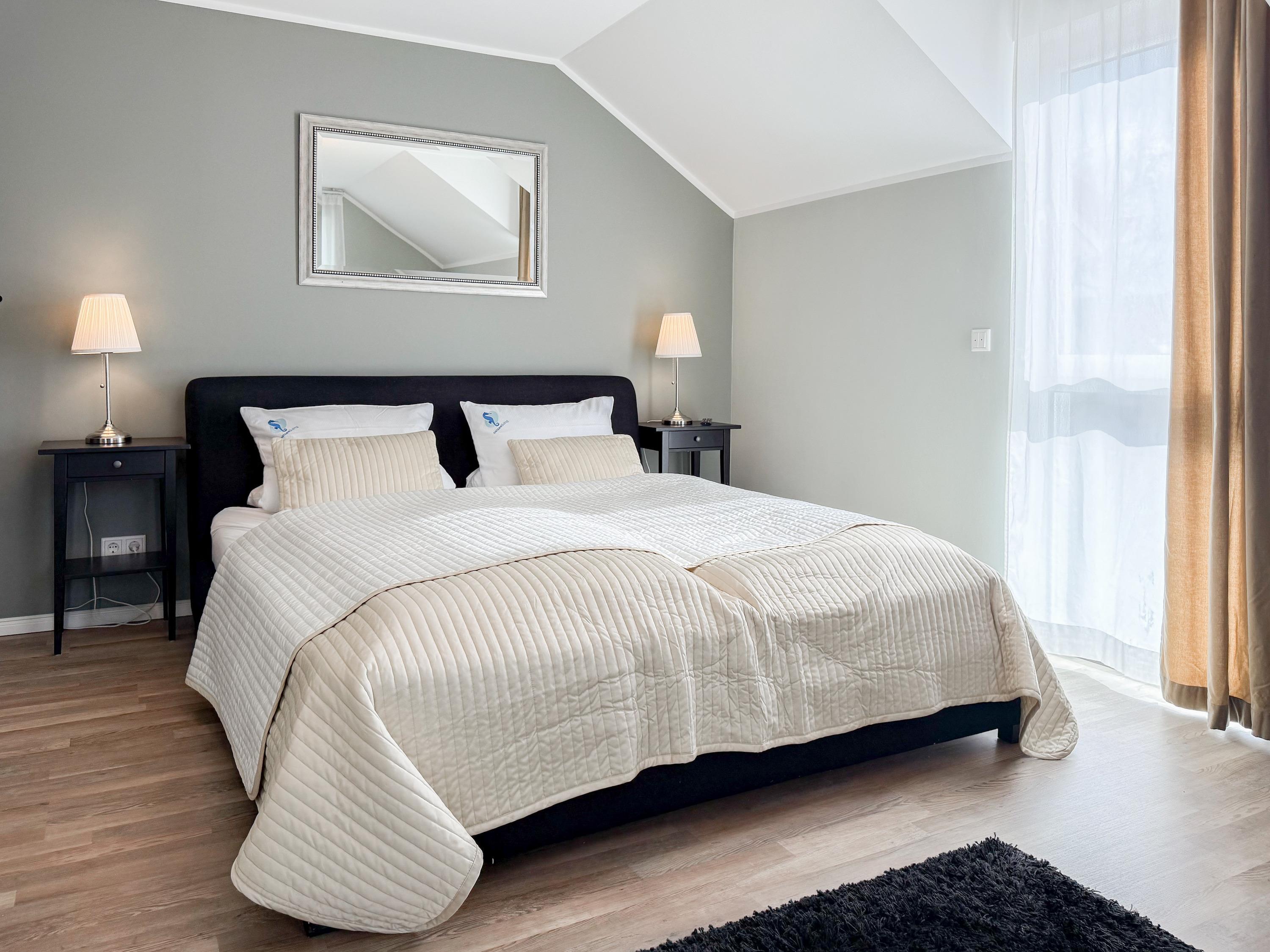Es erwartet Sie ein tolles Doppelhaus mit 3 separaten Schlafzimmern und 2 Duschbädern. Sonnige Räumlichkeiten auf über 100 qm Wohnfläche und die geschmackvolle Einrichtung mit liebevollen Details schaffen ein behagliches Ambiente für 6 Personen. Im Erdgeschoss erwartet Sie ein großzügiger Wohnbereich, der mit einem gemütlichen Ecksofa und TV eingerichtet ist. Die vorgelagerte Sonnenterrasse in Südausrichtung garantiert erholsame Urlaubszeit. Die großzügige Einbauküche ist bestens ausgestattet und lädt zum gemeinsamen Kochen ein. Der anschließende Essbereich, mit großem Esstisch und gemütlichen Sesseln, bietet ausreichend Platz für gemeinsame Mahlzeiten und geselliges Beisammensein. Im Eingangsbereich befindet sich eine Garderobe und ein neuwertiges Tageslichtbad mit Dusche, Waschbecken und WC. Eine Waschmaschine ist im separaten Abstellraum untergebracht, ebenfalls im Erdgeschoss. Im Obergeschoss befindet sich ein weiteres Duschbad mit Doppelwaschtisch und Fenster sowie 2 separate Schlafzimmer. Schlafzimmer 1 ist äußerst großzügig und mit einem Doppelbett, einer Sitzecke mit TV und einem Schreibtisch für das Home Office eingerichtet. Schlafzimmer 2 verfügt über 2 Einzelbetten und einen gemütlichen Relaxsessel. Im Dachgeschoss befindet sich das 3. Schlafzimmer mit einem Doppelbett (180x200), Kleiderschrank und Sessel. Die Dachflächenfenster lassen sich über ein Rollo verdunkeln, alle anderen Fenster des Hauses sind mit elektrischen Außenjalousien versehen. WLAN steht selbstverständlich kostenlos zur Verfügung. Vor dem Haus befinden sich zwei Parkplätze. (1 Carport und 1 Außenstellplatz). Fahrräder können sicher und trocken im Schuppen am Haus untergestellt werden. [nbsp]