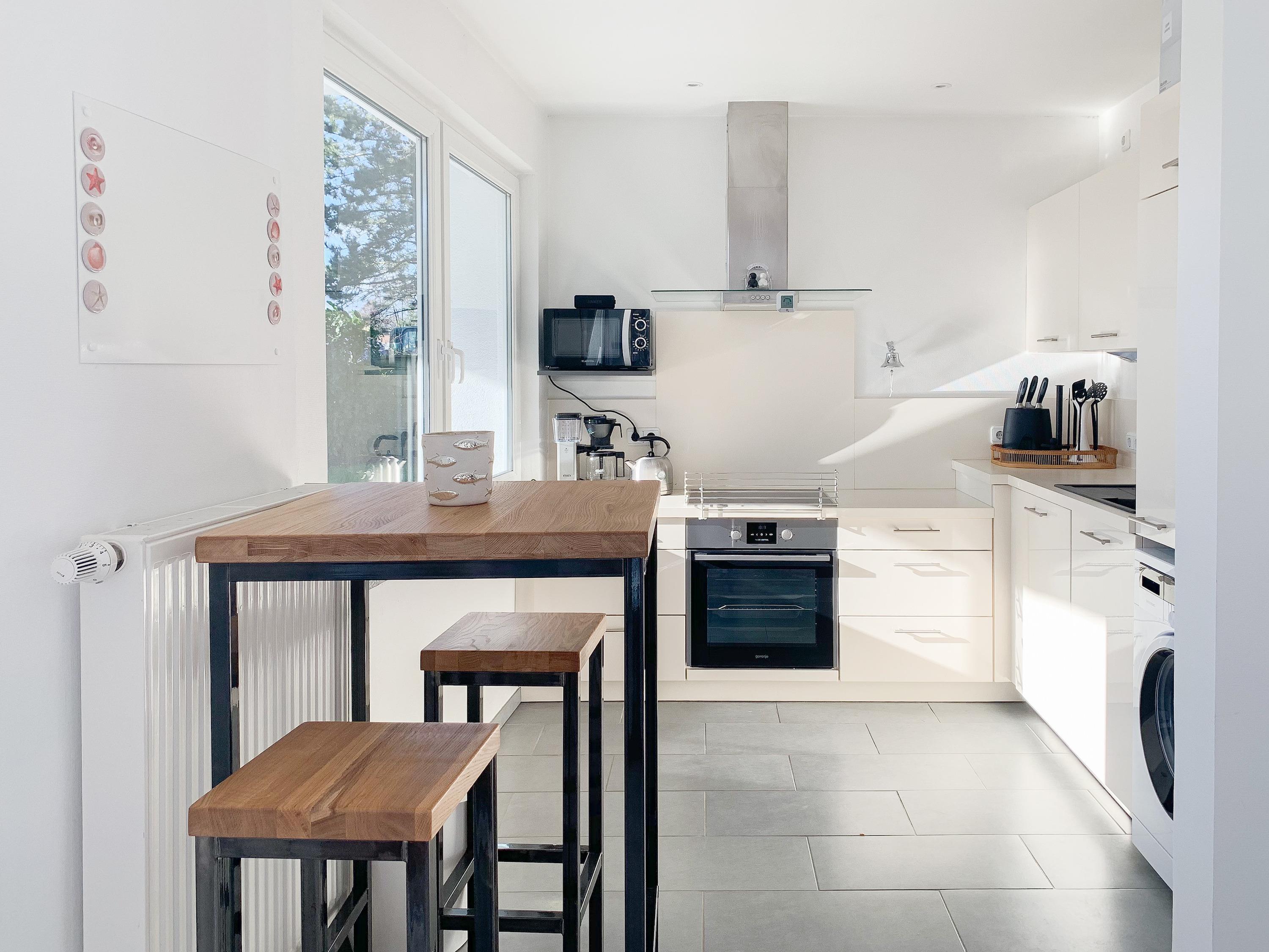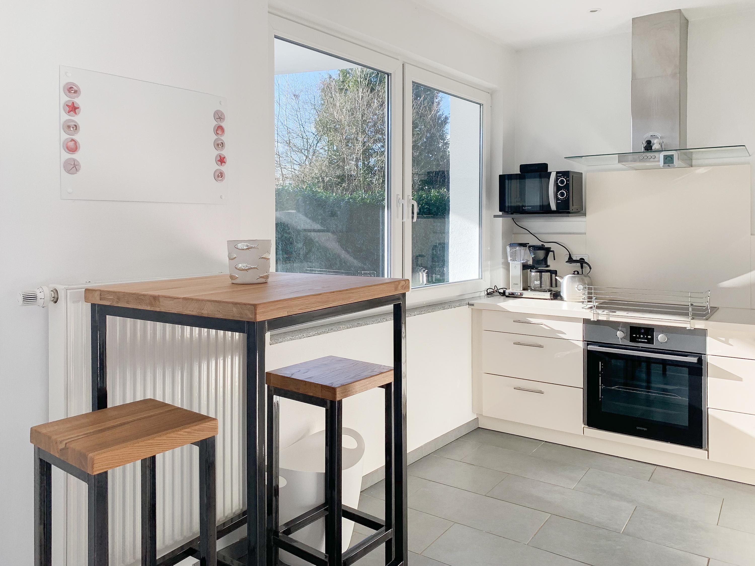 Stehtisch im offenen Wohn-Küchenbereich – ein gemütlicher Morgenkaffee oder dem Liebsten beim Kochen zusehen.