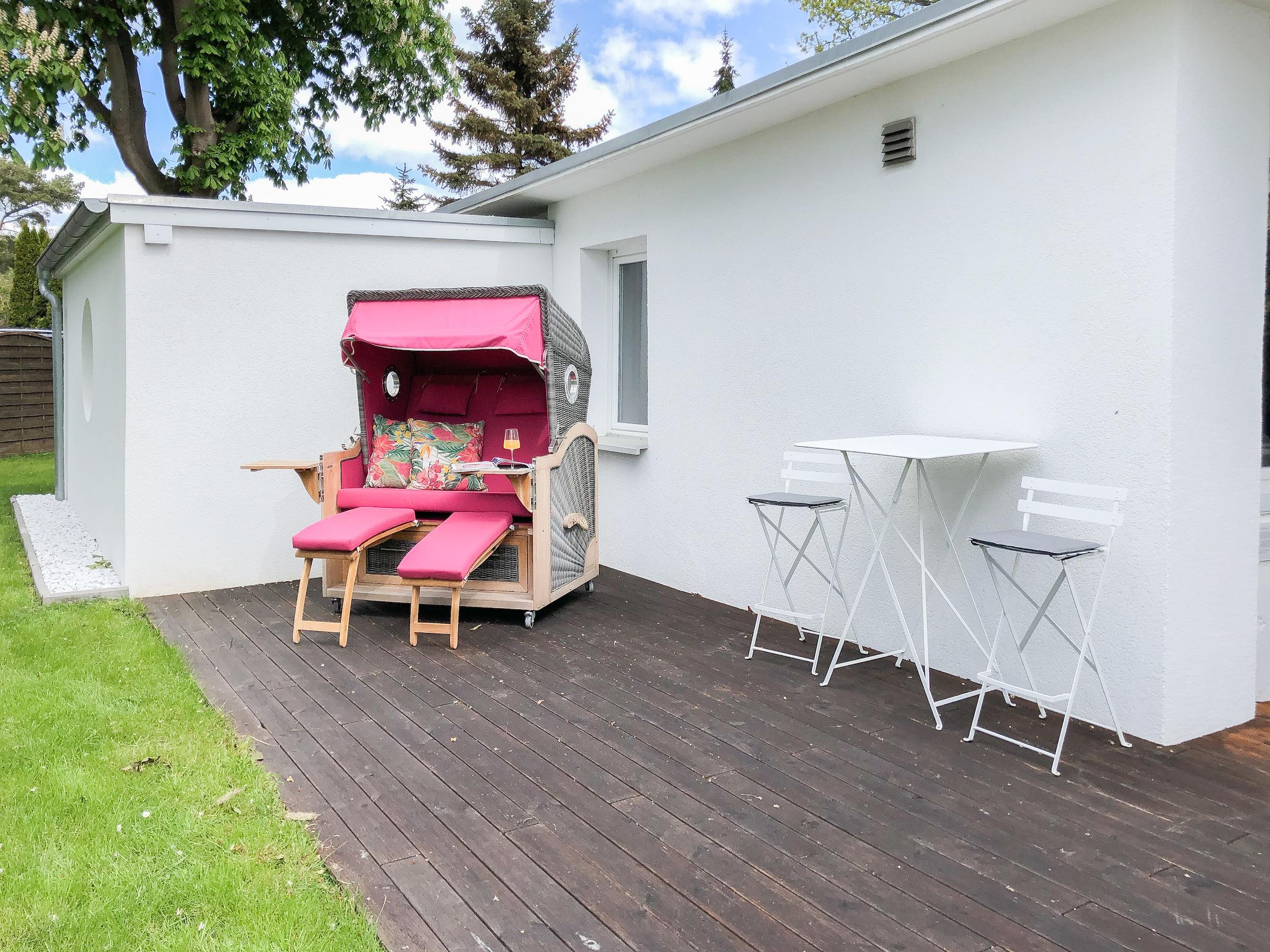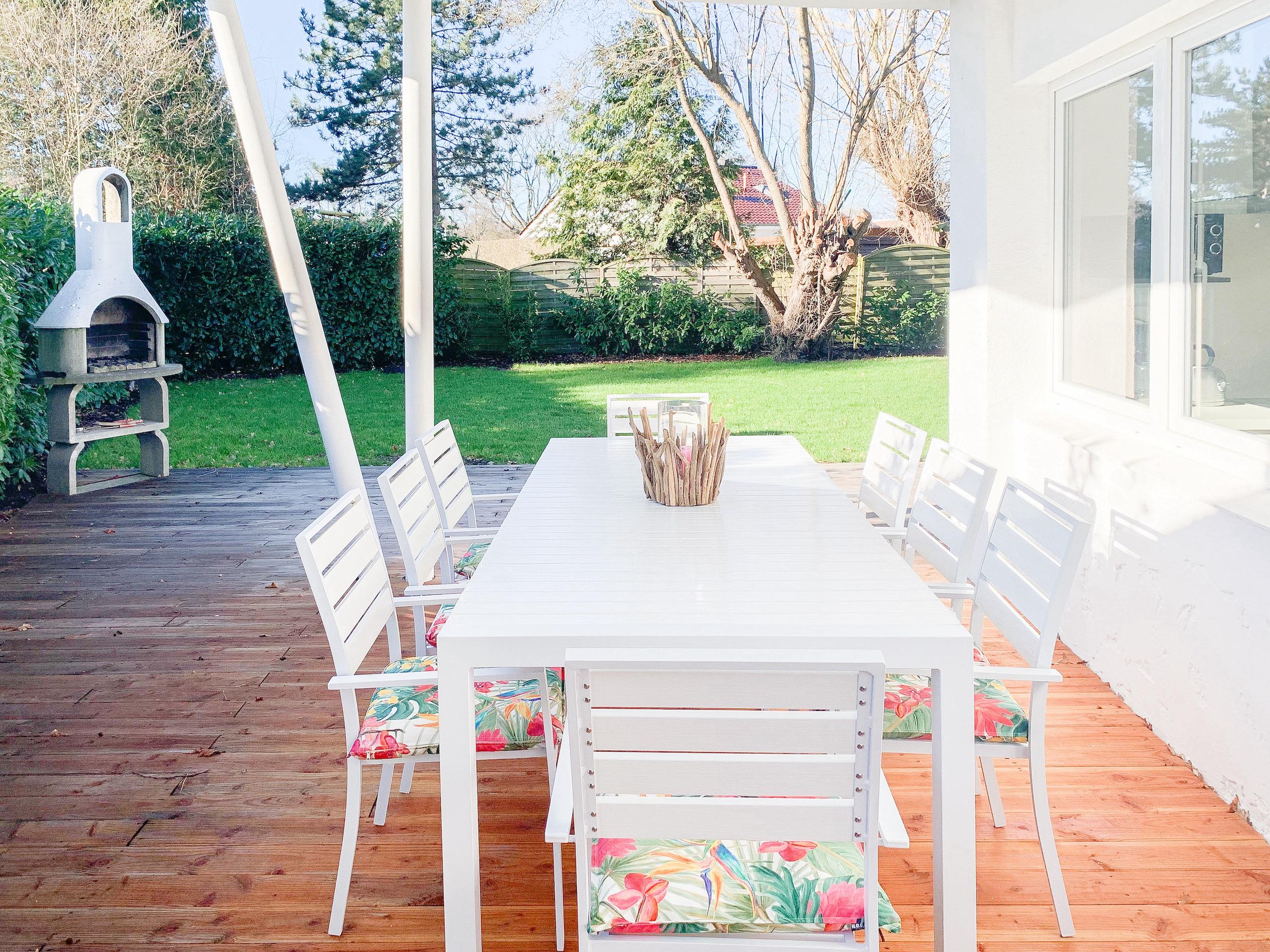 Kuscheldecken und der Infrarotheizstrahler auf der Terrasse schenken ganzjährige Freiluftmomente, auch an kühleren Tagen.