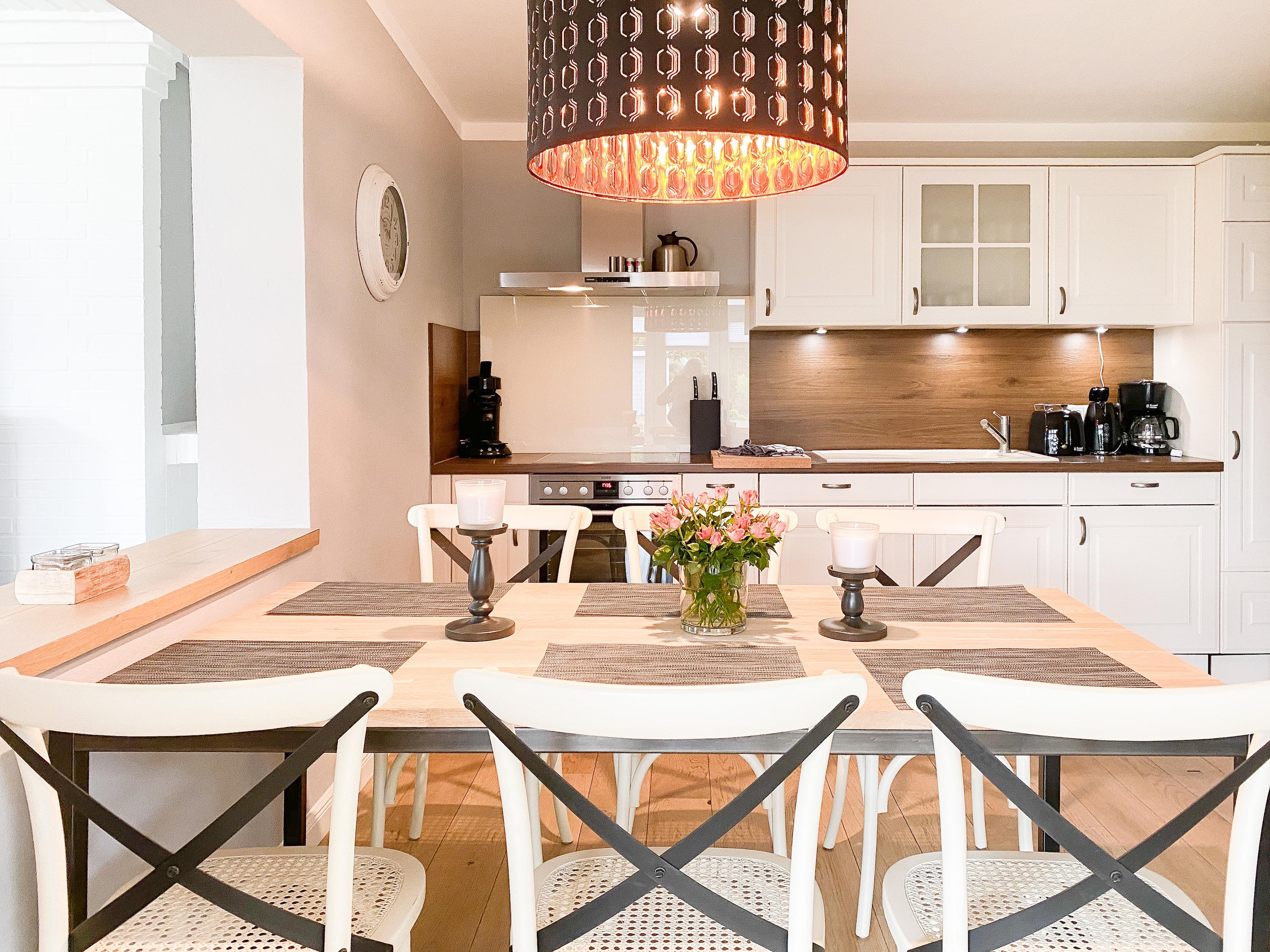 Mit circa 90 qm Wohnfläche, einem schönem eingewachsenem Garten in Südwestausrichtung, großer Terrasse und separatem Saunahaus, eignet es sich bestens für Familien und bietet ausreichend Platz für 5-6 Personen inklusive Kindern. Mittelpunkt des Hauses bildet der großzügige Wohnbereich mit riesigen Fensterflächen und wunderschönem Blick in den weitläufigen, eingezäunten Garten. Helle Räumlichkeiten, Echtholzböden und die geschmackvolle Einrichtung schaffen eine[nbsp] Atmosphäre zum Wohlfühlen. Es erwartet Sie eine hochwertige Wohnlandschaft, ein Kaminofen für gemütliche Abende und eine zeitgemäße Ausstattung wie TV, Bluetooth Lautsprecher, Radio und WLAN.[nbsp] Der großzügig angelegte Außenbereich verfügt über eine[nbsp] überdachte Terrasse in Südwest Ausrichtung mit reichlich Platz für gemütliche Stunden und einen schönen Garten mit Sonnenliegen und Gartenmöbeln. Erholung und Entspannung finden Sie im Saunahaus, das ebenfalls im Garten untergebracht ist. Die offene Einbauküche[nbsp][nbsp]ist bestens ausgestattet(Geschirrspüler, Backofen, Mikrowelle) und der integrierte Essbereich bietet ausreichend Platz für 6 Personen. Das Haus verfügt über drei[nbsp][nbsp]kleine Schlafzimmer mit Doppelbetten (160x200) und alle [nbsp]Fenster sind mit Plissees und Verdunkelungsvorhängen/Rollos versehen. Ein Schlafzimmer ist zusätzlich mit einem TV ausgestattet und verfügt über ein modernes Duschbad ensuite.[nbsp] Das zweite Duschbad ist über den Flur zu erreichen. Der vorhandene Stauraum für die Urlaubsgarderobe ist in zwei Schlafzimmern relativ gering.