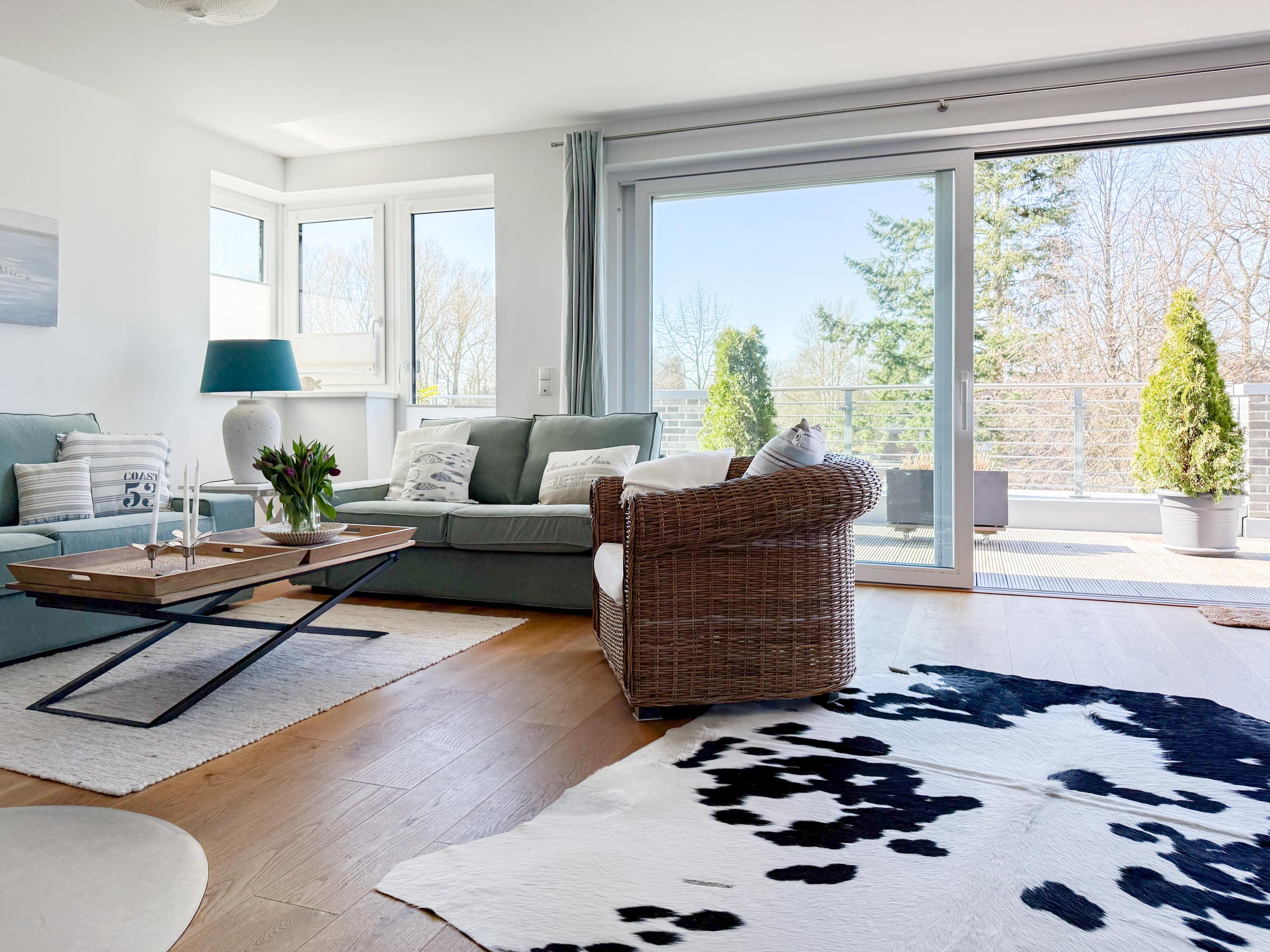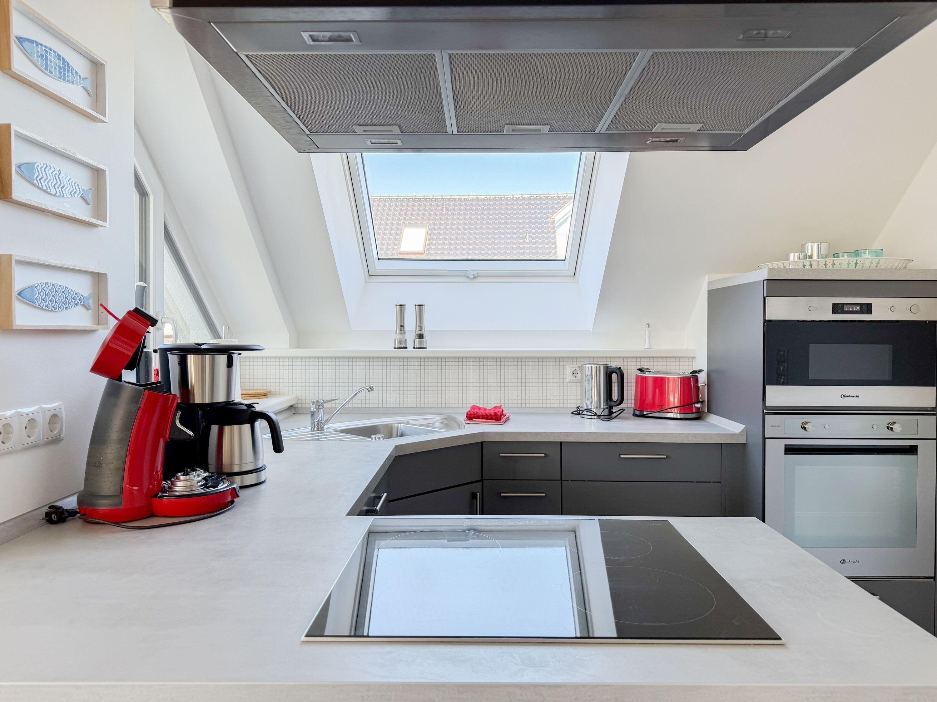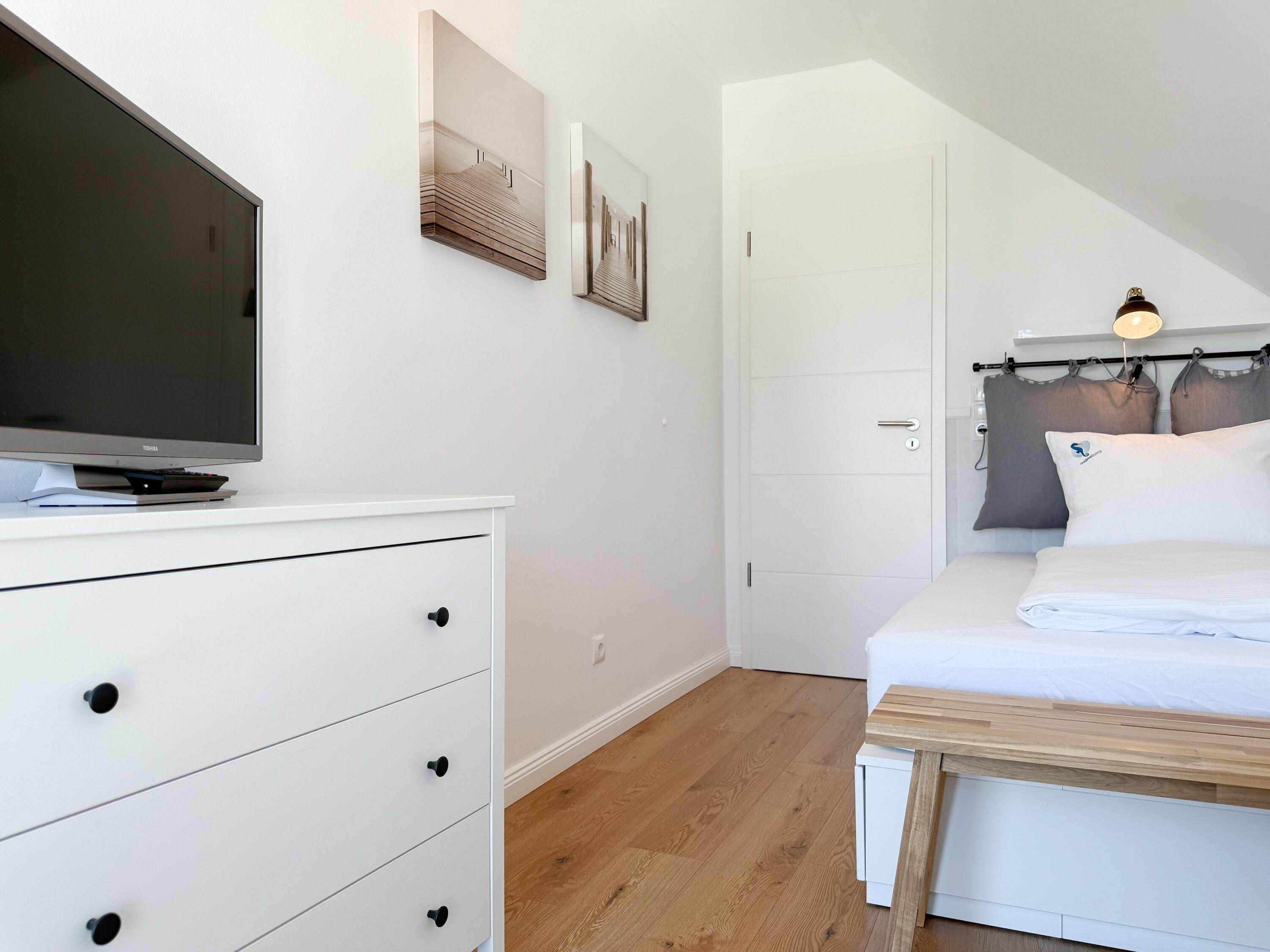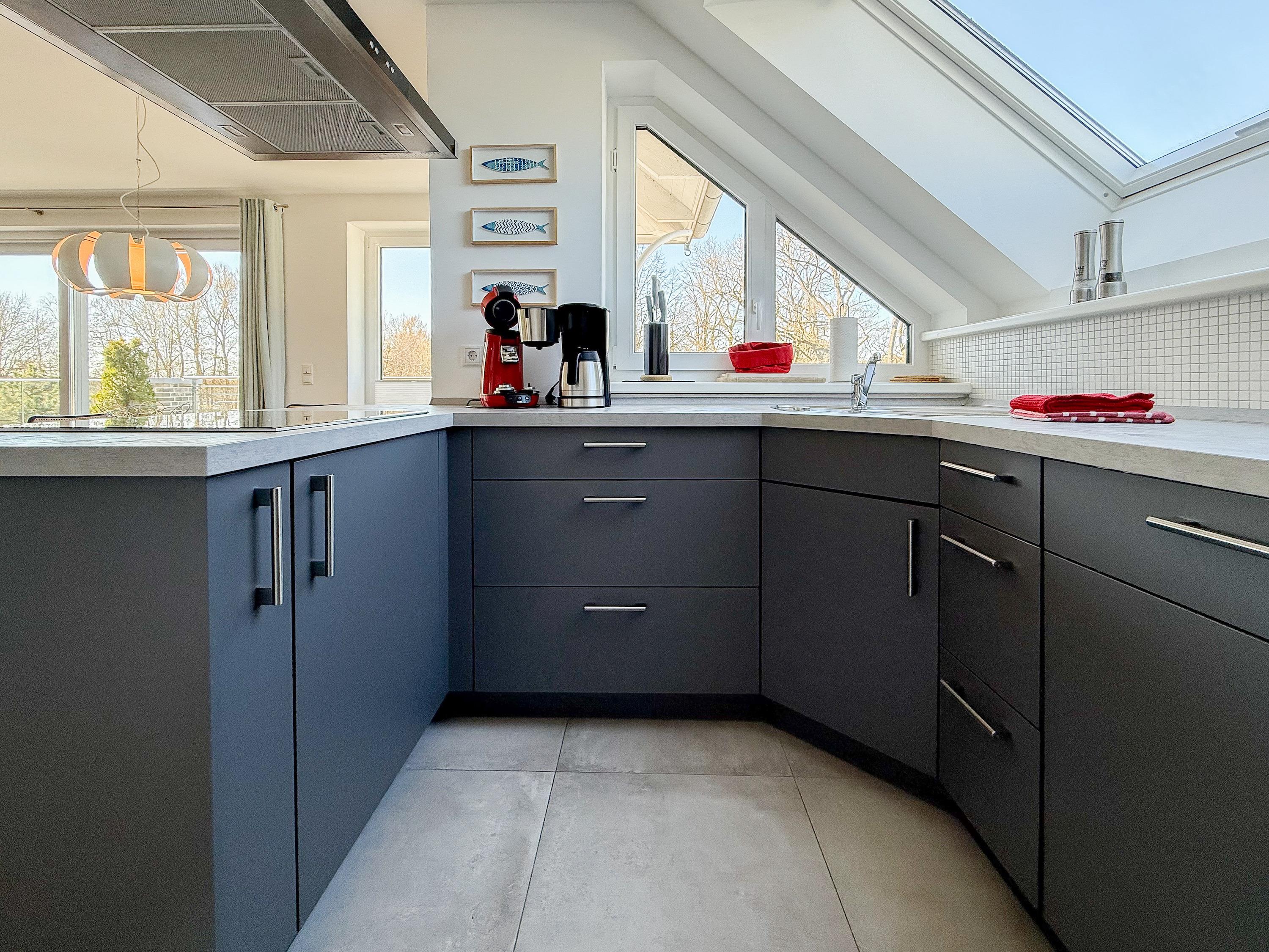 Das Penthouse ist hochwertig eingerichtet und bestens ausgestattet. Große, bodentiefe Fensterflächen durchfluten die Räumlichkeiten mit Tageslicht und sorgen für ein angenehmes Wohlfühlambiente – ideal für einen entspannten Ostseeurlaub. Ein besonderes Highlight ist die großzügige, über 50 m² große Dachterrasse in Südwestausrichtung. Hier lassen sich die frische Meeresluft und den Hafenblick genießen – ob auf den Sonnenliegen, an den Gartenmöbeln oder im Schatten der elektrischen Markise. Der offene Wohn- und Essbereich bietet viel Platz für gesellige Stunden. Ein Kaminofen (Holz nicht inklusive) sorgt für eine gemütliche Atmosphäre, und die moderne Einbauküche mit Kochinsel ist mit allen wichtigen Geräten ausgestattet – perfekt für alle, die gerne gemeinsam kochen. Auf der unteren Wohnebene befindet sich eines der beiden stilvollen Bäder mit Dusche und Waschtisch sowie eine Sauna mit Blick ins Grüne. Die obere Ebene beherbergt zwei separate Schlafzimmer mit Doppelbetten (180x200 und 140x200 plus Schlafsessel), Verdunkelungsvorhängen und TV. Das kleine Schlafzimmer punktet mit einem tollen Blick auf den Hafen. Ein weiteres Badezimmer mit Badewanne rundet den Komfort ab. Das Penthouse bietet auf über 100 m² einen herrlichen Rückzugsort für 2-4 Personen mit der ganz besonderen Atmosphäre des Hafens.