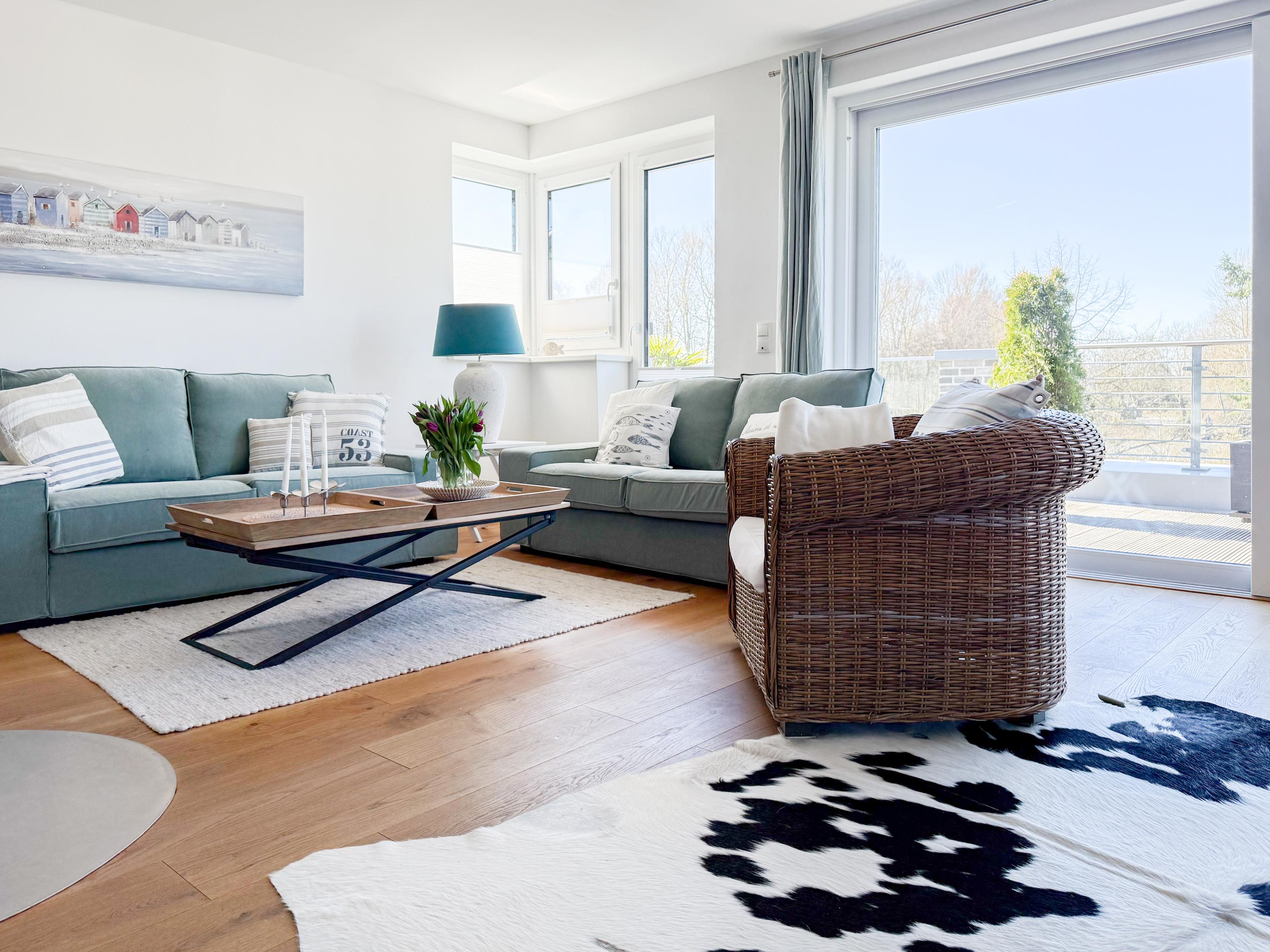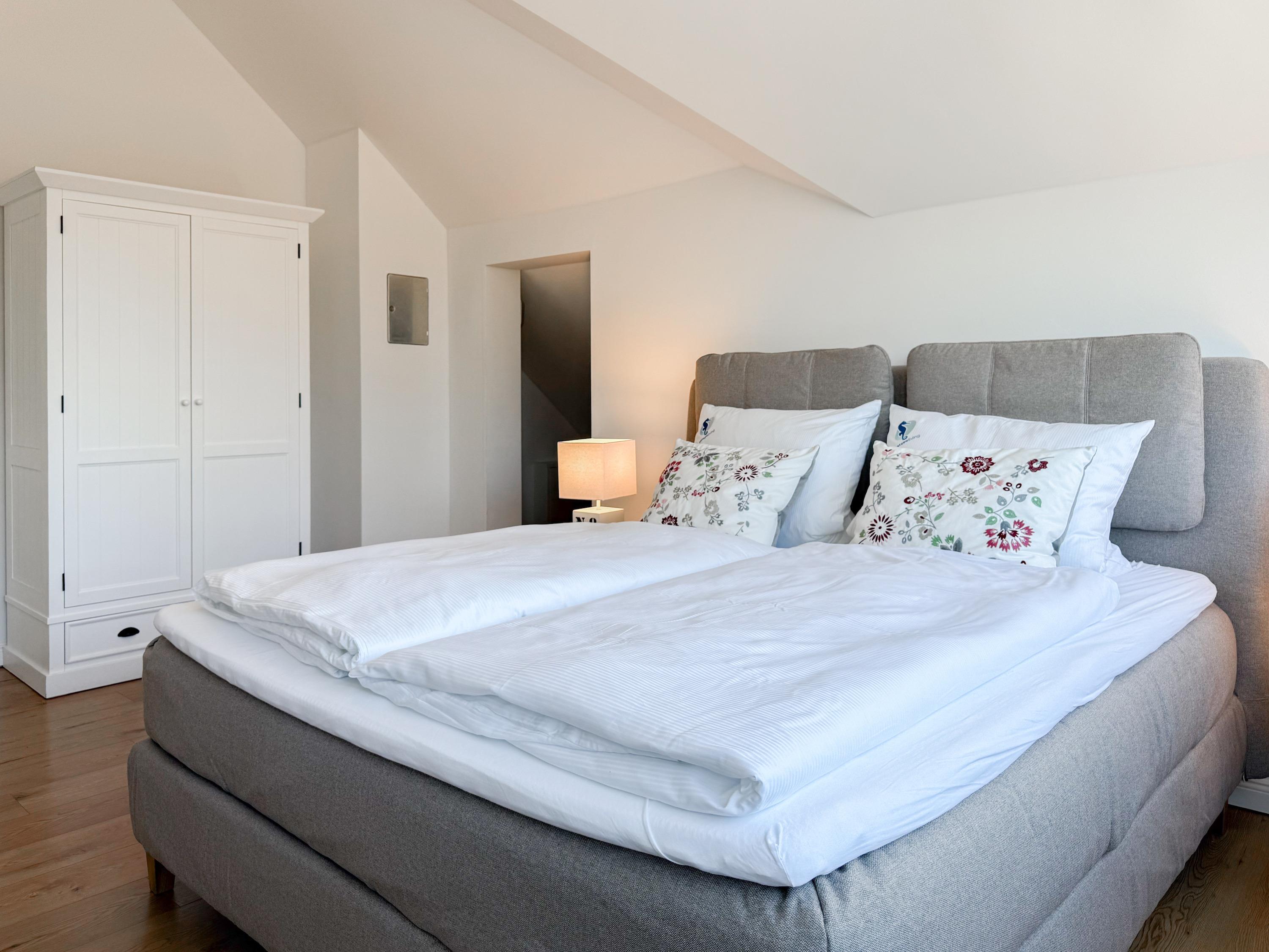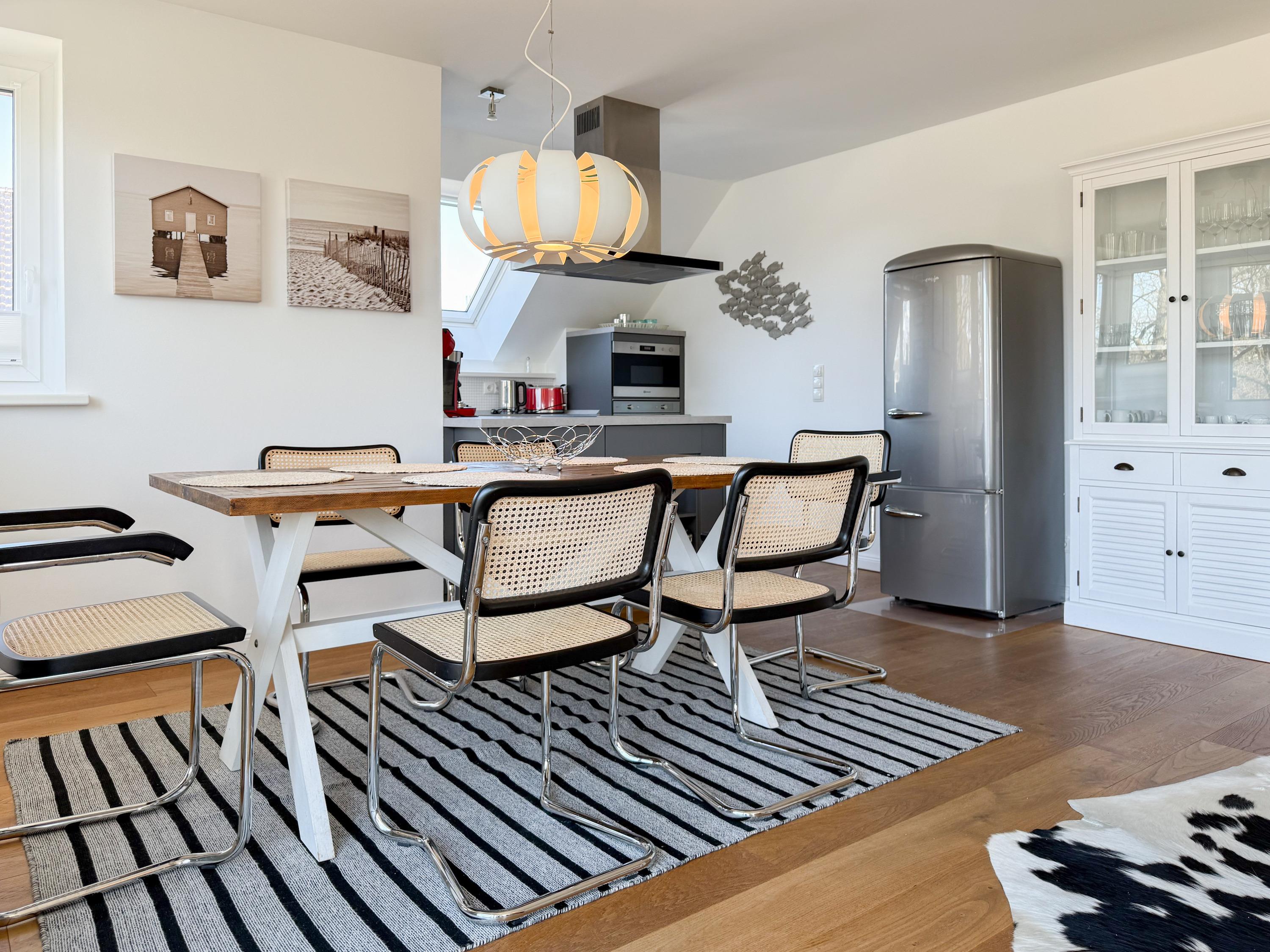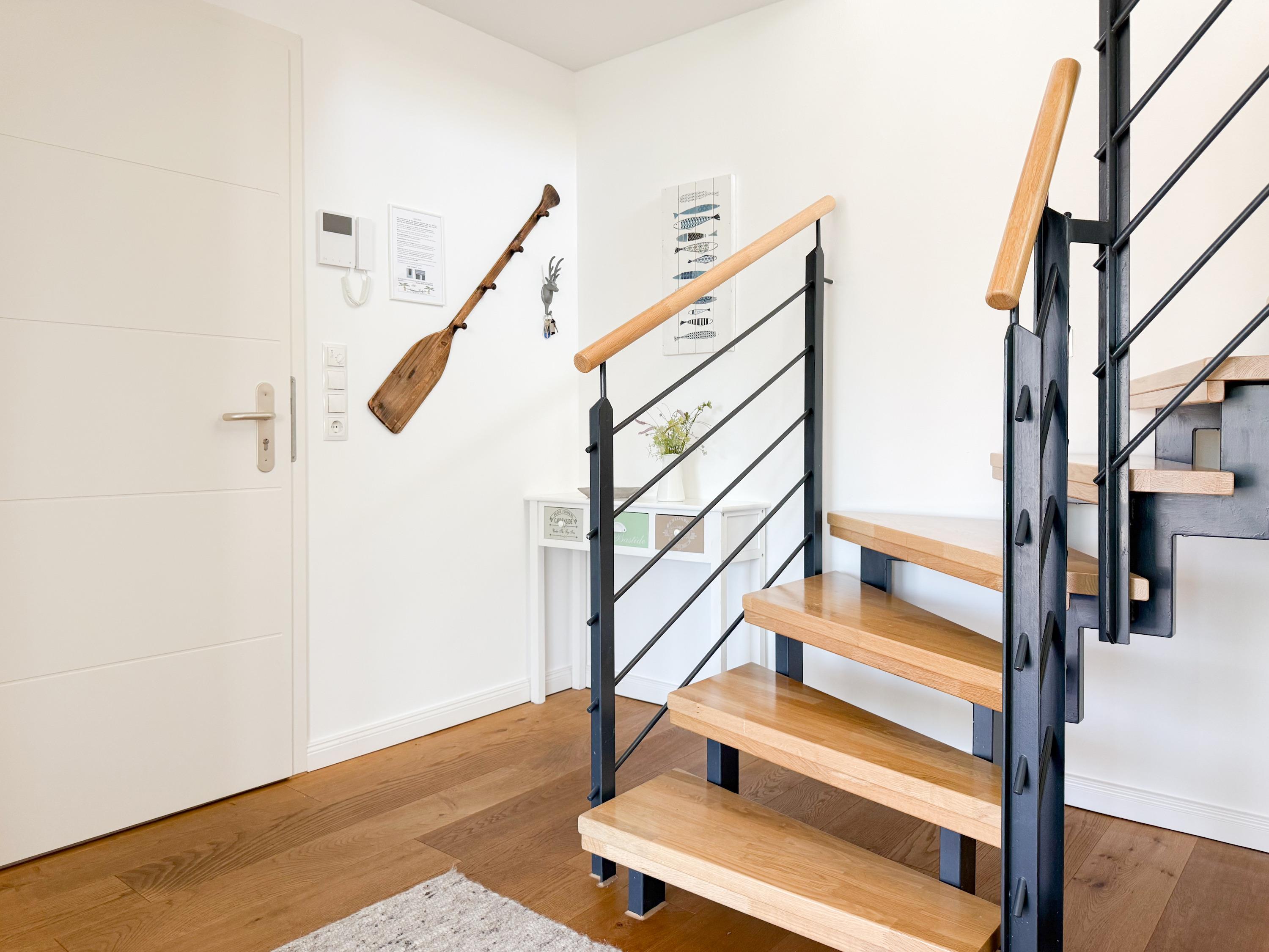 Das Penthouse ist hochwertig eingerichtet und bestens ausgestattet. Große, bodentiefe Fensterflächen durchfluten die Räumlichkeiten mit Tageslicht und sorgen für ein angenehmes Wohlfühlambiente – ideal für einen entspannten Ostseeurlaub. Ein besonderes Highlight ist die großzügige, über 50 m² große Dachterrasse in Südwestausrichtung. Hier lassen sich die frische Meeresluft und den Hafenblick genießen – ob auf den Sonnenliegen, an den Gartenmöbeln oder im Schatten der elektrischen Markise. Der offene Wohn- und Essbereich bietet viel Platz für gesellige Stunden. Ein Kaminofen (Holz nicht inklusive) sorgt für eine gemütliche Atmosphäre, und die moderne Einbauküche mit Kochinsel ist mit allen wichtigen Geräten ausgestattet – perfekt für alle, die gerne gemeinsam kochen. Auf der unteren Wohnebene befindet sich eines der beiden stilvollen Bäder mit Dusche und Waschtisch sowie eine Sauna mit Blick ins Grüne. Die obere Ebene beherbergt zwei separate Schlafzimmer mit Doppelbetten (180x200 und 140x200 plus Schlafsessel), Verdunkelungsvorhängen und TV. Das kleine Schlafzimmer punktet mit einem tollen Blick auf den Hafen. Ein weiteres Badezimmer mit Badewanne rundet den Komfort ab. Das Penthouse bietet auf über 100 m² einen herrlichen Rückzugsort für 2-4 Personen mit der ganz besonderen Atmosphäre des Hafens.
