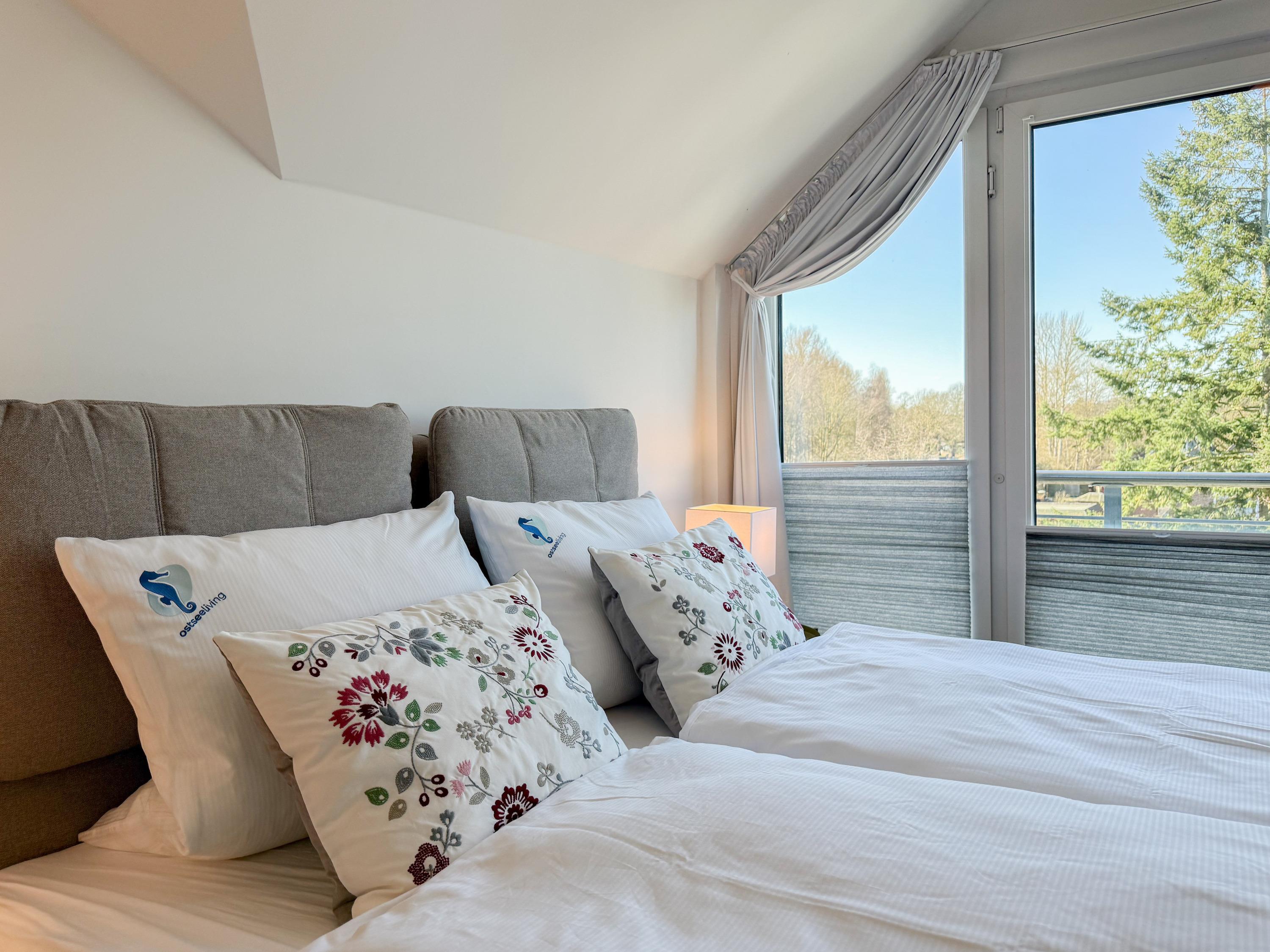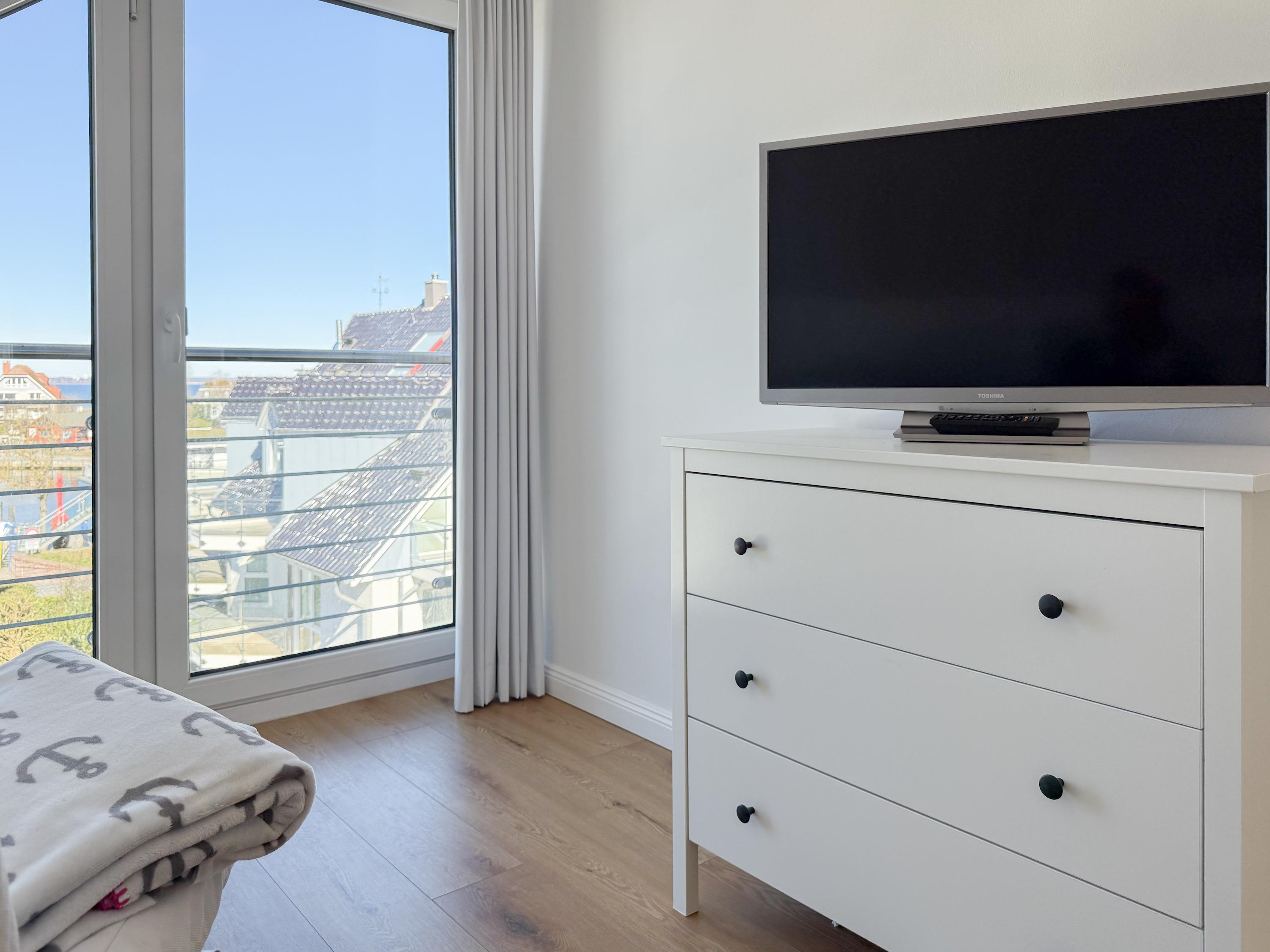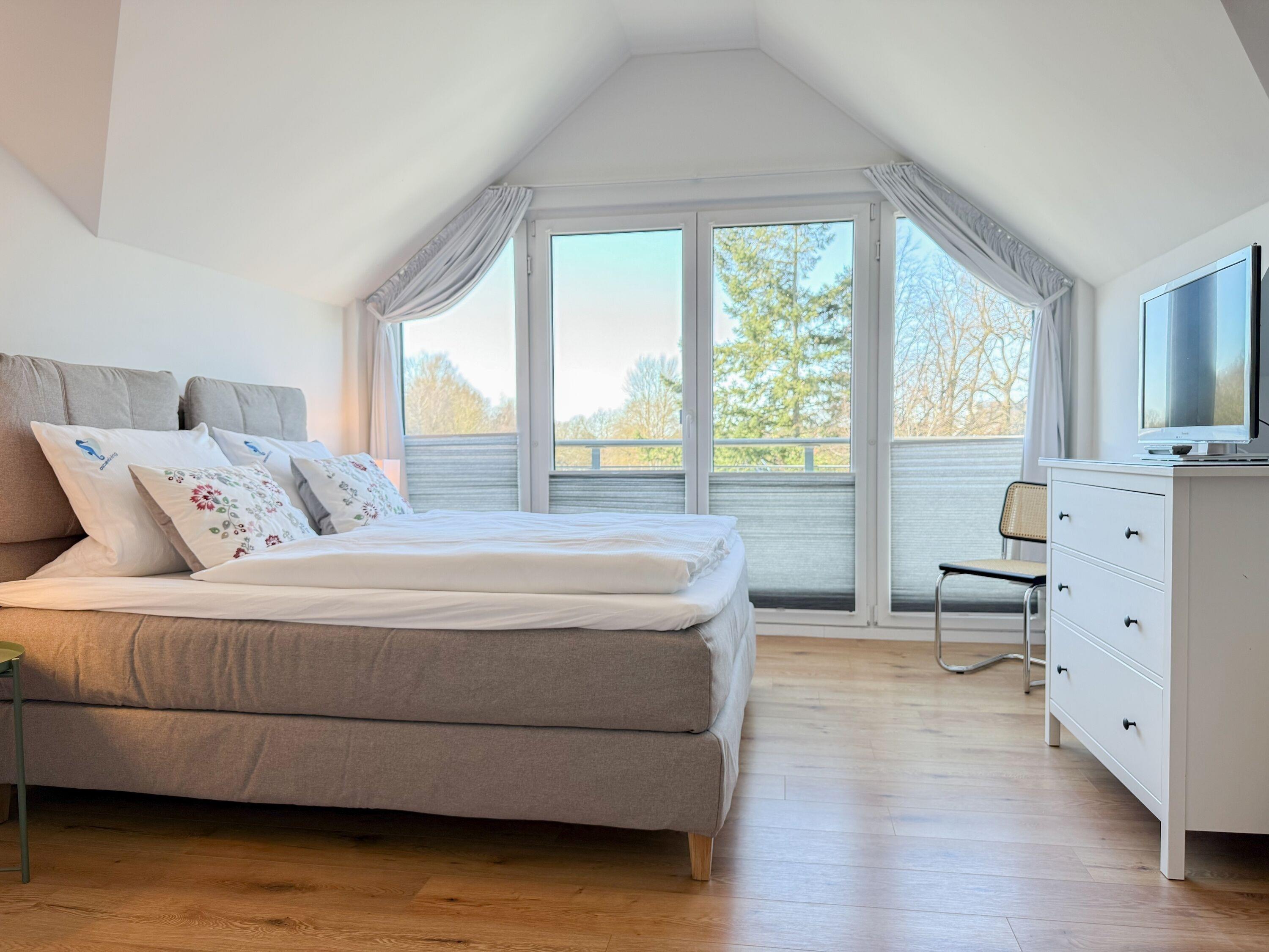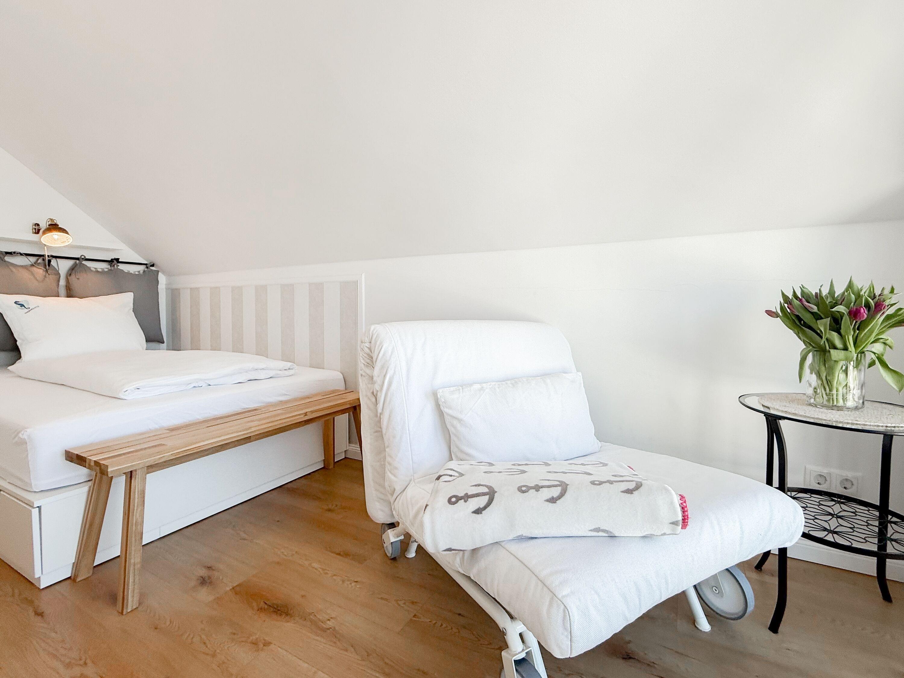 Das Penthouse ist hochwertig eingerichtet und bestens ausgestattet. Große, bodentiefe Fensterflächen durchfluten die Räumlichkeiten mit Tageslicht und sorgen für ein angenehmes Wohlfühlambiente – ideal für einen entspannten Ostseeurlaub. Ein besonderes Highlight ist die großzügige, über 50 m² große Dachterrasse in Südwestausrichtung. Hier lassen sich die frische Meeresluft und den Hafenblick genießen – ob auf den Sonnenliegen, an den Gartenmöbeln oder im Schatten der elektrischen Markise. Der offene Wohn- und Essbereich bietet viel Platz für gesellige Stunden. Ein Kaminofen (Holz nicht inklusive) sorgt für eine gemütliche Atmosphäre, und die moderne Einbauküche mit Kochinsel ist mit allen wichtigen Geräten ausgestattet – perfekt für alle, die gerne gemeinsam kochen. Auf der unteren Wohnebene befindet sich eines der beiden stilvollen Bäder mit Dusche und Waschtisch sowie eine Sauna mit Blick ins Grüne. Die obere Ebene beherbergt zwei separate Schlafzimmer mit Doppelbetten (180x200 und 140x200 plus Schlafsessel), Verdunkelungsvorhängen und TV. Das kleine Schlafzimmer punktet mit einem tollen Blick auf den Hafen. Ein weiteres Badezimmer mit Badewanne rundet den Komfort ab. Das Penthouse bietet auf über 100 m² einen herrlichen Rückzugsort für 2-4 Personen mit der ganz besonderen Atmosphäre des Hafens.