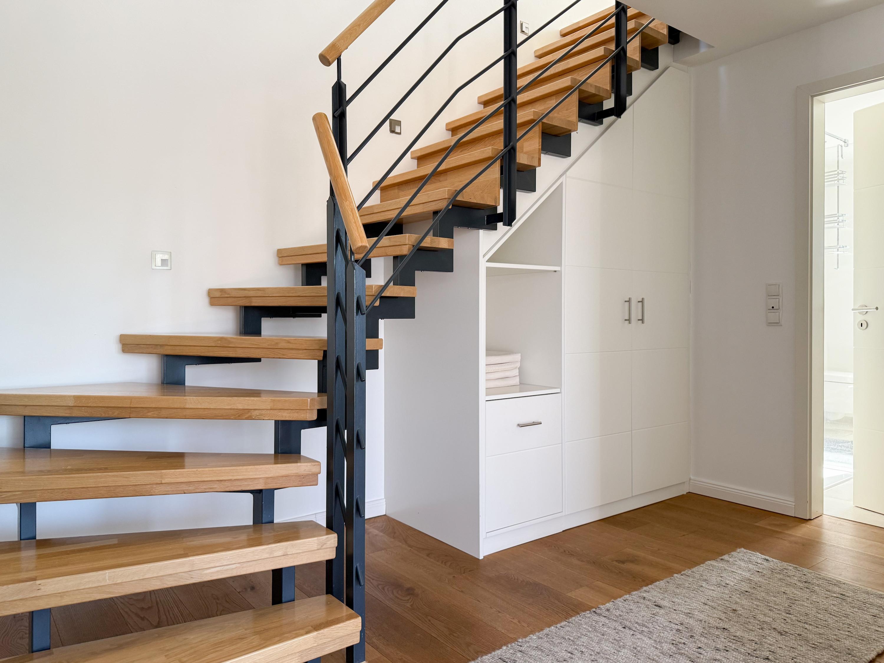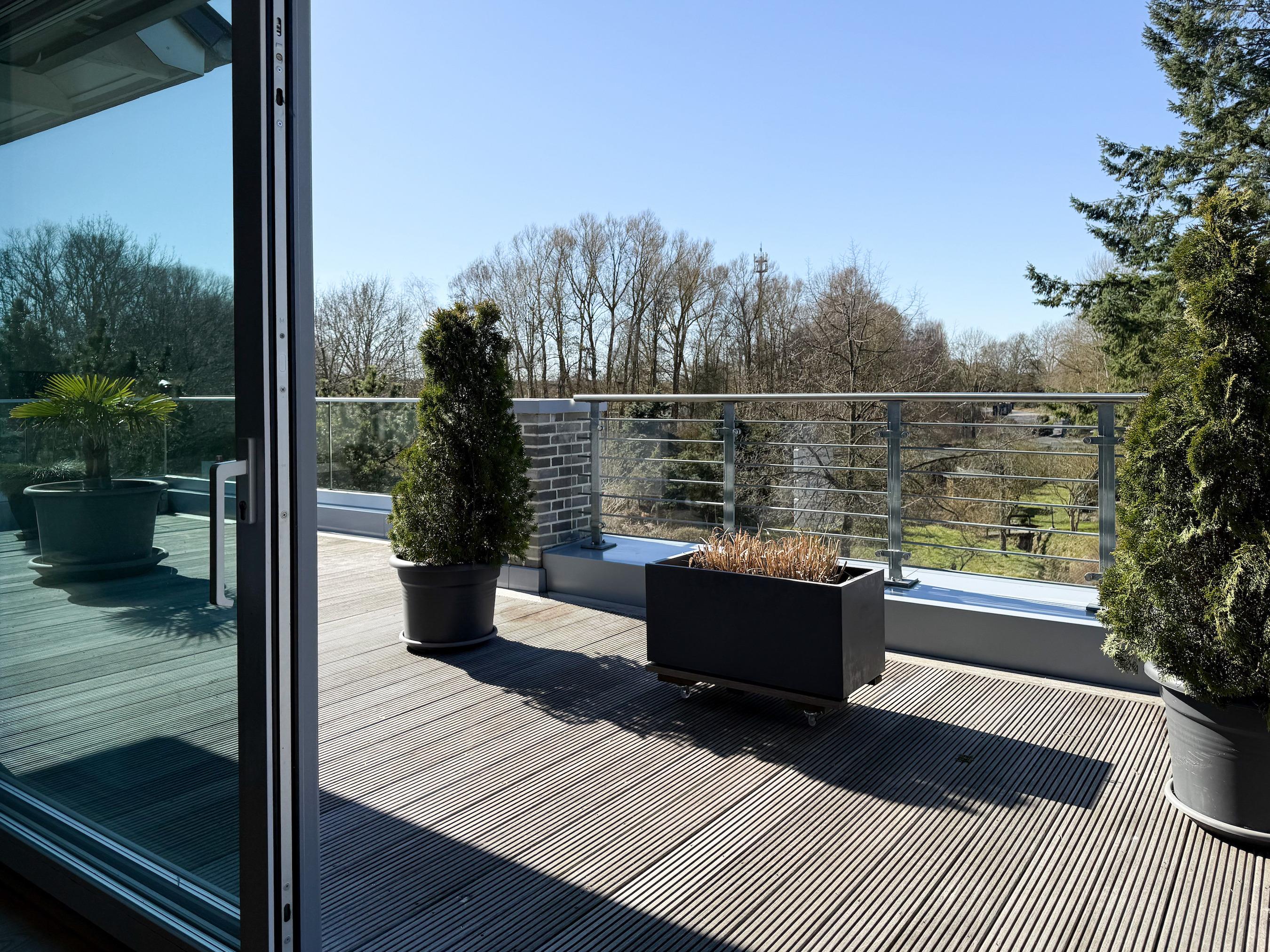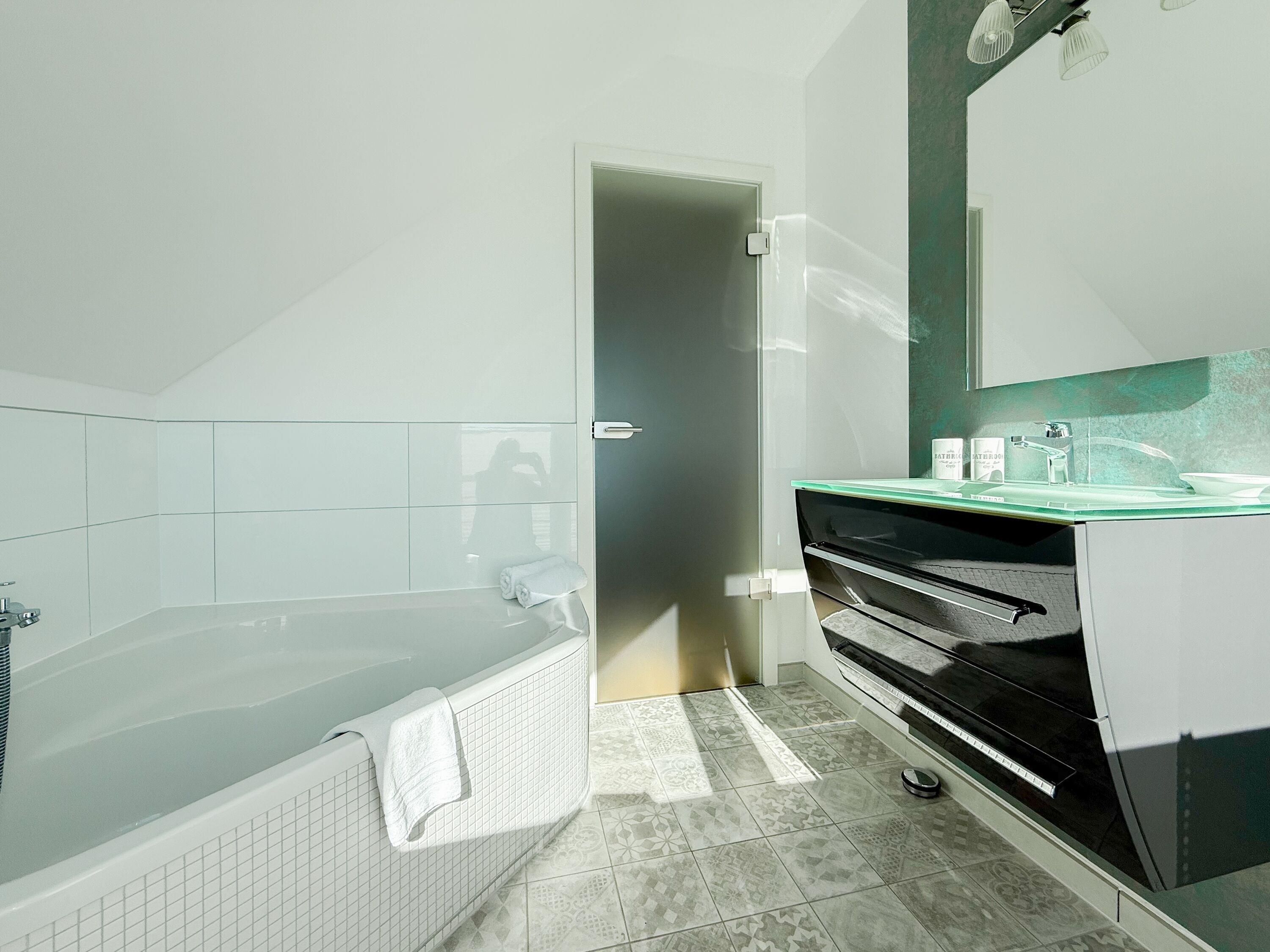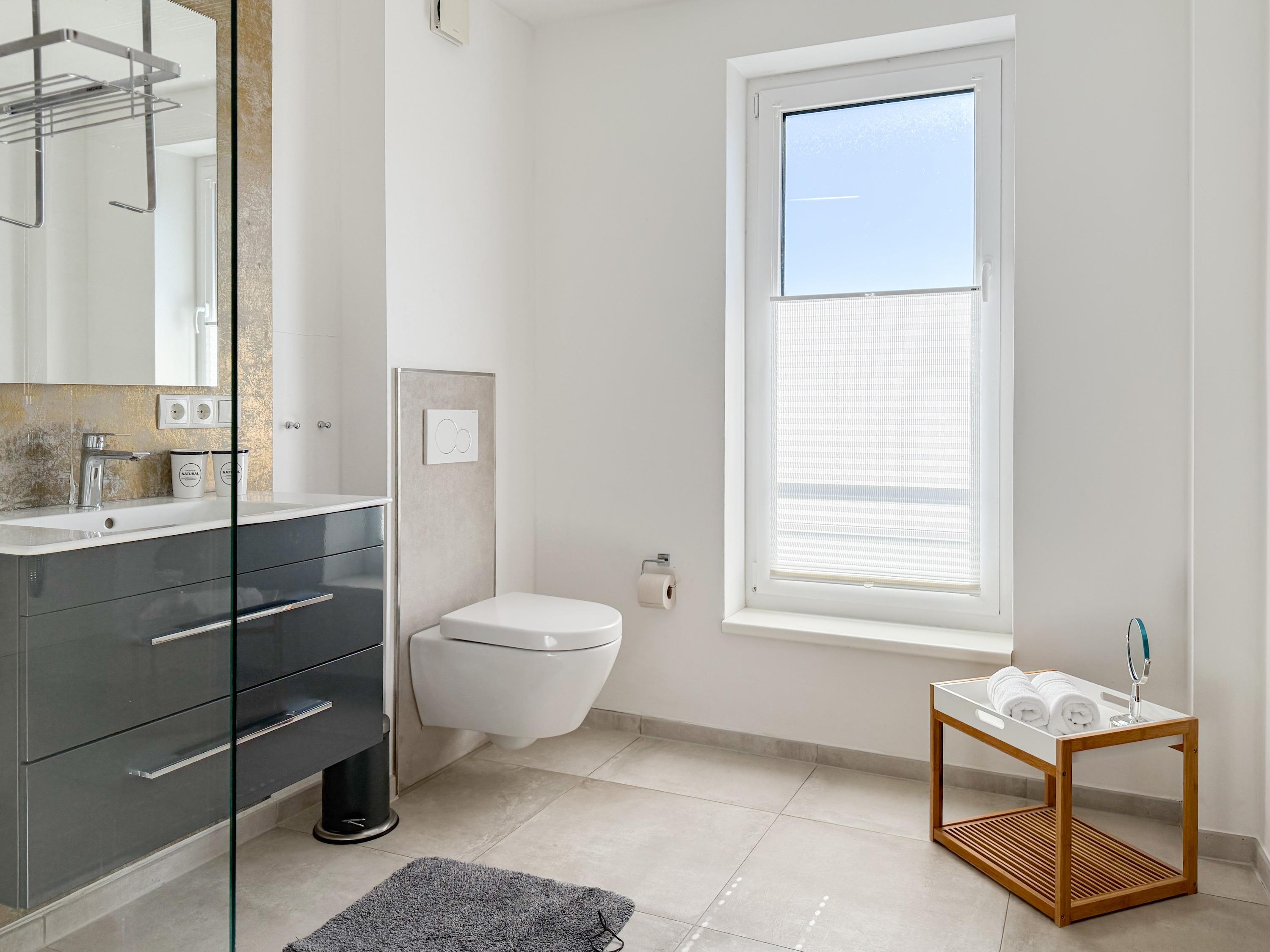 Das Penthouse ist hochwertig eingerichtet und bestens ausgestattet. Große, bodentiefe Fensterflächen durchfluten die Räumlichkeiten mit Tageslicht und sorgen für ein angenehmes Wohlfühlambiente – ideal für einen entspannten Ostseeurlaub. Ein besonderes Highlight ist die großzügige, über 50 m² große Dachterrasse in Südwestausrichtung. Hier lassen sich die frische Meeresluft und den Hafenblick genießen – ob auf den Sonnenliegen, an den Gartenmöbeln oder im Schatten der elektrischen Markise. Der offene Wohn- und Essbereich bietet viel Platz für gesellige Stunden. Ein Kaminofen (Holz nicht inklusive) sorgt für eine gemütliche Atmosphäre, und die moderne Einbauküche mit Kochinsel ist mit allen wichtigen Geräten ausgestattet – perfekt für alle, die gerne gemeinsam kochen. Auf der unteren Wohnebene befindet sich eines der beiden stilvollen Bäder mit Dusche und Waschtisch sowie eine Sauna mit Blick ins Grüne. Die obere Ebene beherbergt zwei separate Schlafzimmer mit Doppelbetten (180x200 und 140x200 plus Schlafsessel), Verdunkelungsvorhängen und TV. Das kleine Schlafzimmer punktet mit einem tollen Blick auf den Hafen. Ein weiteres Badezimmer mit Badewanne rundet den Komfort ab. Das Penthouse bietet auf über 100 m² einen herrlichen Rückzugsort für 2-4 Personen mit der ganz besonderen Atmosphäre des Hafens.