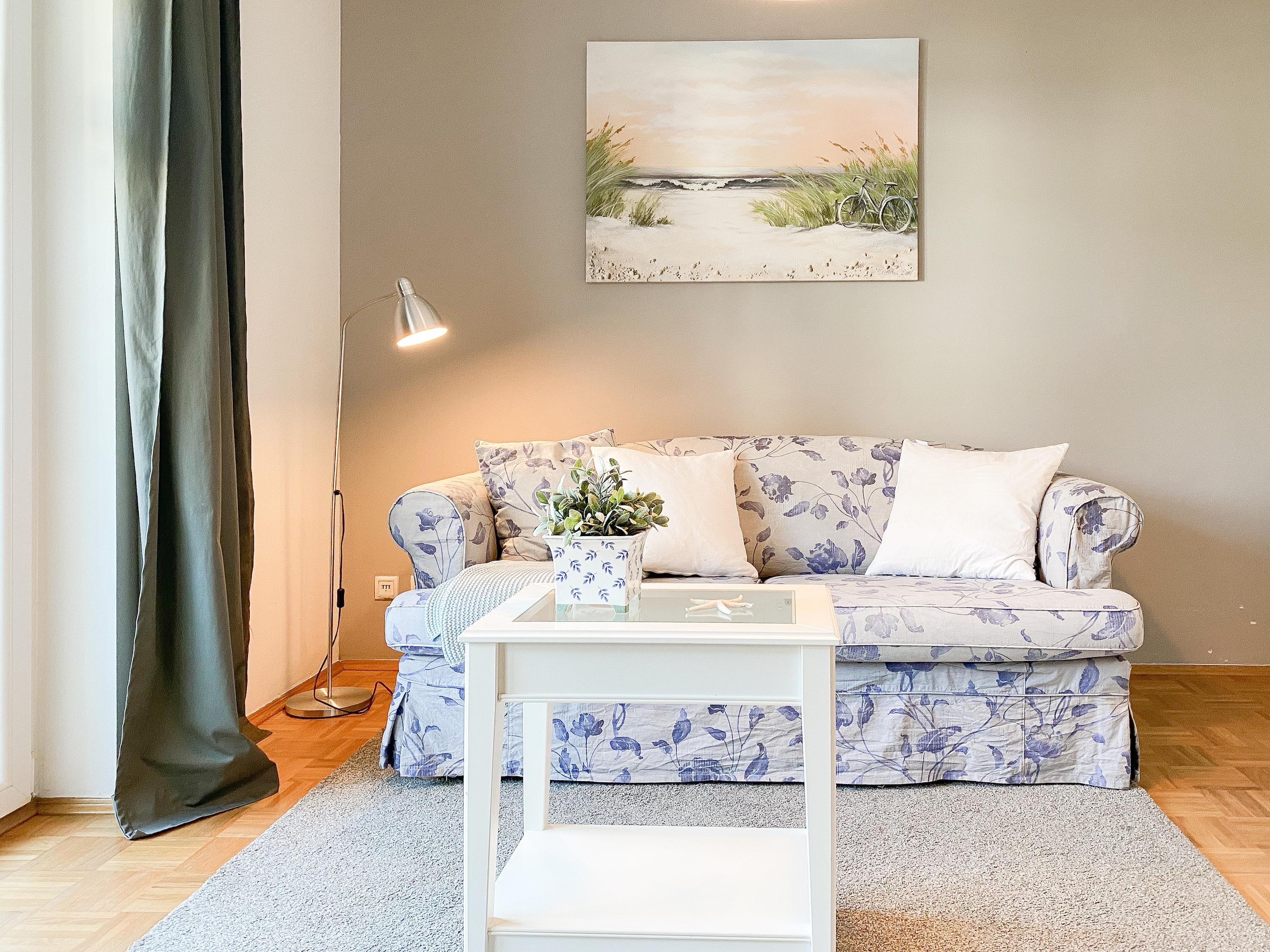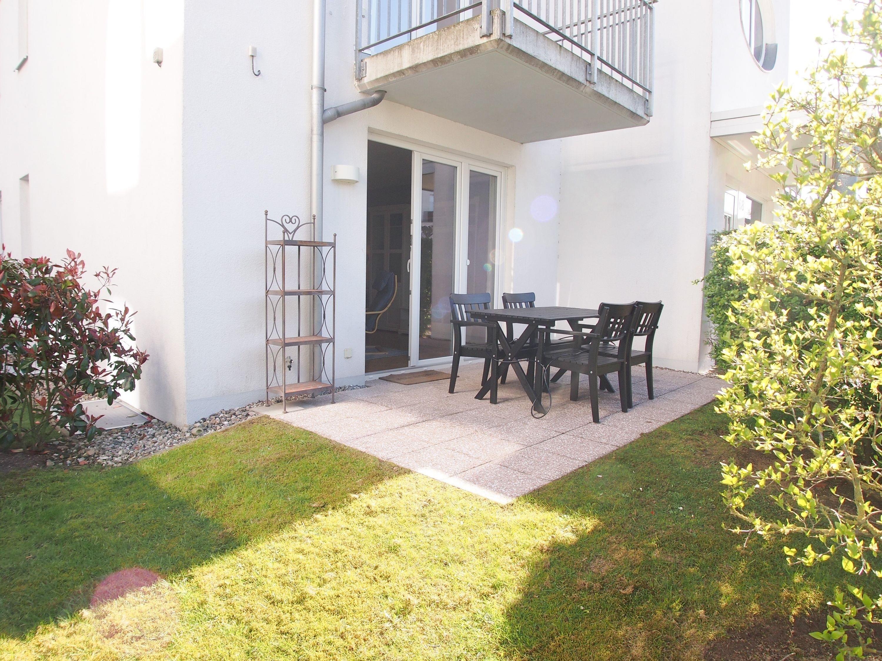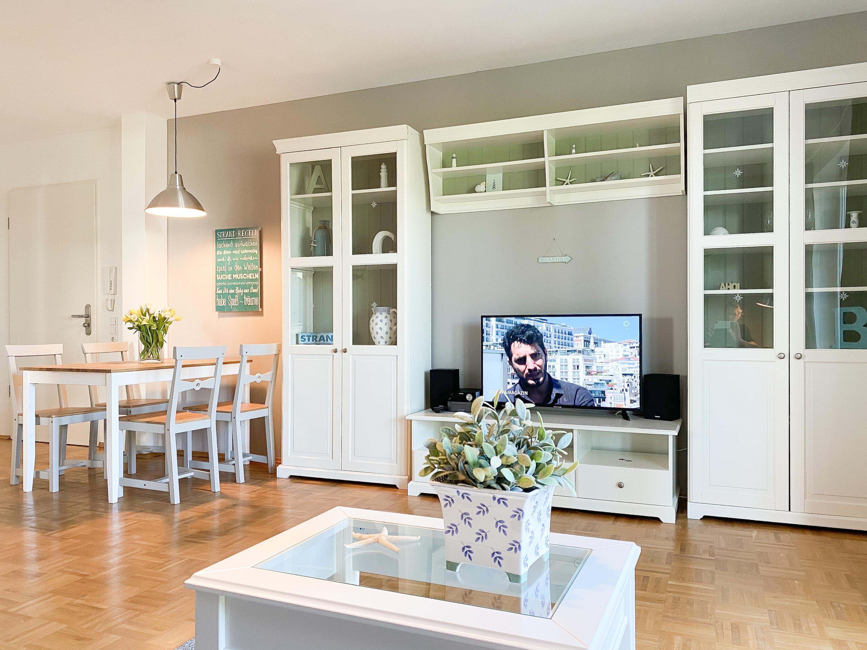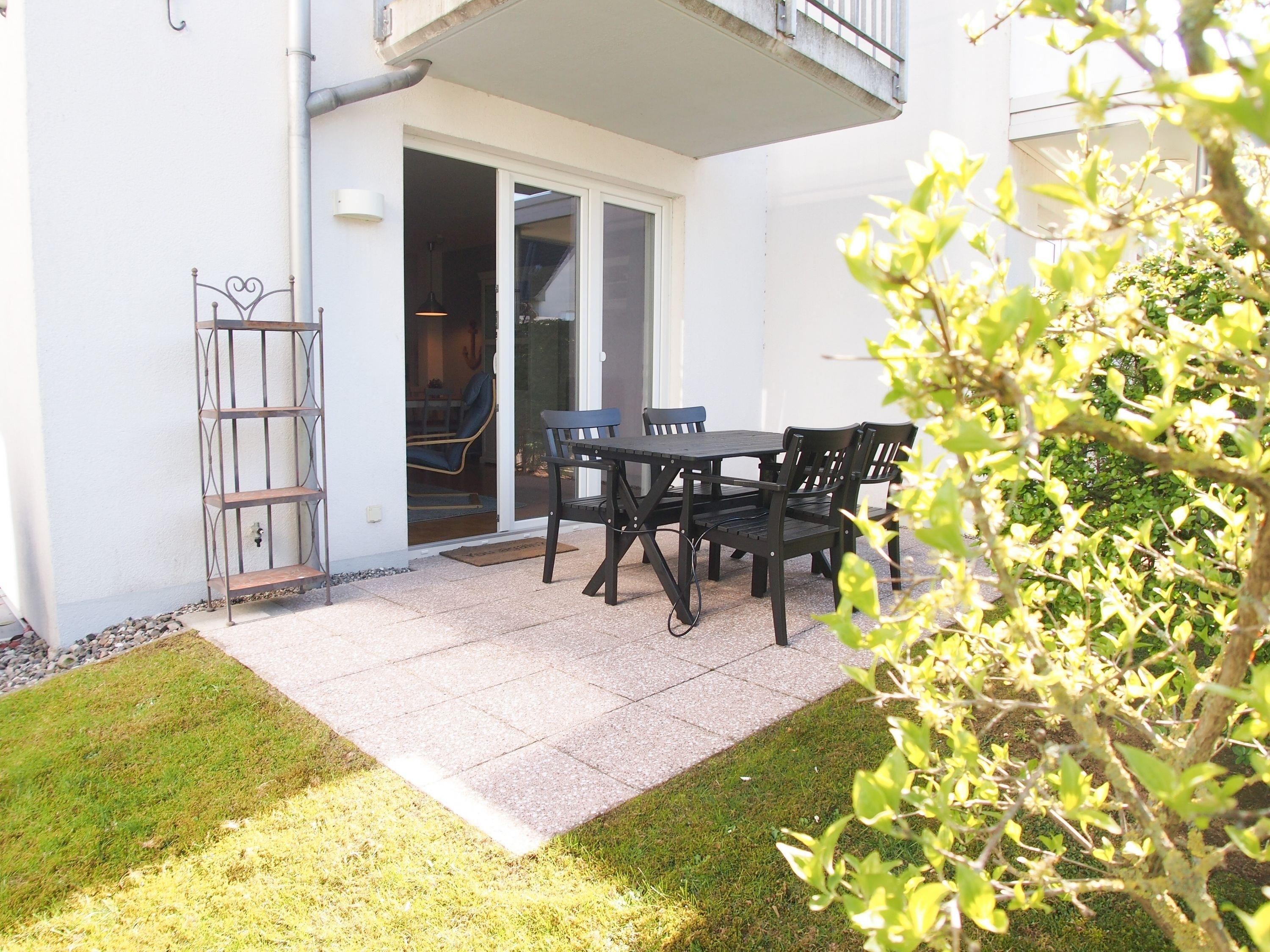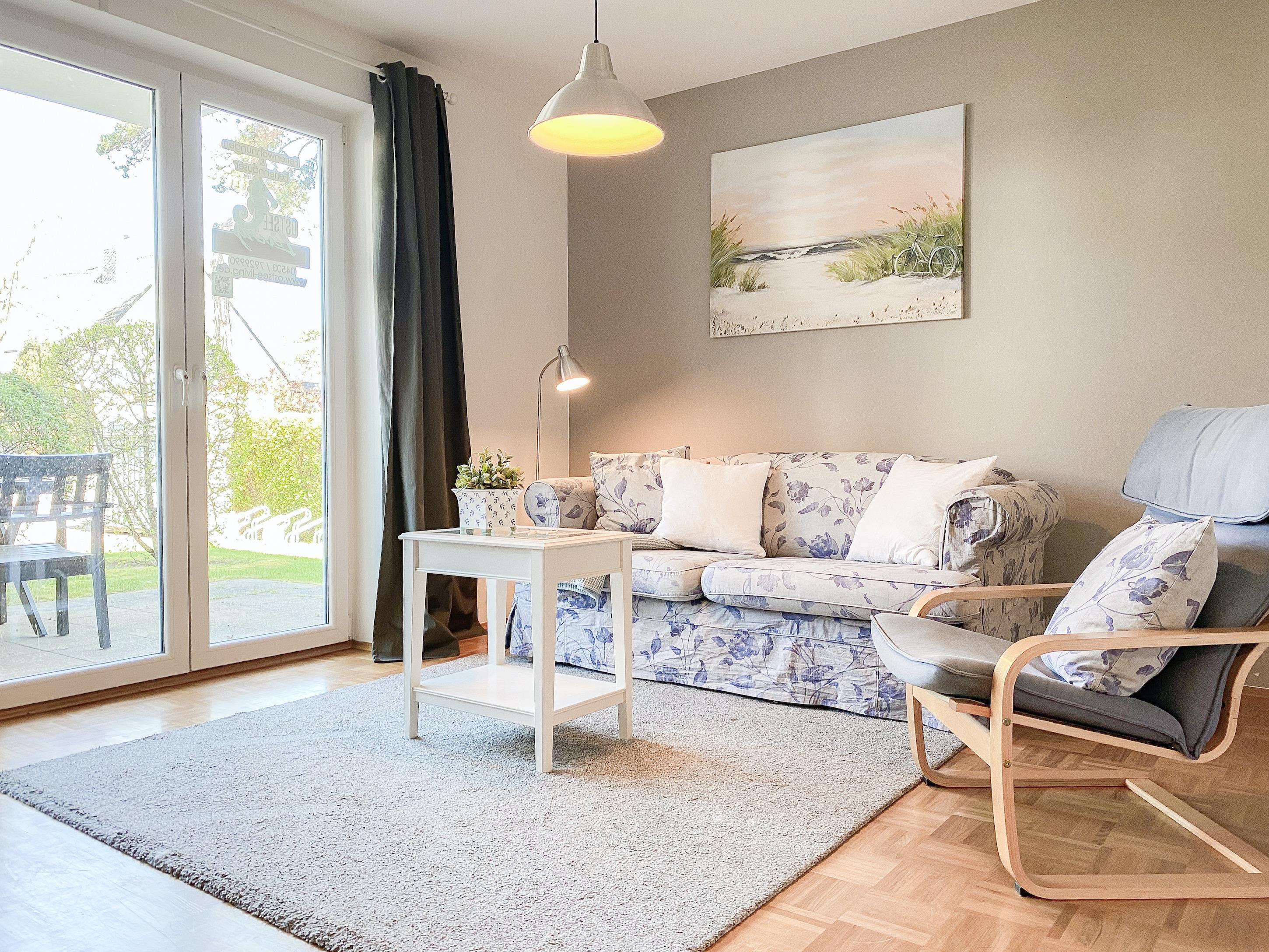 Der großzügige Wohnbereich ist mit einem Sofa mit Schlaffunktion (140x190), einem Relax-Sessel, Musikanlage und TV eingerichtet. Kostenloser Internetzugang steht über WLAN[nbsp] zur Verfügung. Die angrenzende Terrasse ist mit[nbsp] Gartentisch und Stühlen möbliert. Die bestens ausgestattete Einbauküche mit Küchentresen und Barhockern ist der Mittelpunkt der charmanten Wohnung. Der gemütliche Essbereich bietet ausreichend Platz für 4 Personen. Im separatem Schlafzimmer befindet sich ein Doppelbett (180x200), ein Kleiderschrank mit viel Staufläche sowie ein weiterer TV. Die Fenster lassen sich durch Vorhänge verdunkeln. Das moderne, großzügige Bad mit ist sowohl mit einer bodentiefen Walk-In Dusche als auch einer Badewanne ausgestattet. Waschmaschine und Trockner (Münzgeräte) sind vorhanden und stehen zur gemeinschaftlichen Nutzung zur Verfügung.