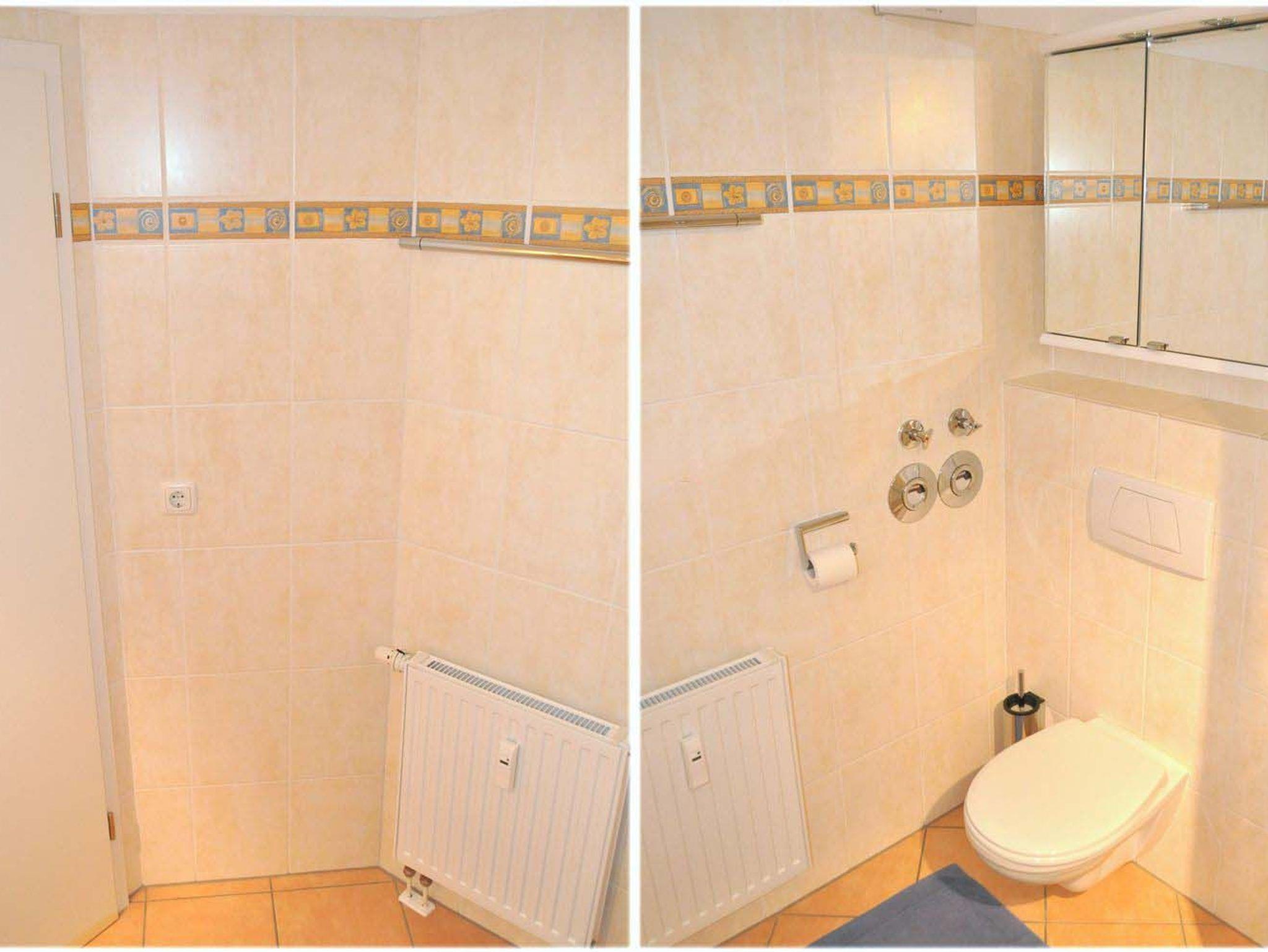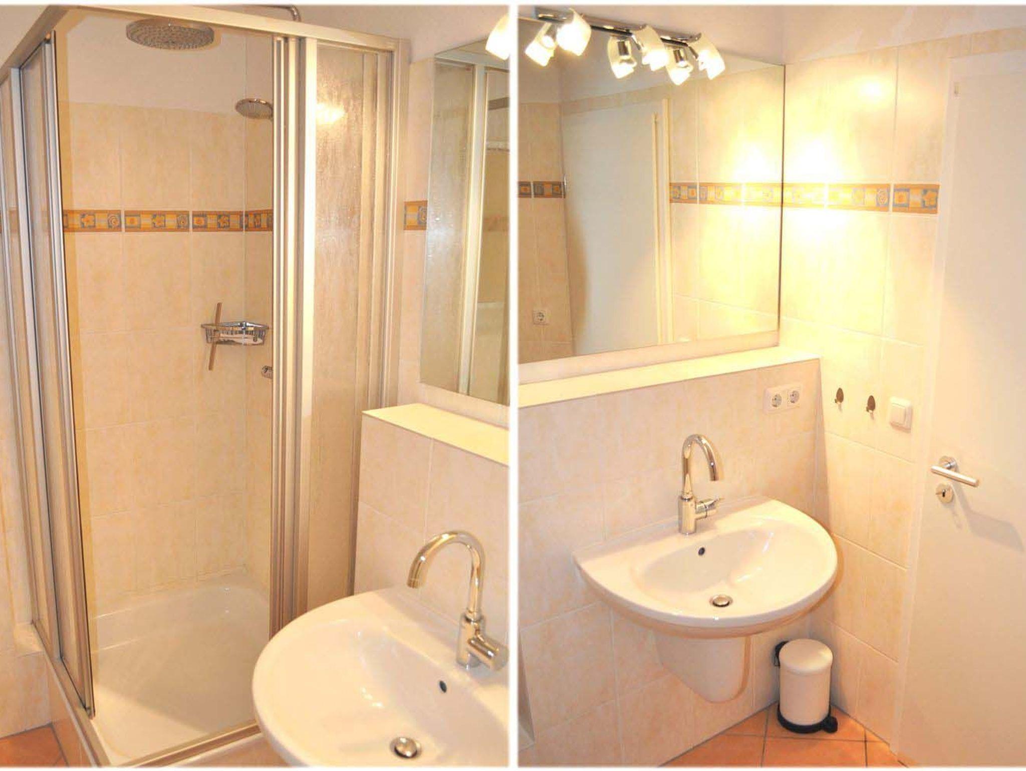 Bad 1: Duschkabine, Regendusche, Spiegel, Spiegelschrank, Waschbecken, WC