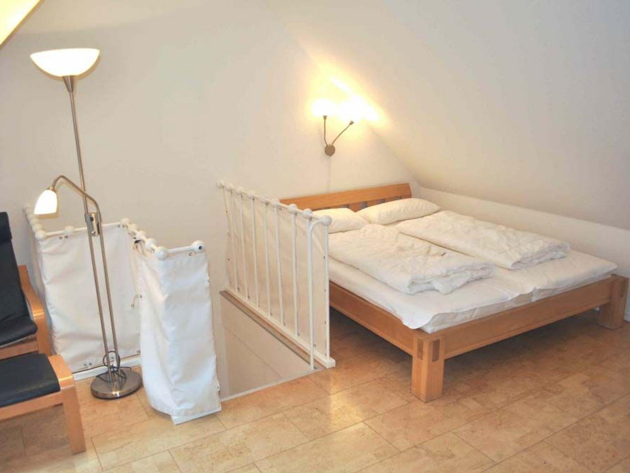 Schlafzimmer 2: Anrichte, Beistelltisch, Doppelbett 2,00 x 1,60 m, Flachbildschirm, Hocker, Kabel-TV, Kindersicherung am Geländer, Kleiderstange, Sessel, Stehlampe, Treppe nach unten, TV-Rolltisch