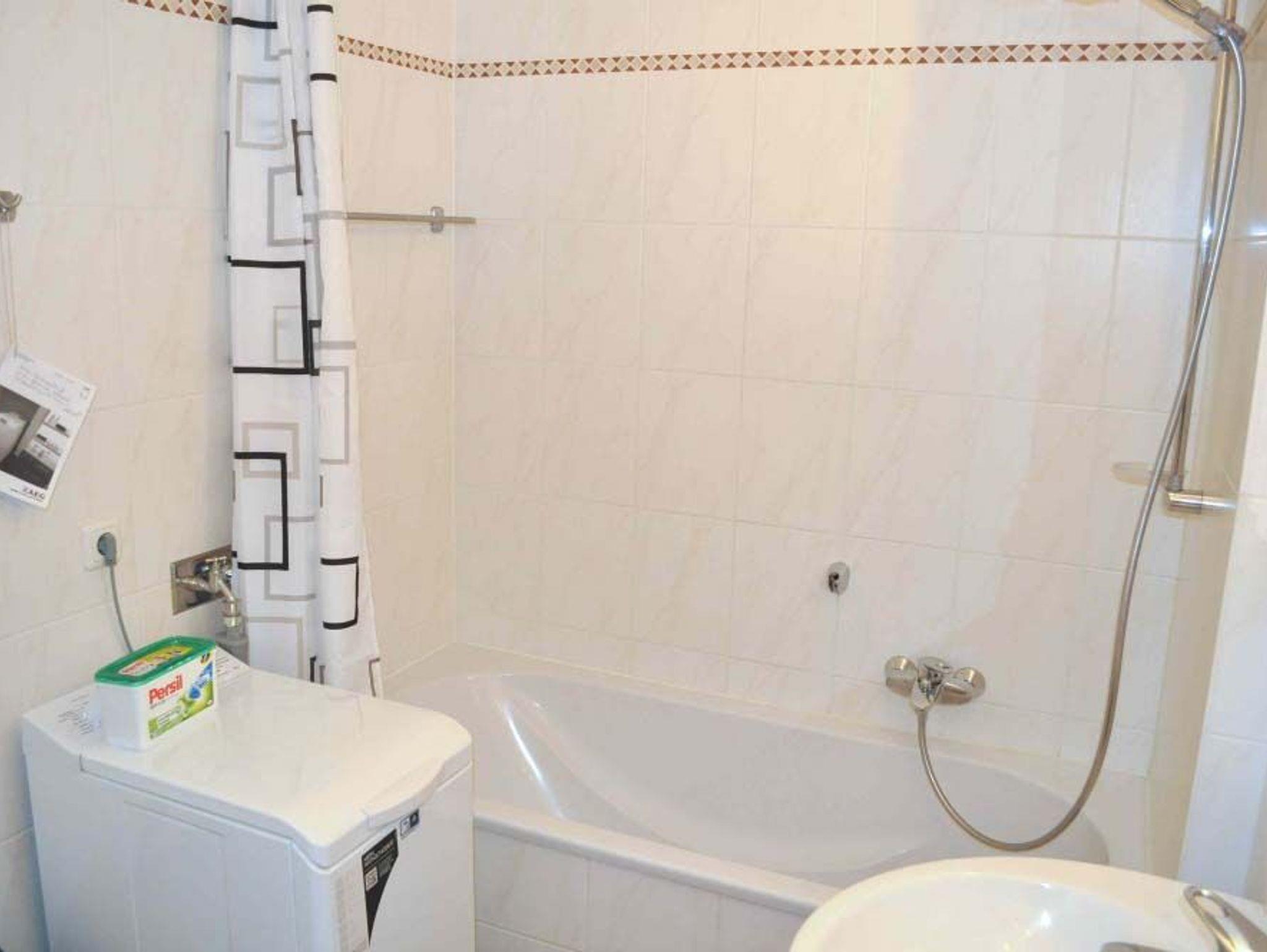 Bad 1: kleiner Schrank, Spiegel, Wanne, Waschbecken, Waschmaschine, WC