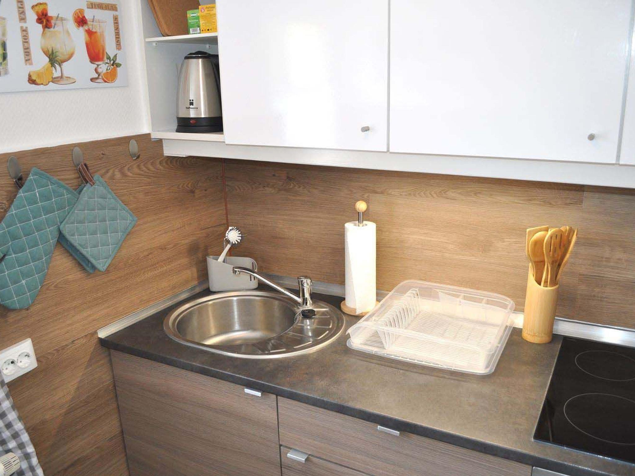 Küche: 4 Plattenherd mit Ceranfeld und Backofen, Einbauküche, Geschirr, Kaffeemaschine, Kochtöpfe, Toaster, Wasserkocher