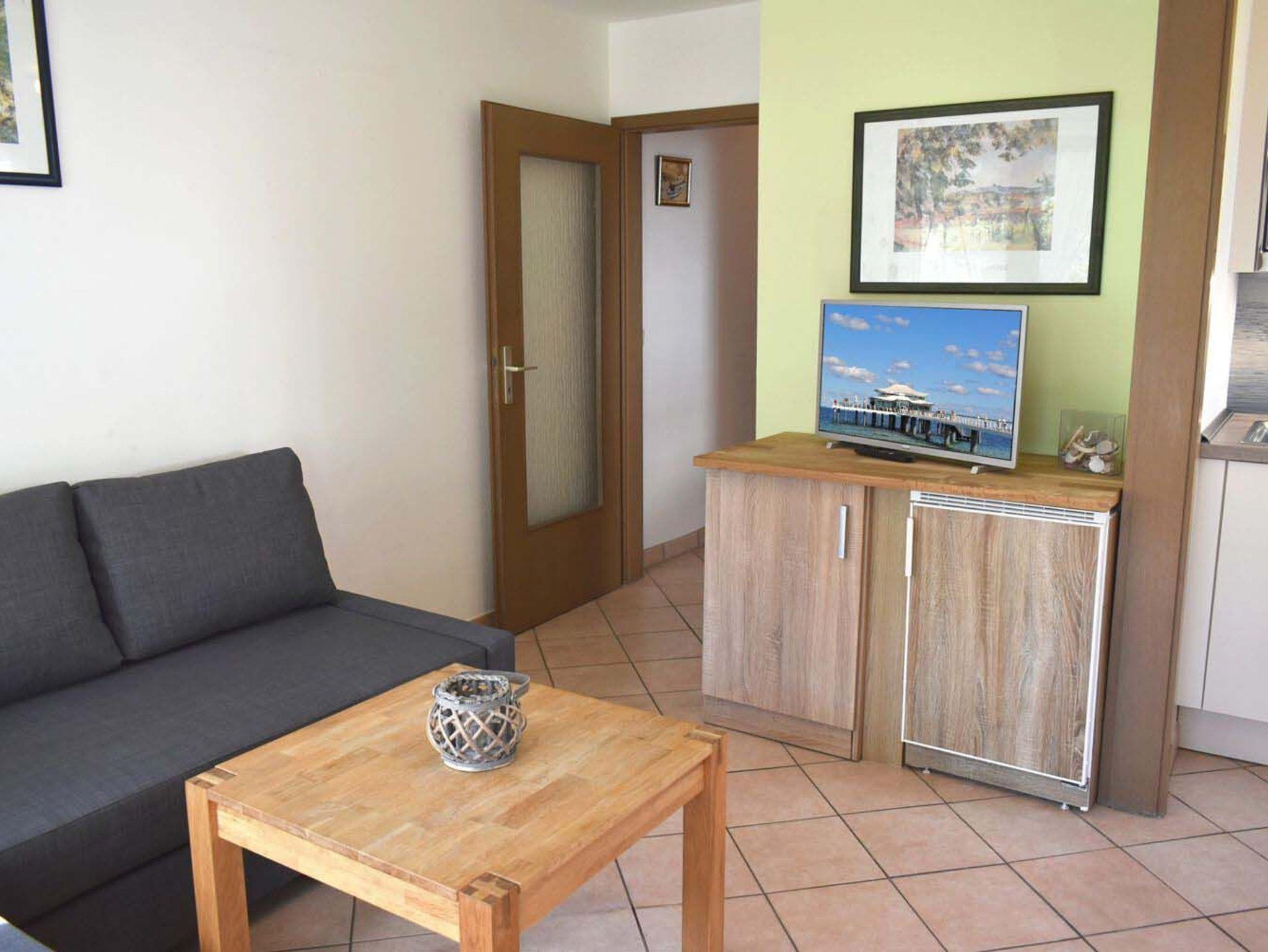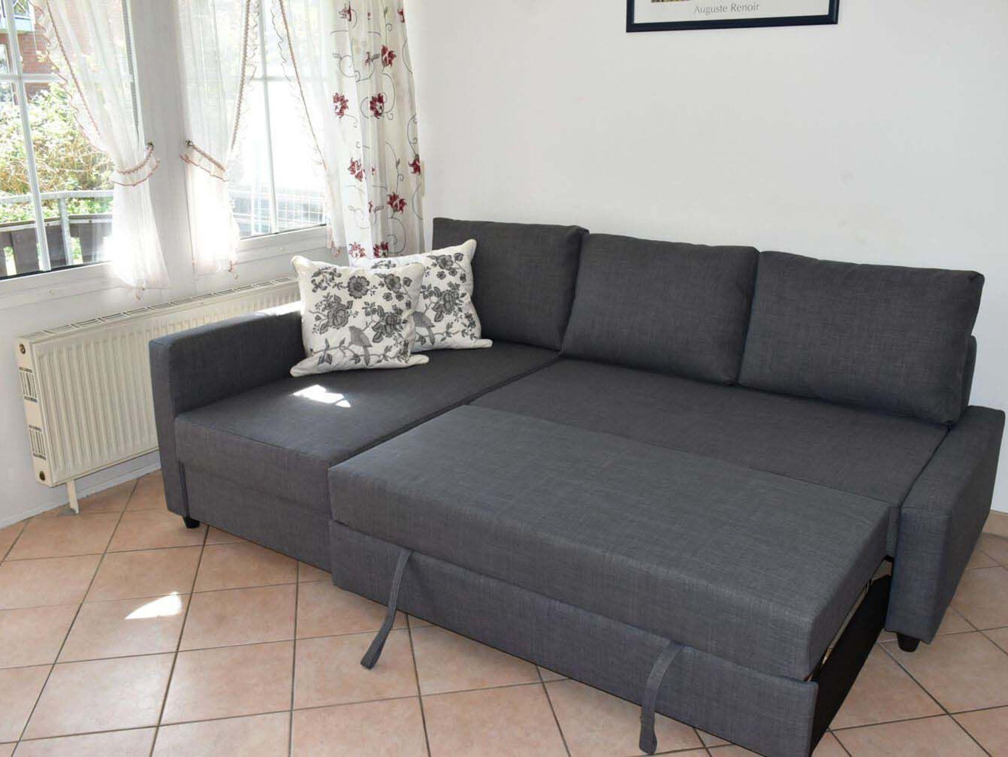 Wohnzimmer: 1 Schlafcouch 2,00 x 1,40 m, 2 Regale, 4 Stühle, Anrichte, Couchtisch, Esstisch, Kabel-TV, Kleiderschrank, Kofferradio, Staubsauger, Verdunklungsrollo