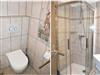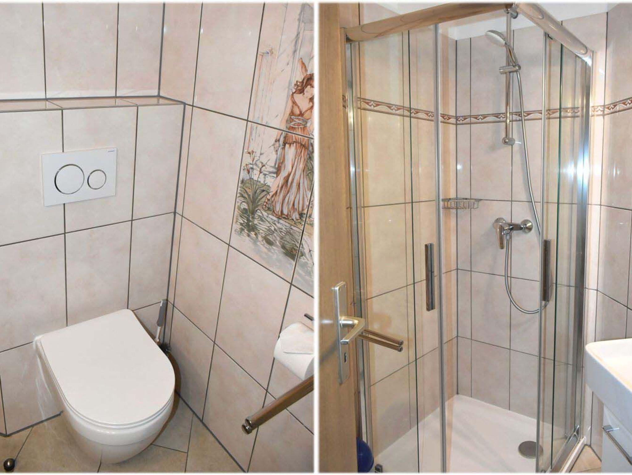 Bad 1: Dusche, Duschkabine, Handtuchhalter, Spiegel, Waschtisch mit Unterschrank, WC