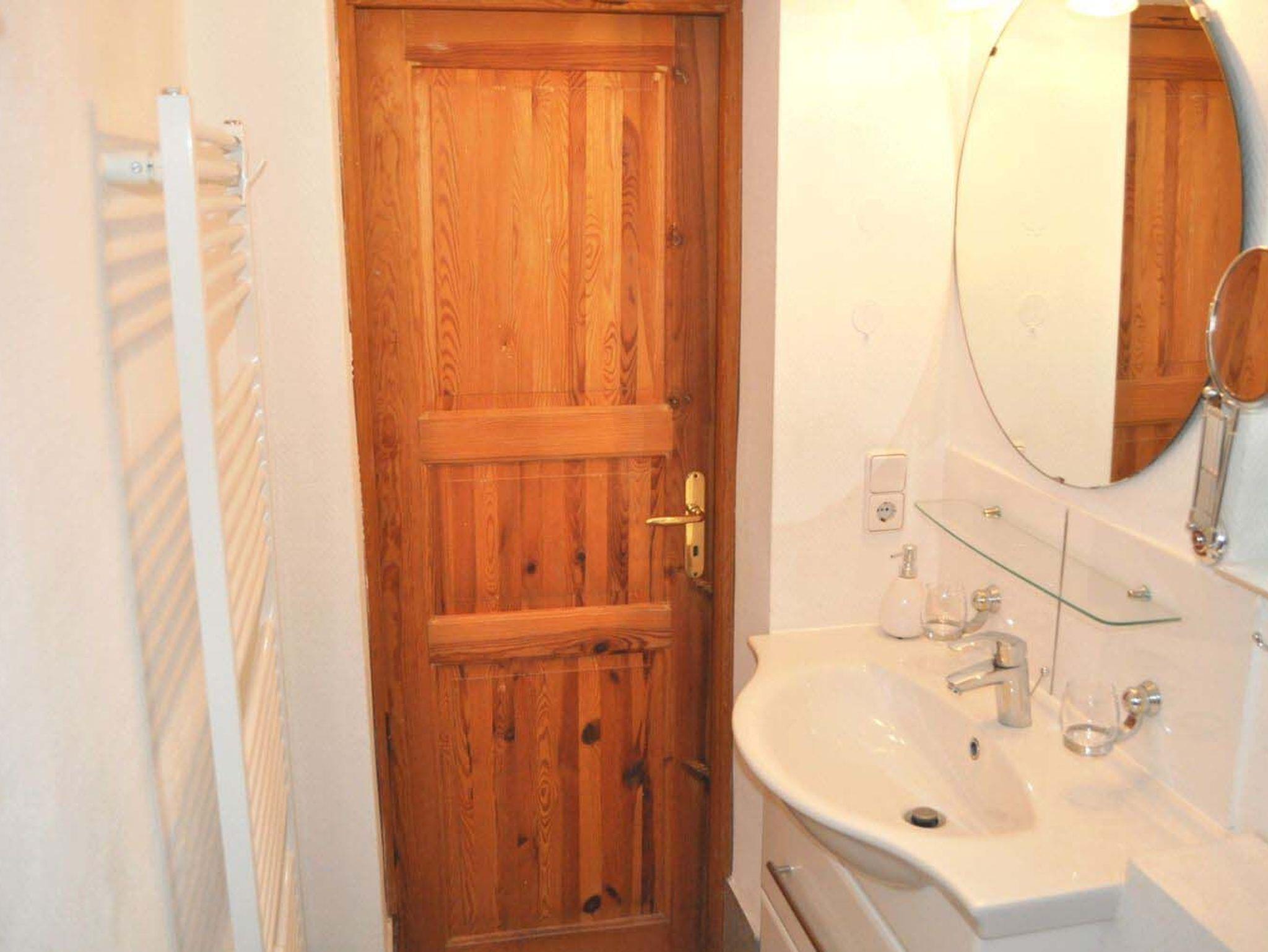 Bad 1: Dusche bodengleich, Duschkabine, Fön, Kosmetikspiegel, Spiegel, Waschtisch mit Unterschrank, WC