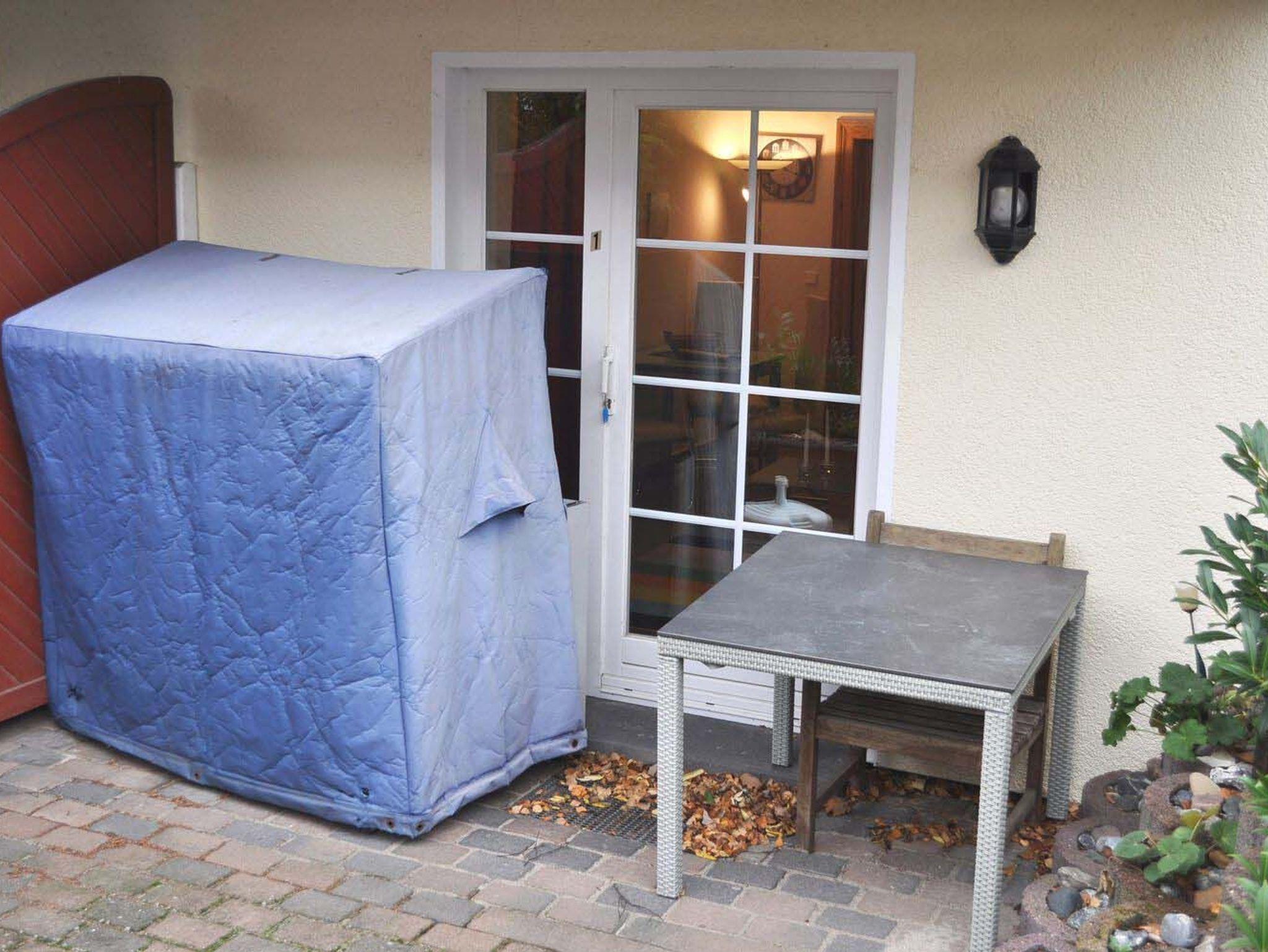 Terrasse: 3 Stühle, Nachmittagssonne, Sonnenschirm, Strandkorb, Tisch