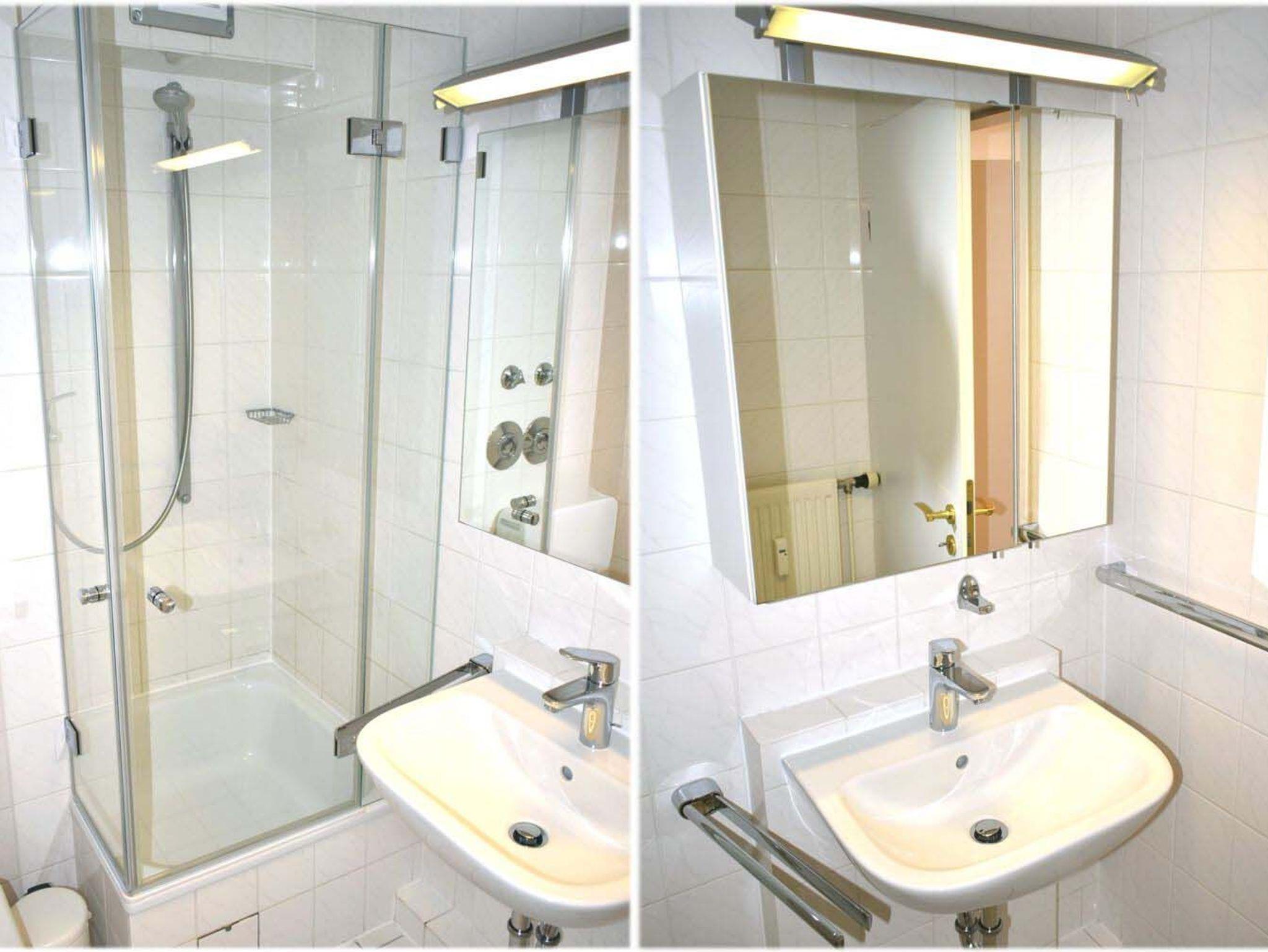 Bad 1: Dusche, Duschkabine, Fön, Spiegel, Waschbecken, WC