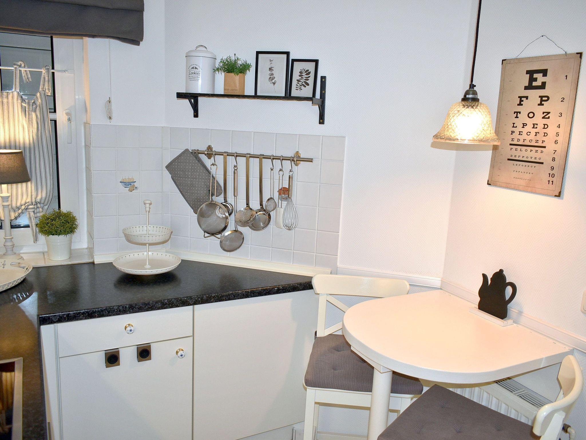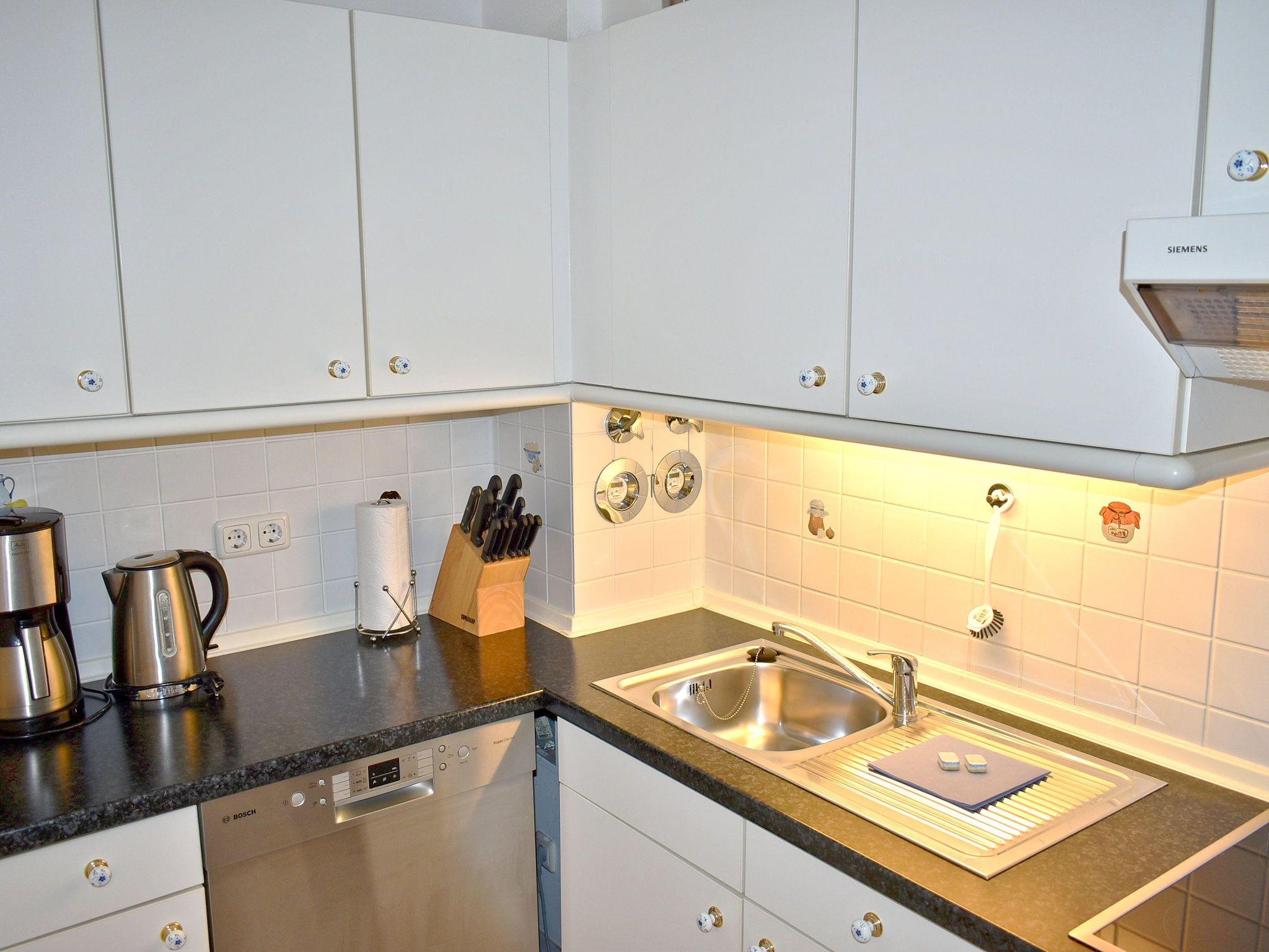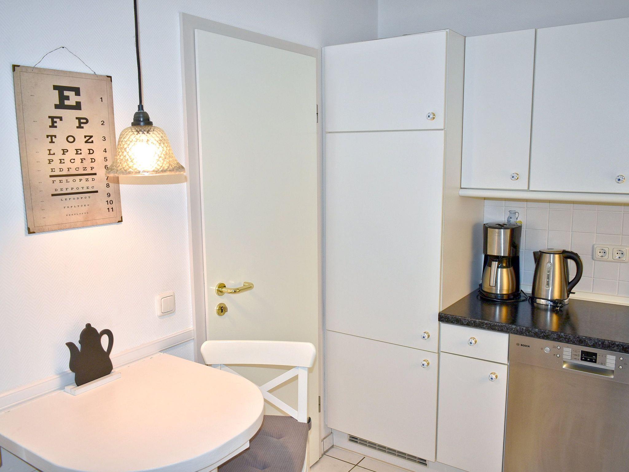 Küche: 2 Stühle, 4 Plattenherd mit Ceranfeld und Backofen, Einbauküche, Geschirr, Handmixer, Kaffeemaschine, Klapptisch, Kochtöpfe, Kühlschrank mit 3* Gefrierfach, Mikrowelle, Radio, Spülmaschine, Toaster, Wasserkocher