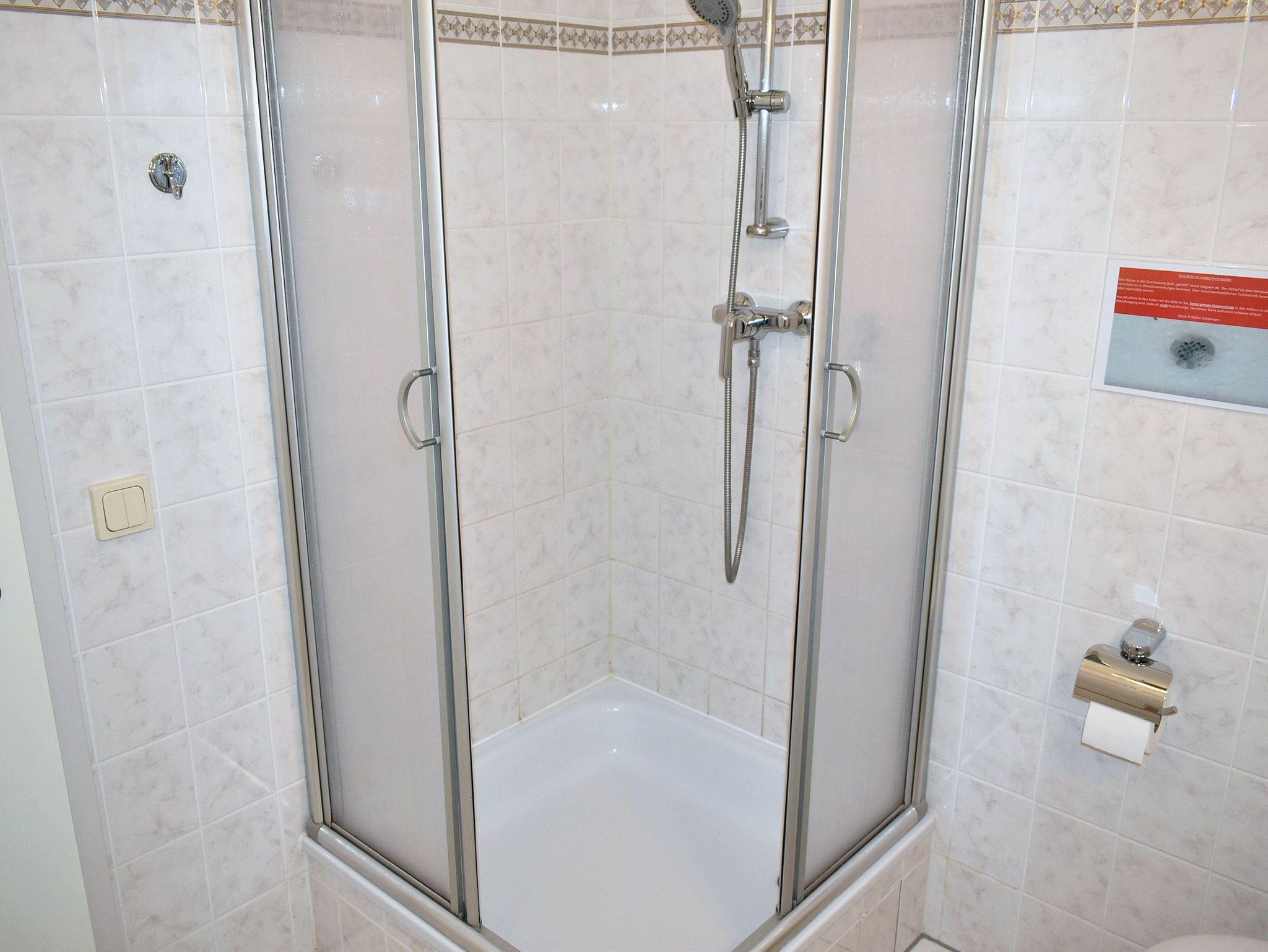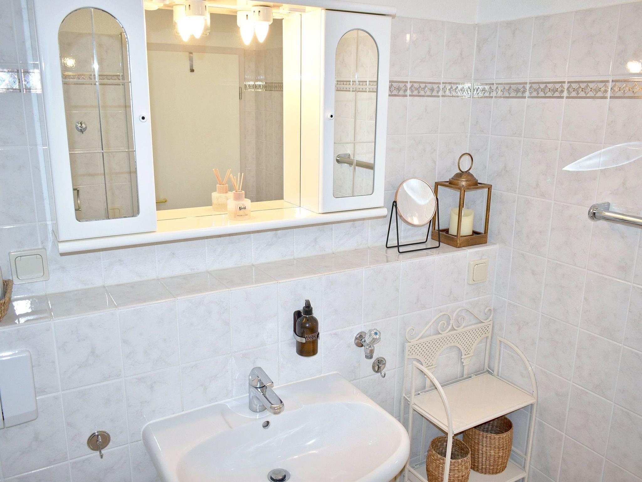 Bad 1: Dusche, Duschkabine, Fön, Kosmetikspiegel, Regal, Spiegelschrank, Waschbecken, WC