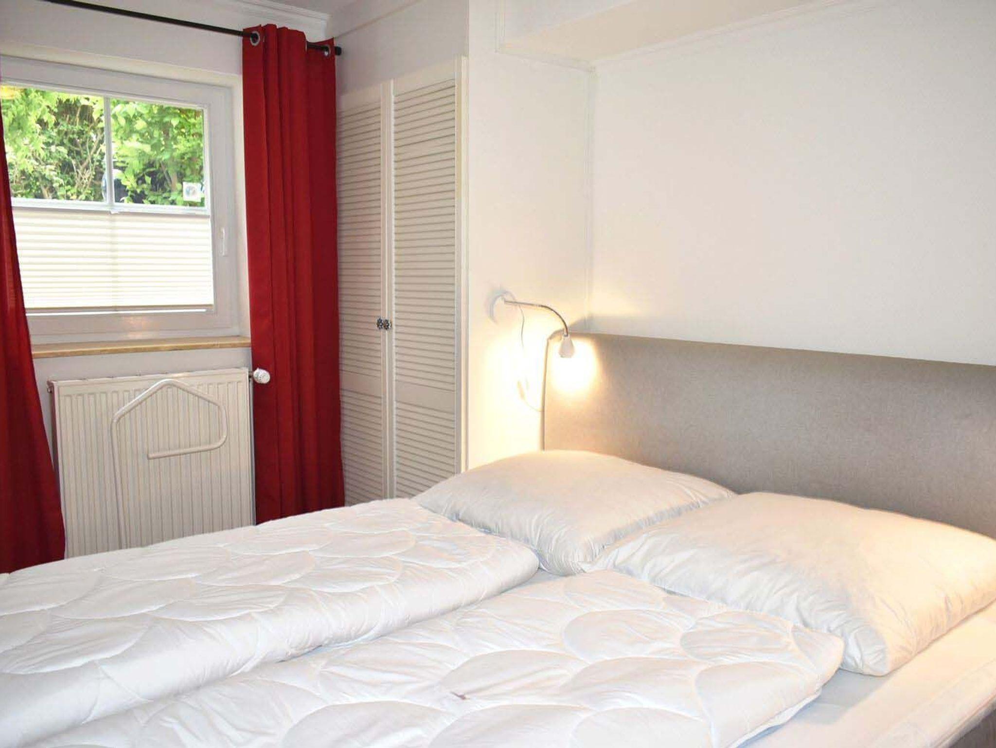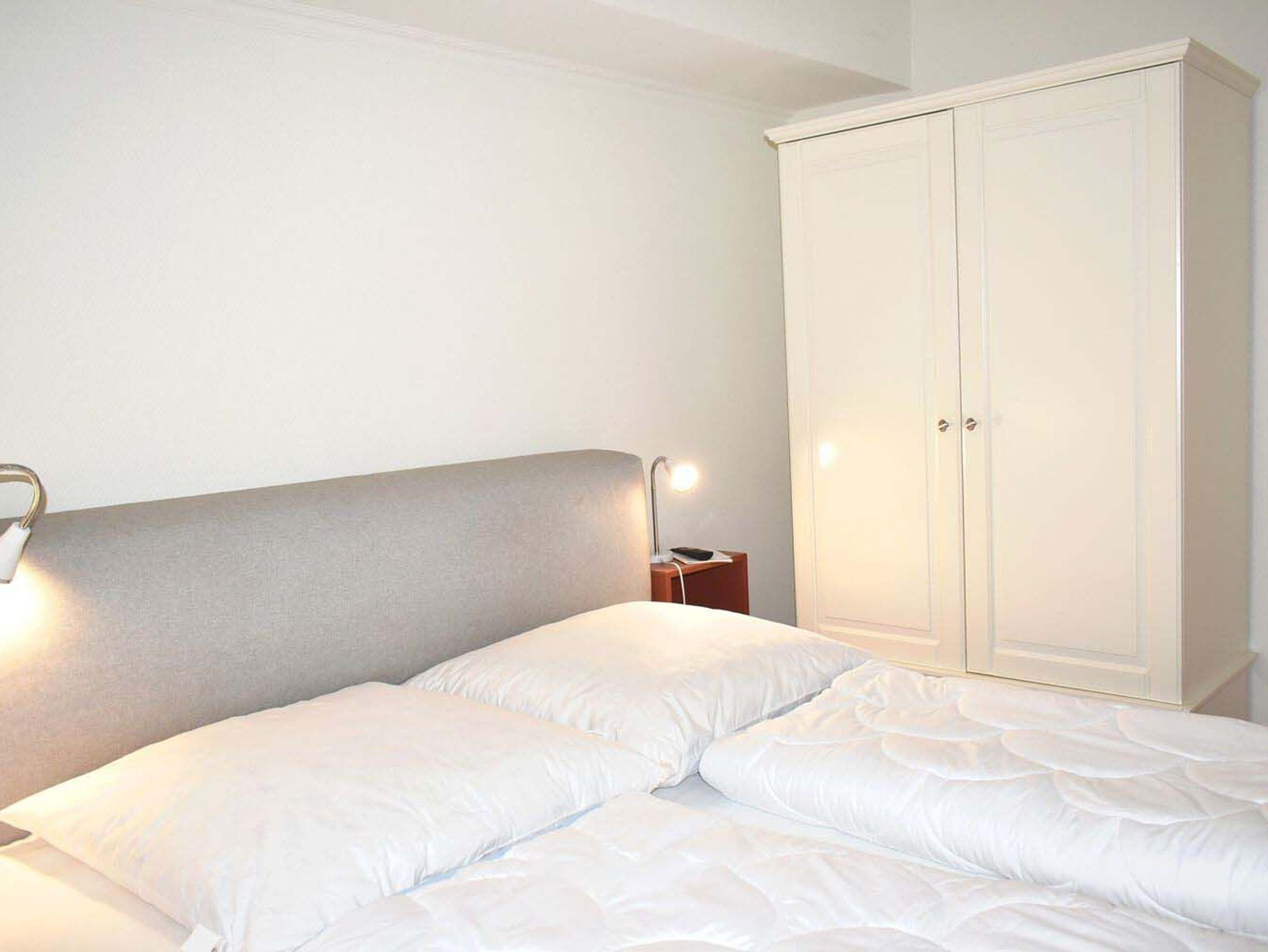 Schlafzimmer 1: 2 Kleiderschränke, Boxspringbett 2,00 x 1,80 m, Plissees, Stuhl, wandhängender Kabel-TV Flachbildschirm