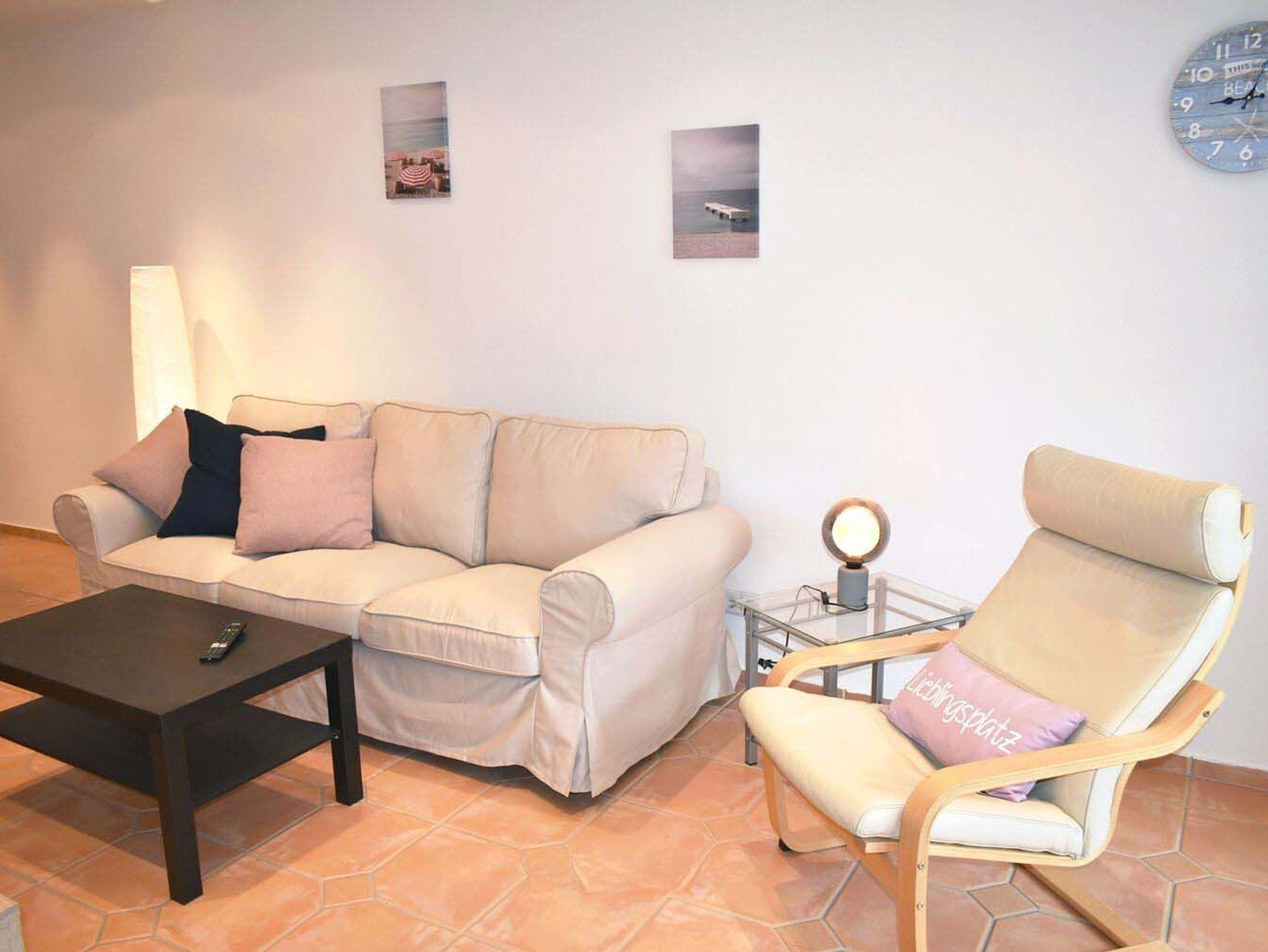 Wohnzimmer: 2 Sessel, Bauernschrank, Bügelbrett, Couch, Couchtisch, Smart TV, TV-Anrichte, wandhängender Kabel-TV Flachbildschirm, Wäscheständer