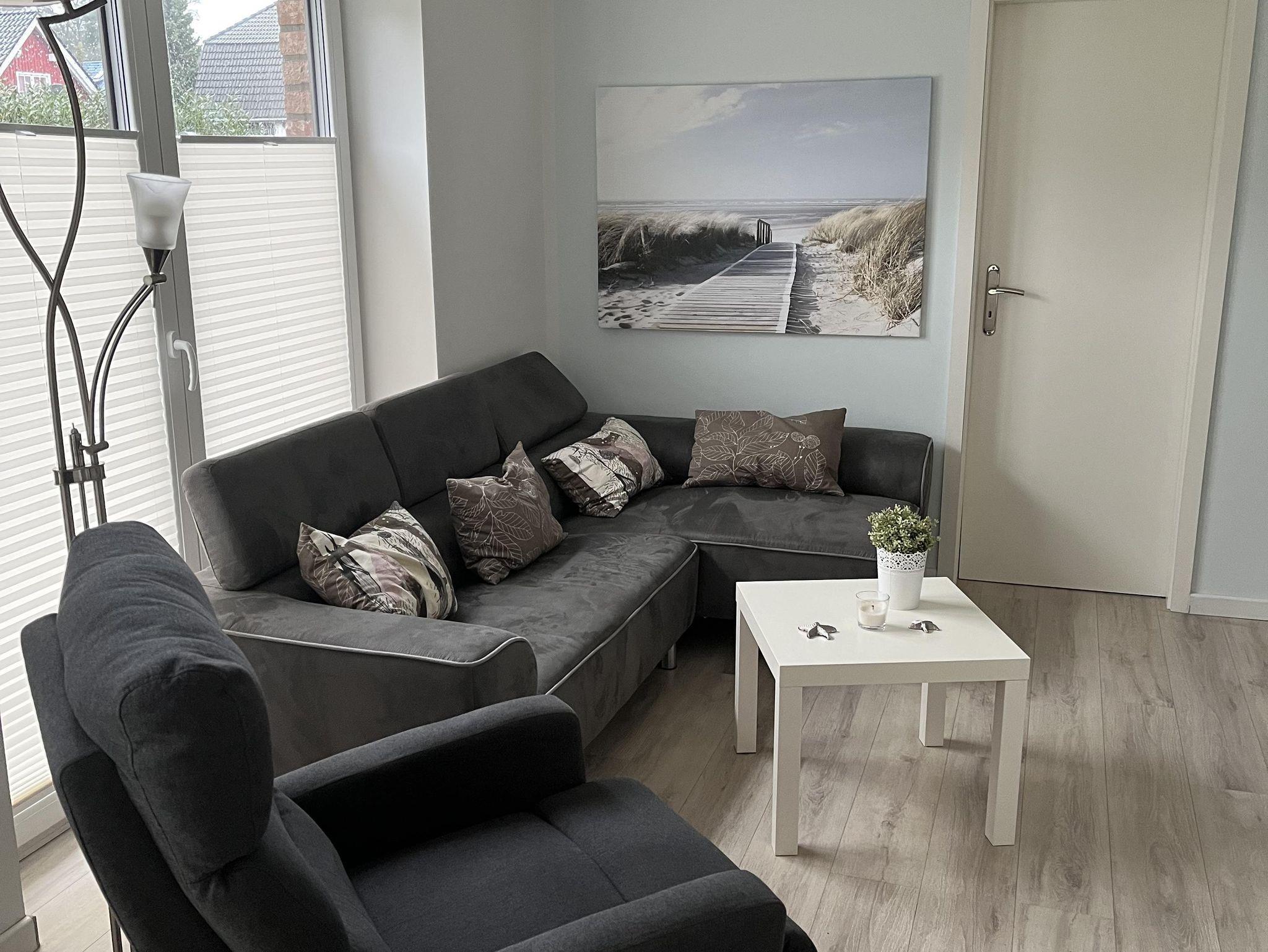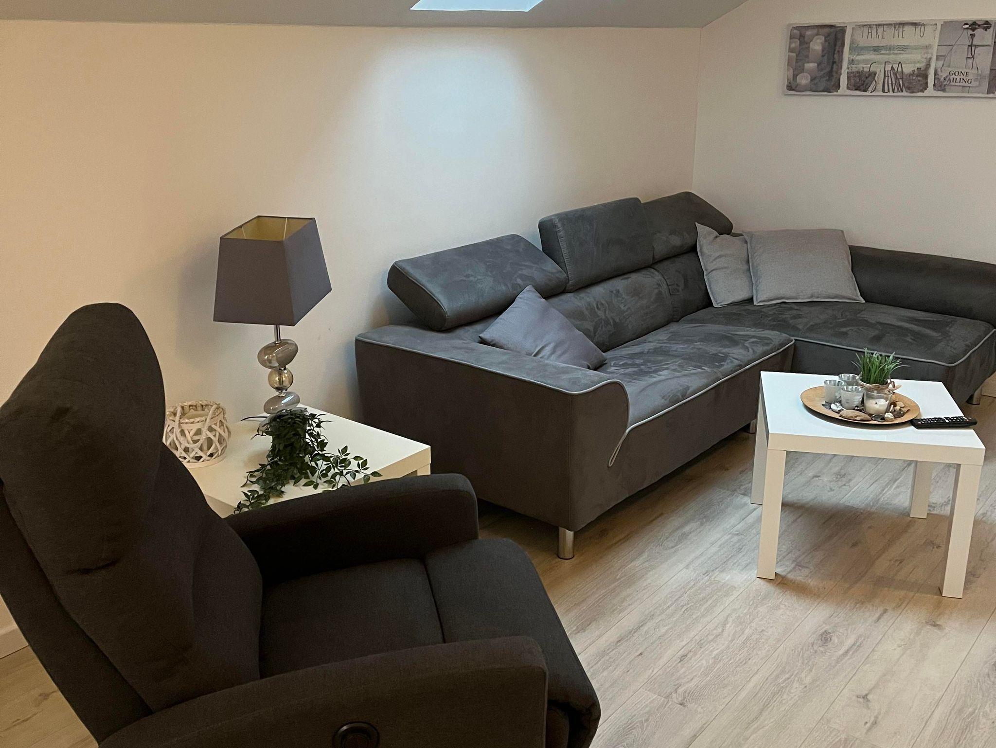Im Wohnbereich gibt es eine gemütliche Sofaecke mit Flachbildschirm, DVD Player und Radio/ CD