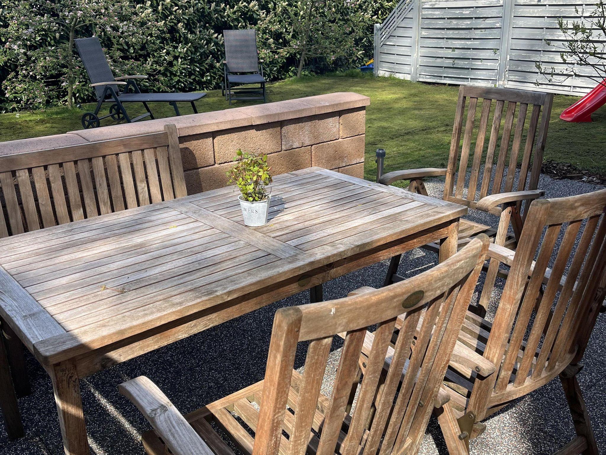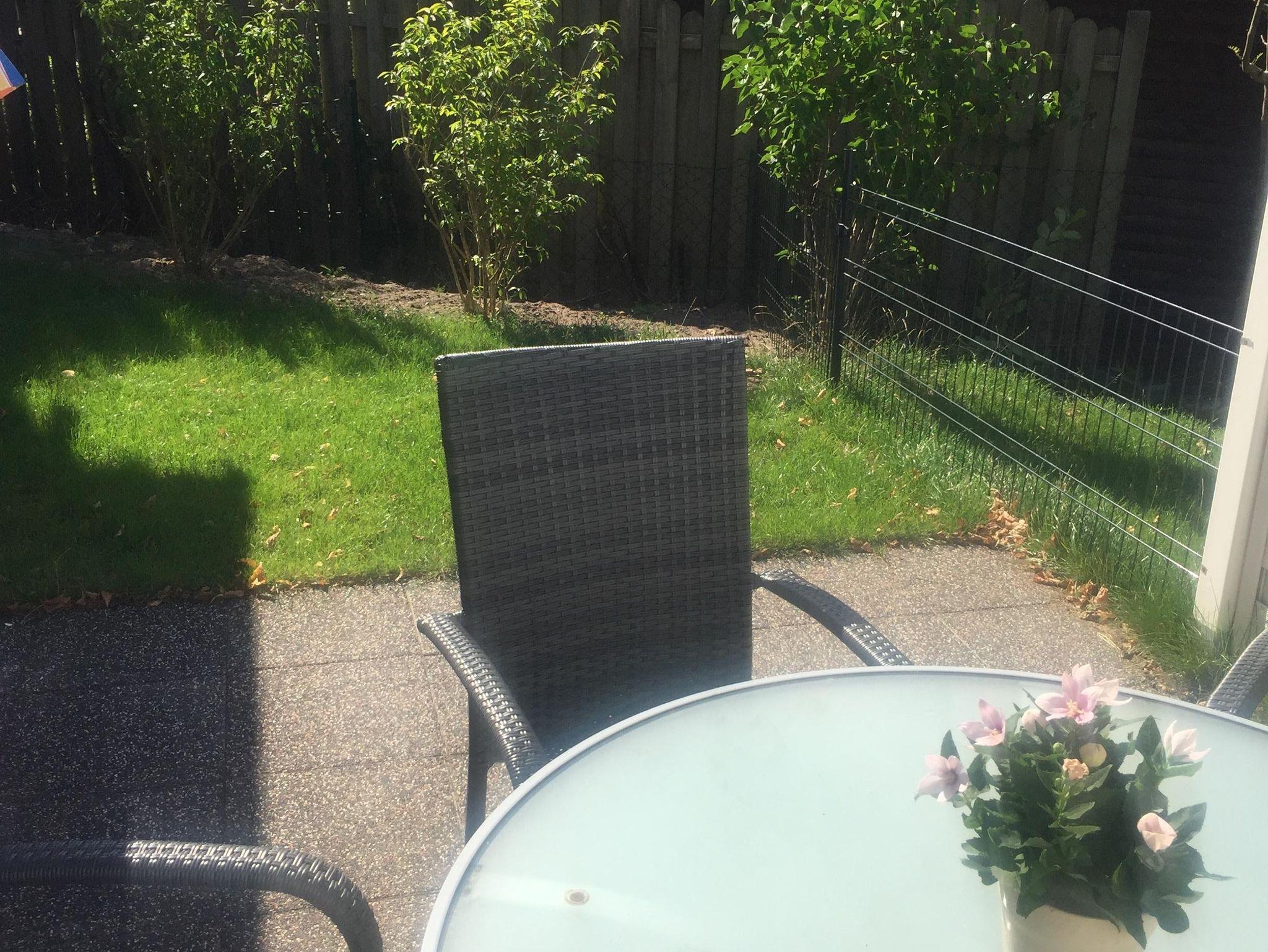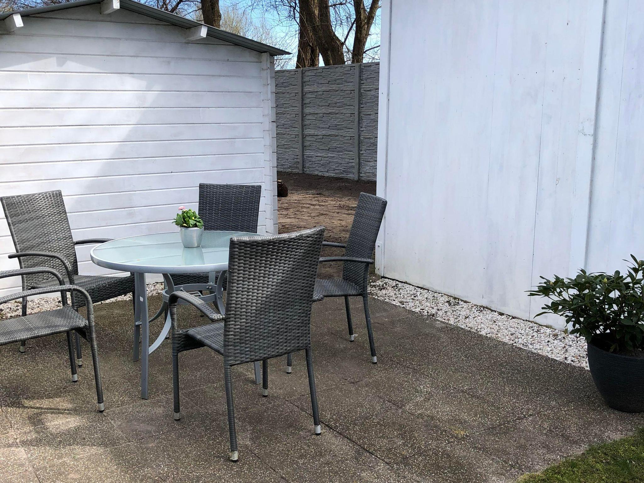 Zur Wohnung gehört eine Terrasse wo ein Tisch mit vier Stühlen zur Verfügung steht.