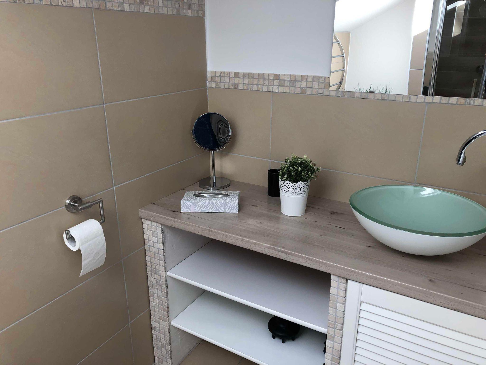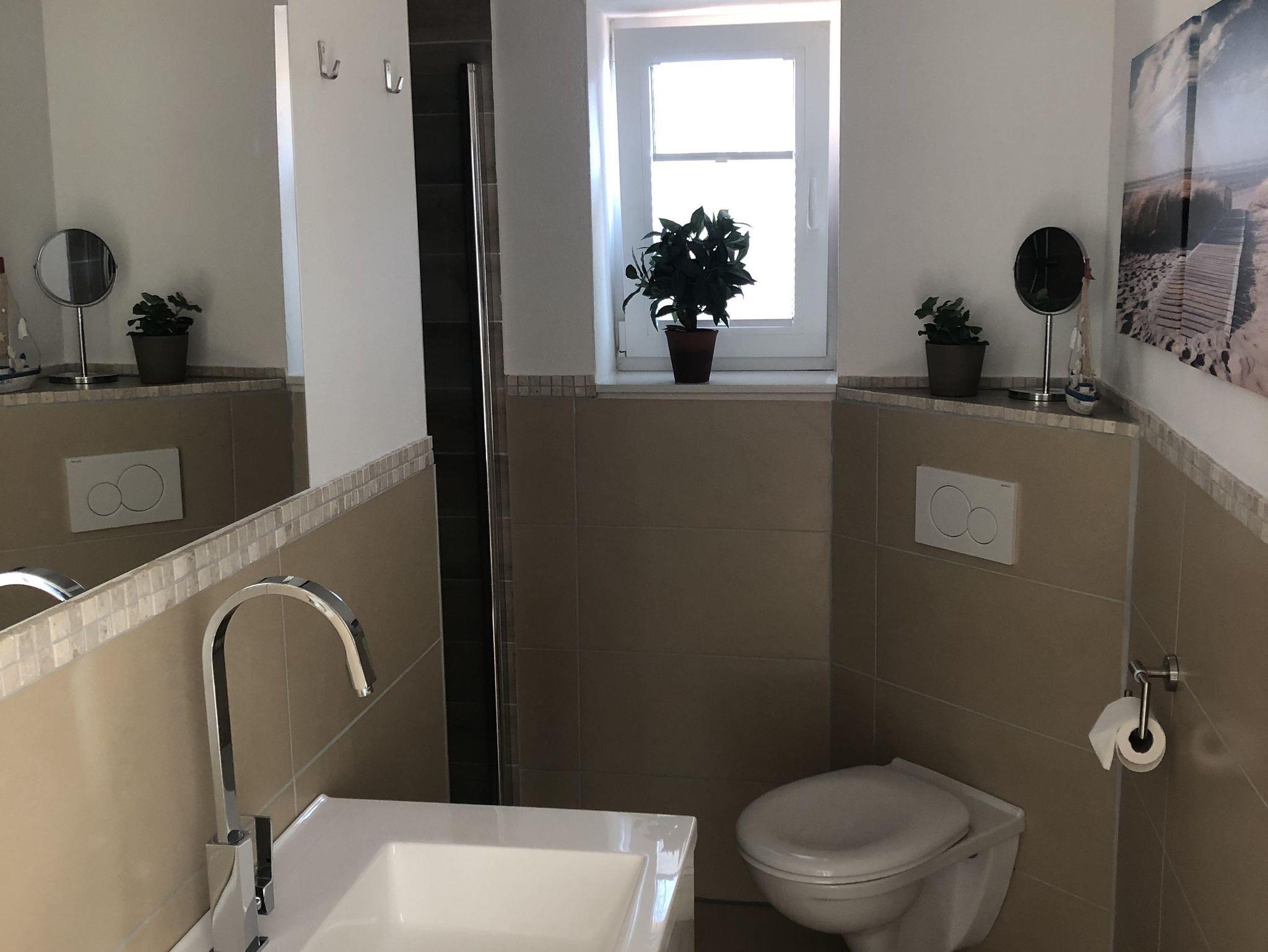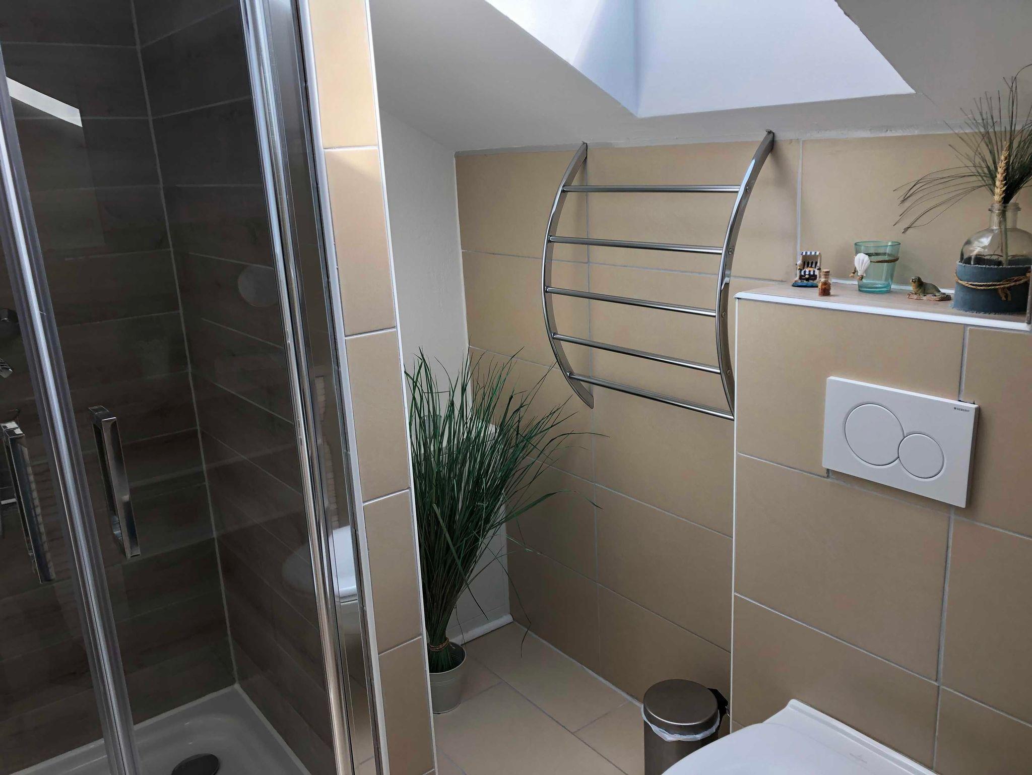 Das Badezimmer verfüg über eine Dusche und es gibt ein Fenster.