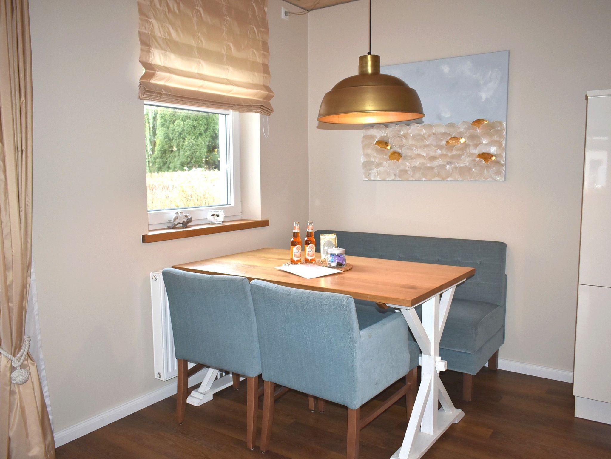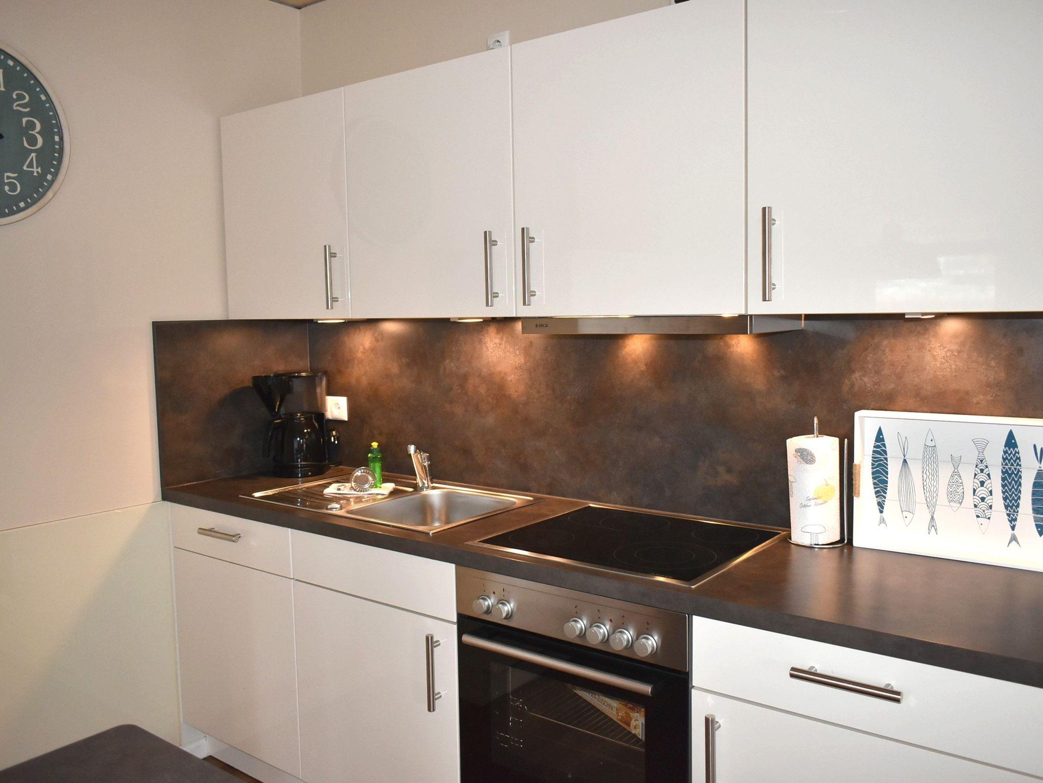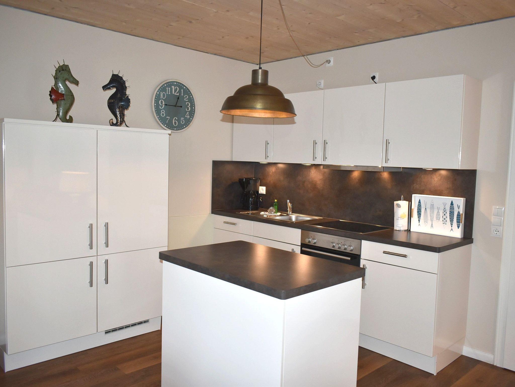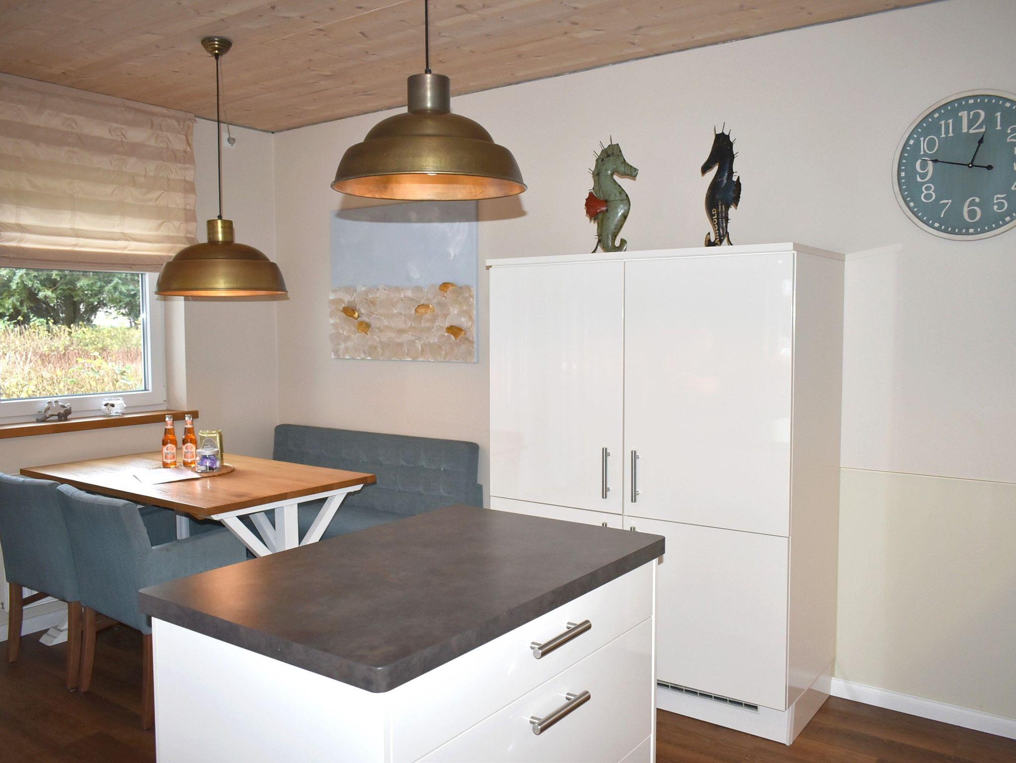 Wohnzimmer: 2 Beistelltische, 2 Sessel, 2 Stühle, 3 Tischlampen, 4 Plattenherd mit Ceranfeld und Backofen, Anrichte, Couchtisch, Dunstabzugshaube, Eierkocher, Esstisch, Flachbildschirm, Gefrierschrank mit 2 Schubladen, Geschirr, Handmixer, Kaffeemaschine, Kochtöpfe, Küchenzeile, Kühlschrank, Mikrowelle, Sat-TV, Schlafcouch, Sitzbank, Spülmaschine, Toaster, Waage, Wasserkocher