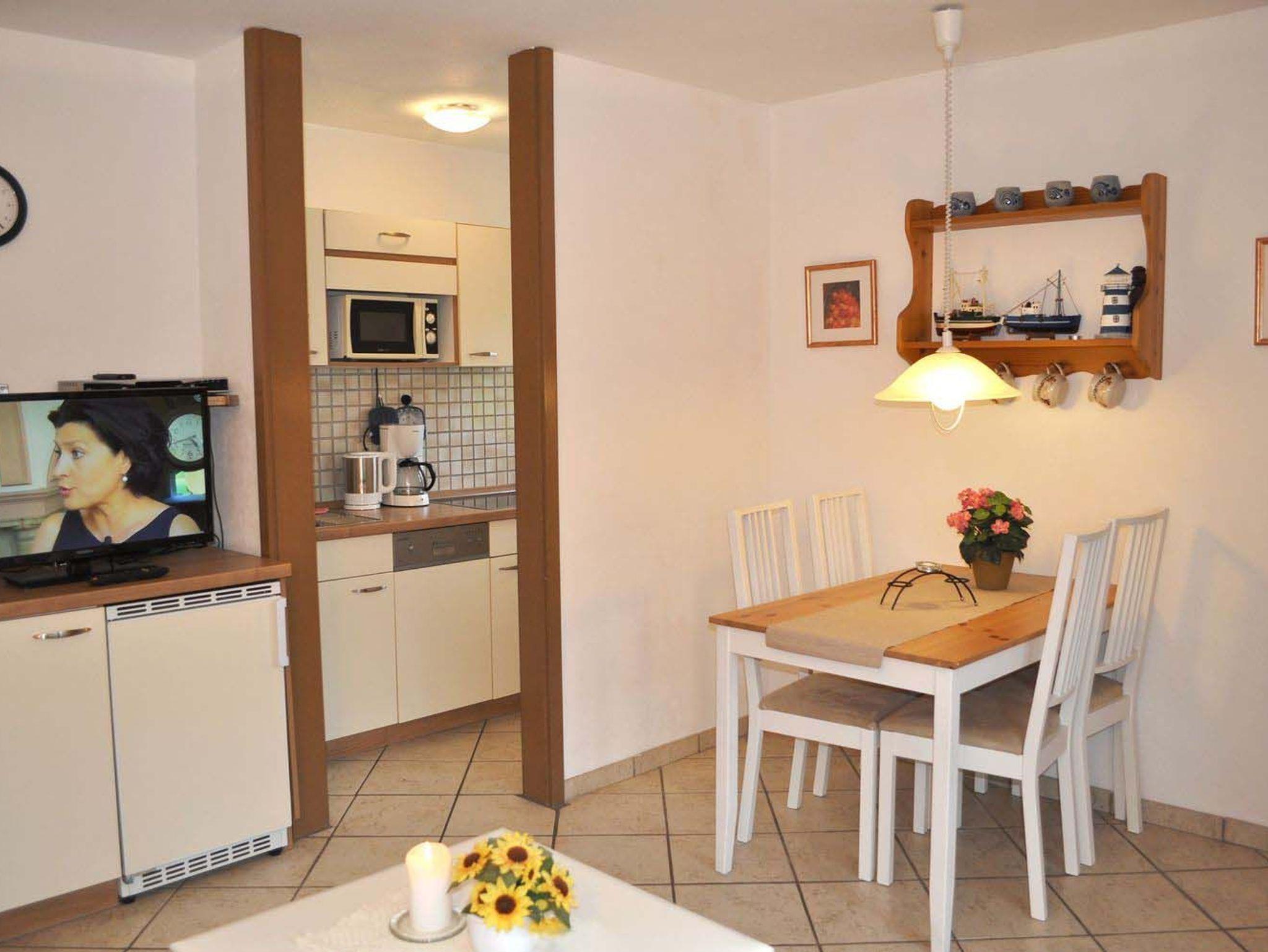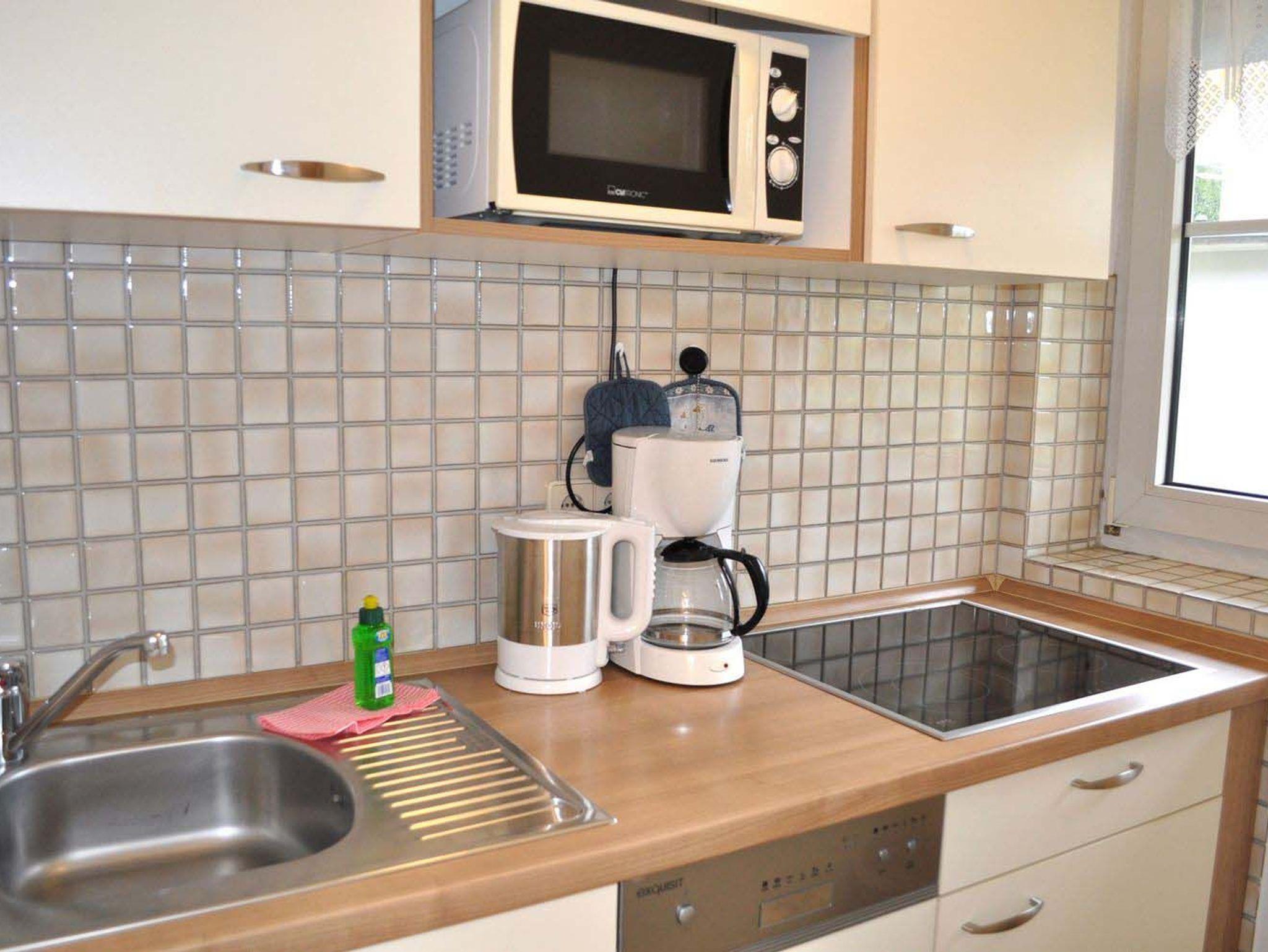 Küche: 4 Plattenherd mit Ceranfeld, Geschirr, Kaffeemaschine, Kochtöpfe, Küchenzeile, Kühlschrank, Mikrowelle, Spülmaschine, Wasserkocher