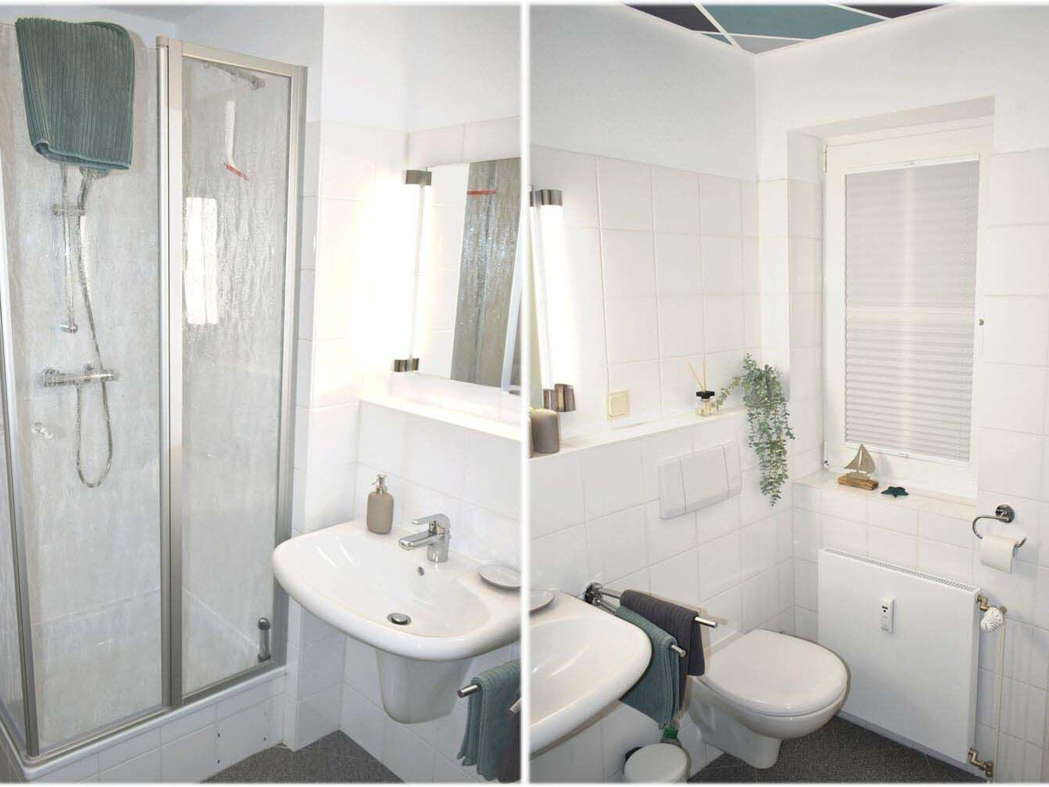 Bad 1: Dusche, Duschkabine, Fön, Hängeregal, Spiegel, Waschbecken, WC