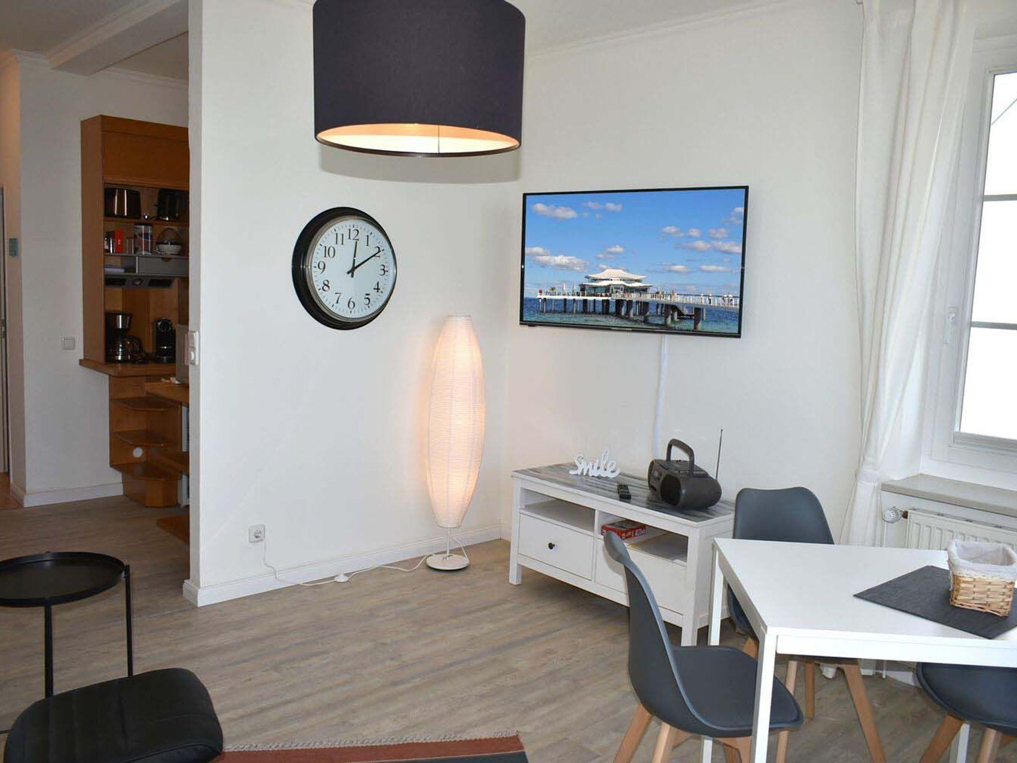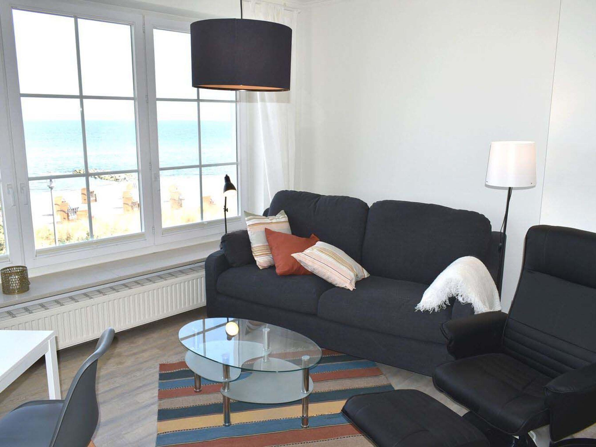Wohnzimmer: 2 Stehlampen, 3 Stühle, Couch, Couchtisch, direkter Meerblick von der Couch und Essecke, Eckvitrine, Esstisch, großes Panoramafenster mit direktem Meerblick, Hocker, Plissees, Sessel, Smart TV, TV-Anrichte, wandhängender Kabel-TV Flachbildschirm
