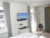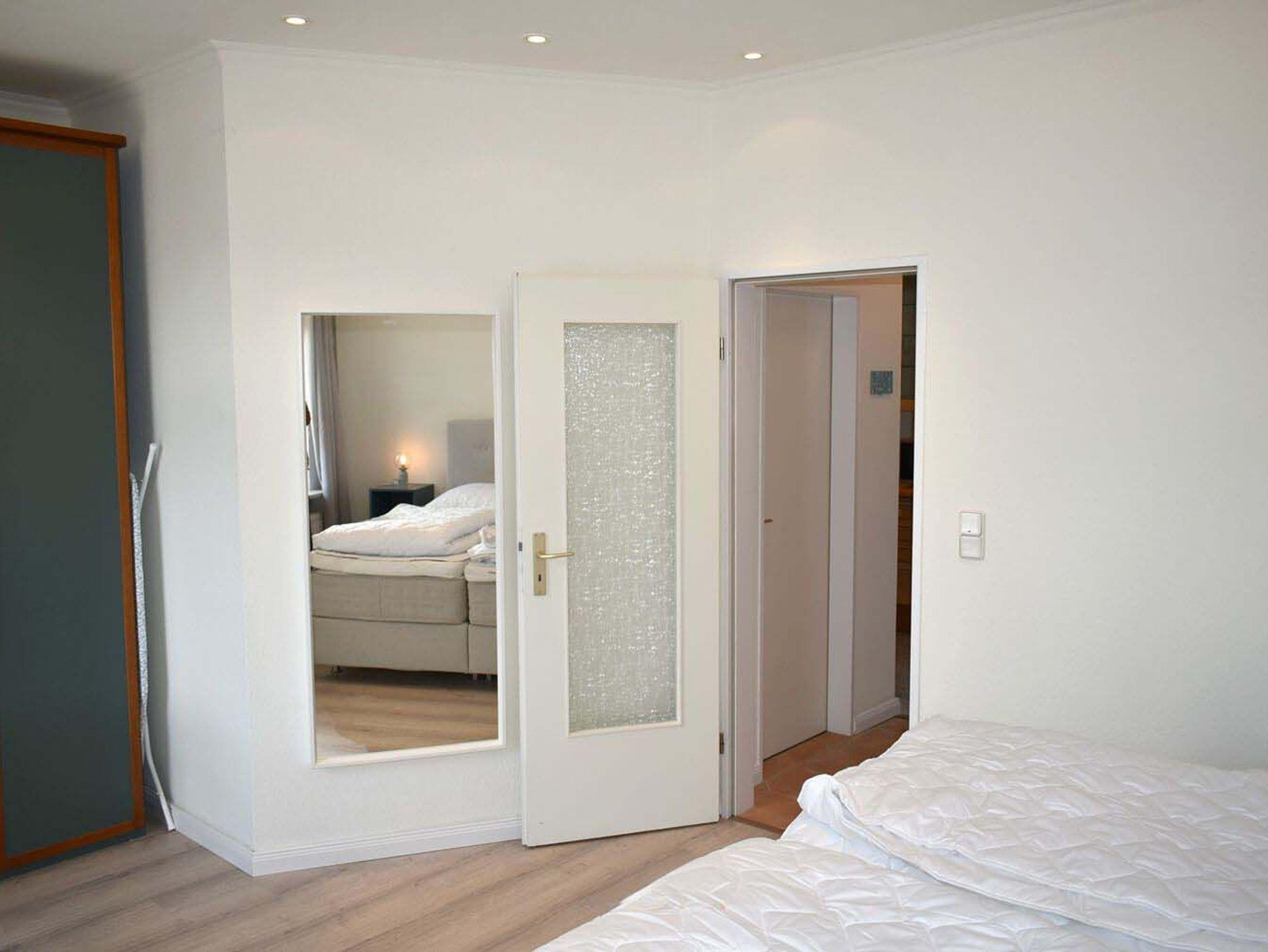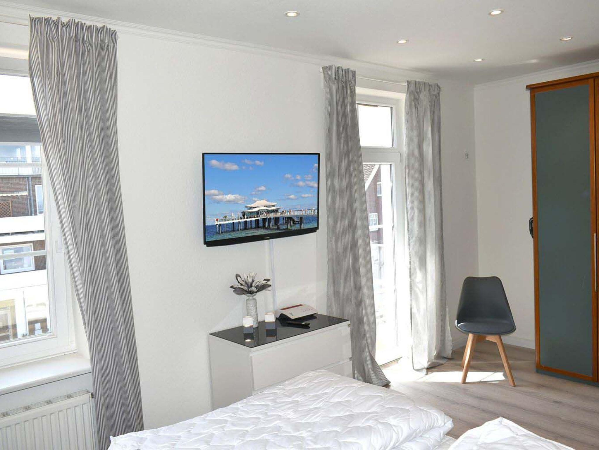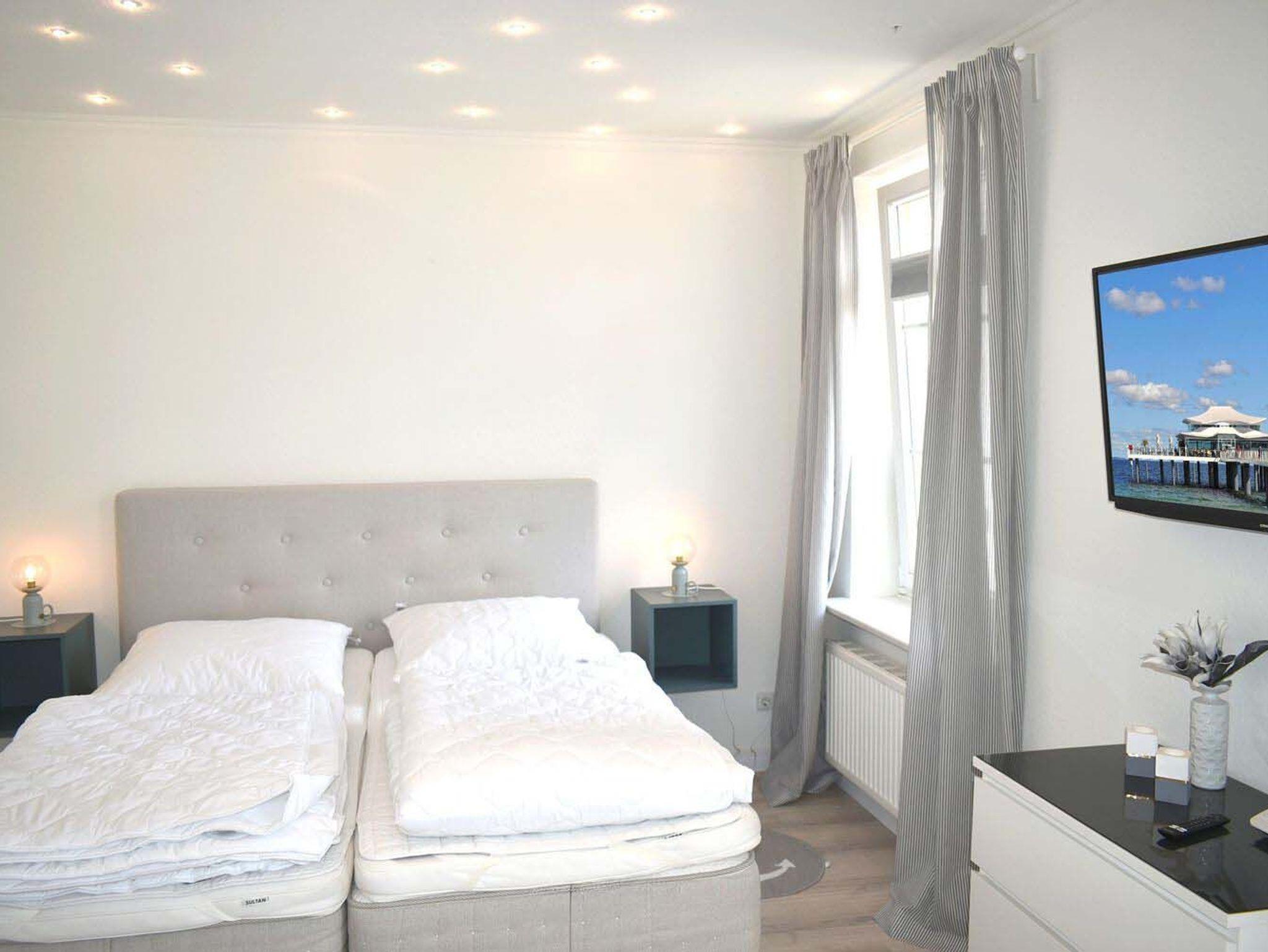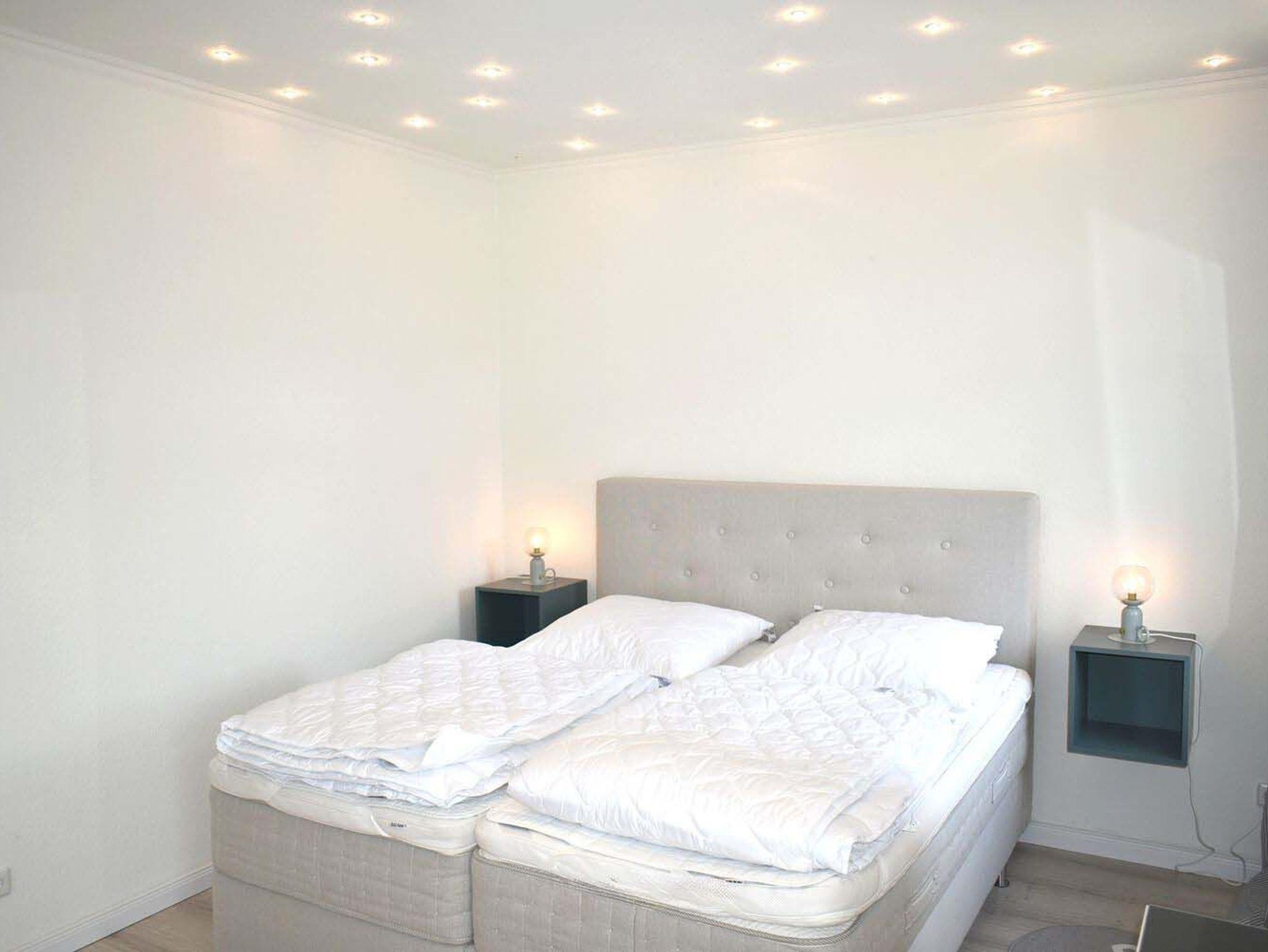 Schlafzimmer 1: 2 Matratzen, 2 Nachttische, 2 Nachttischlampen, Boxspringbett 2,00 x 1,80 m, Bügelbrett, Kleiderschrank, Kommode, Lampensternenhimmel, Stuhl, Verdunklungsplissee, wandhängender Kabel-TV Flachbildschirm
