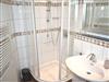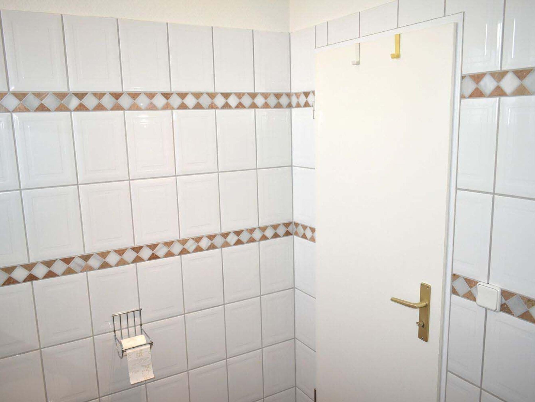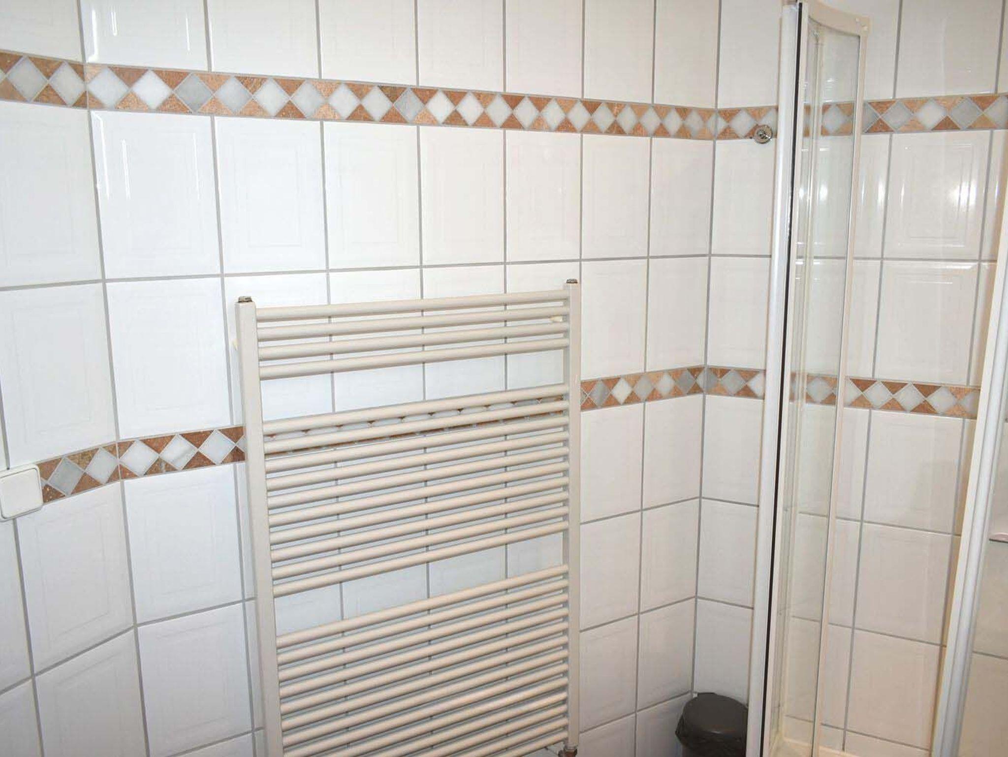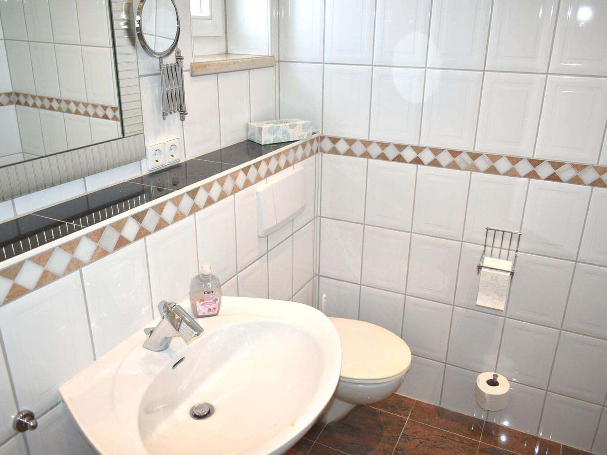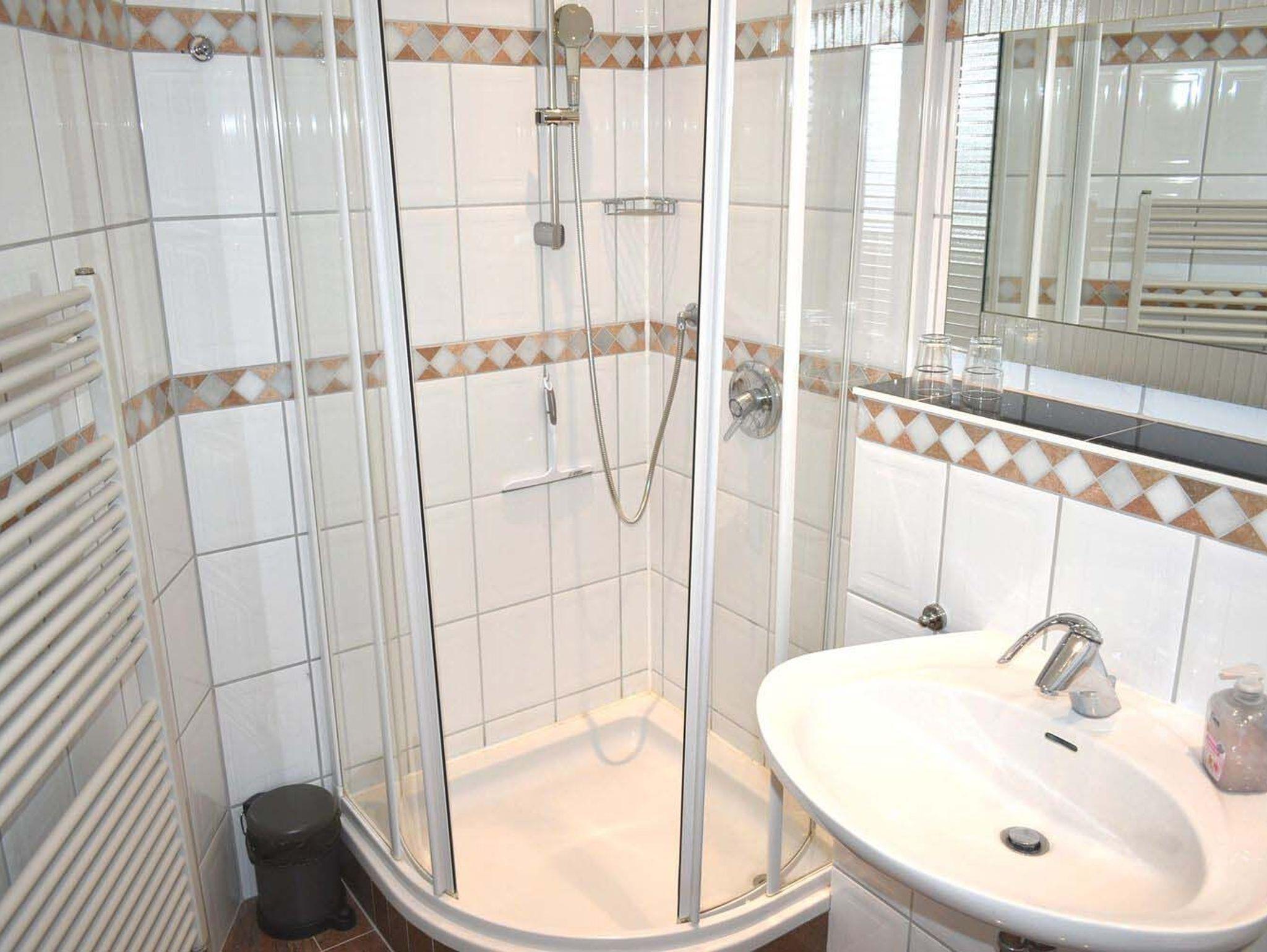 Bad 1: Duschkabine, Handtuchheizung, Spiegel, Waschbecken, WC