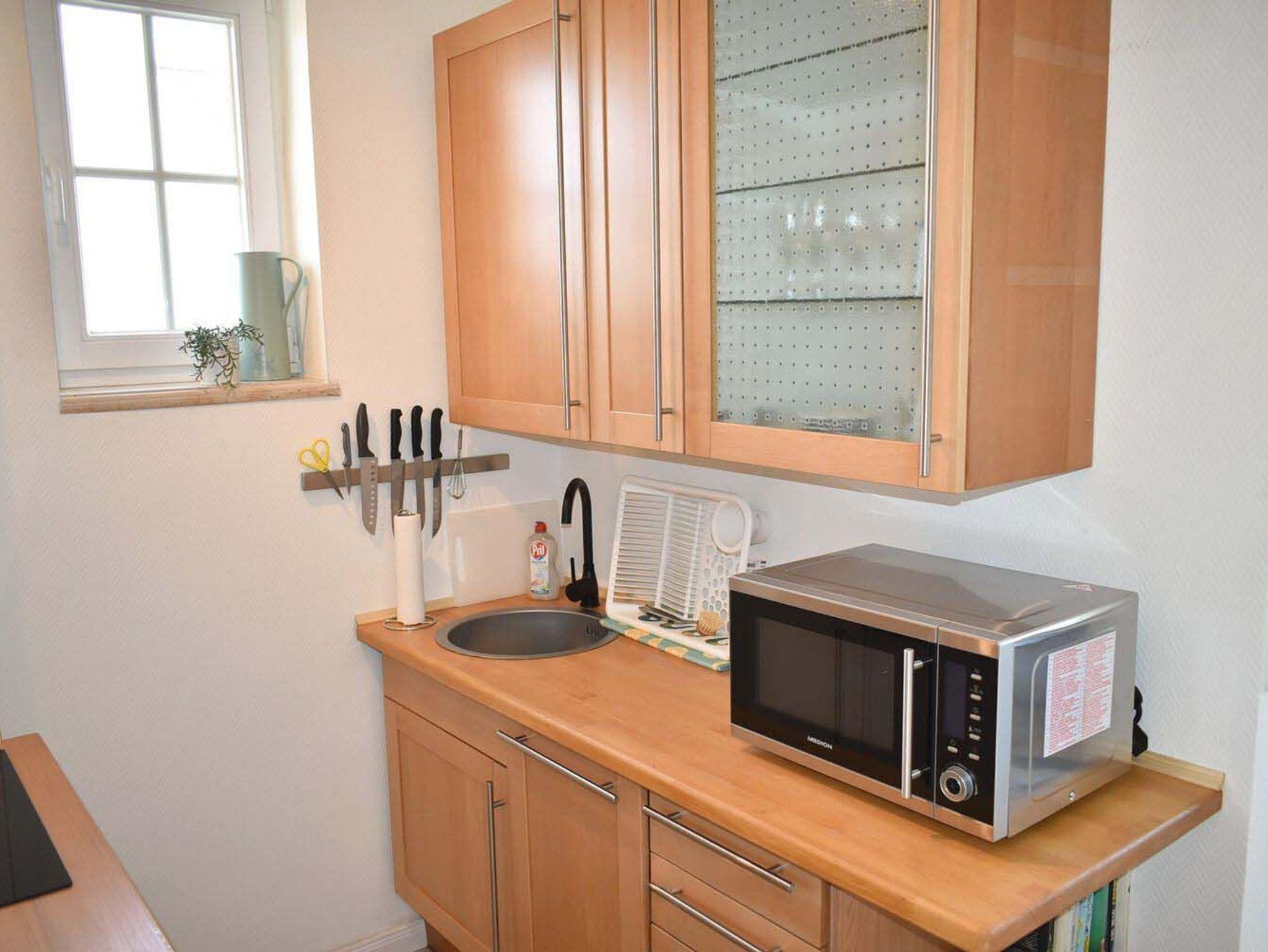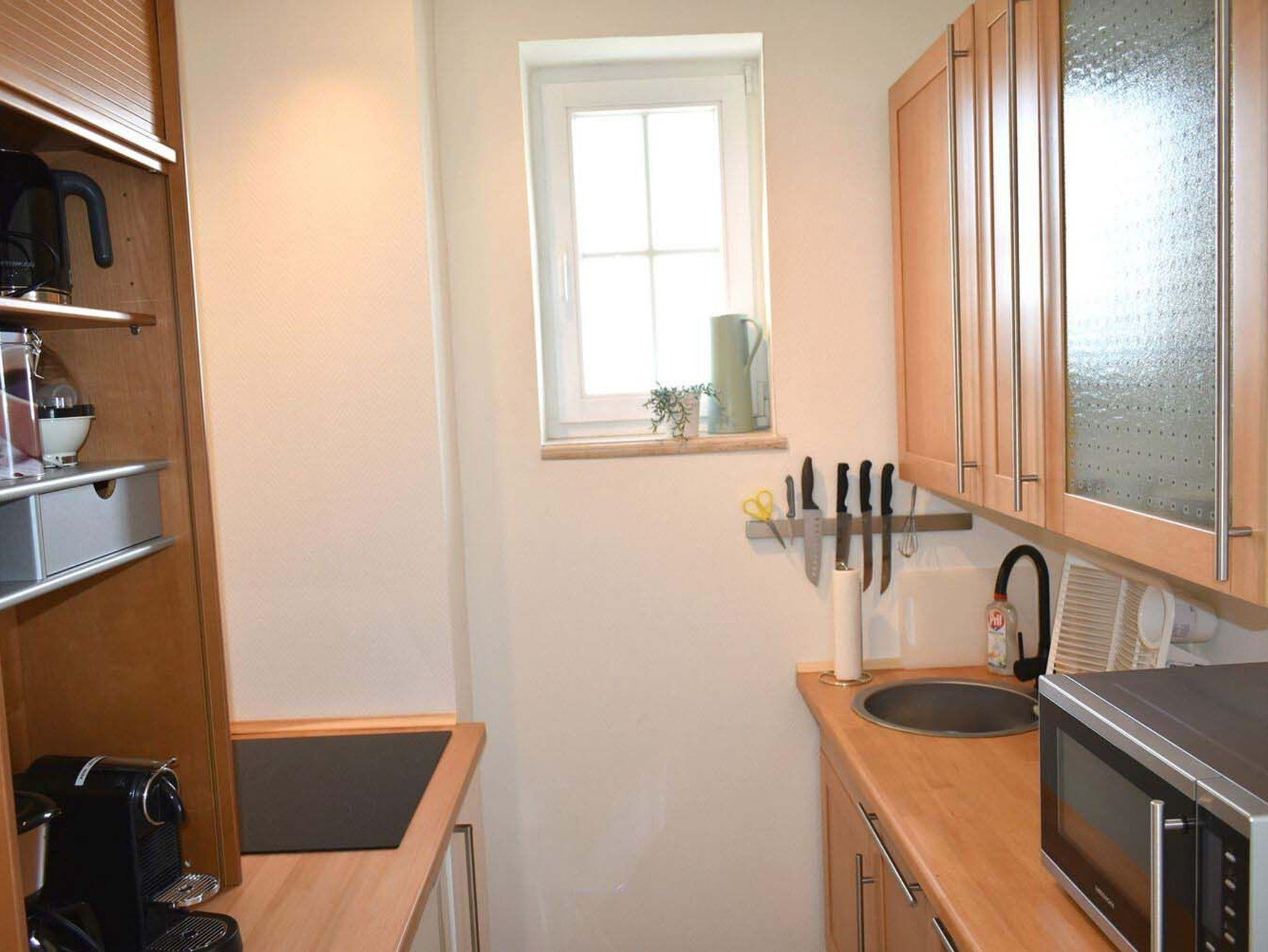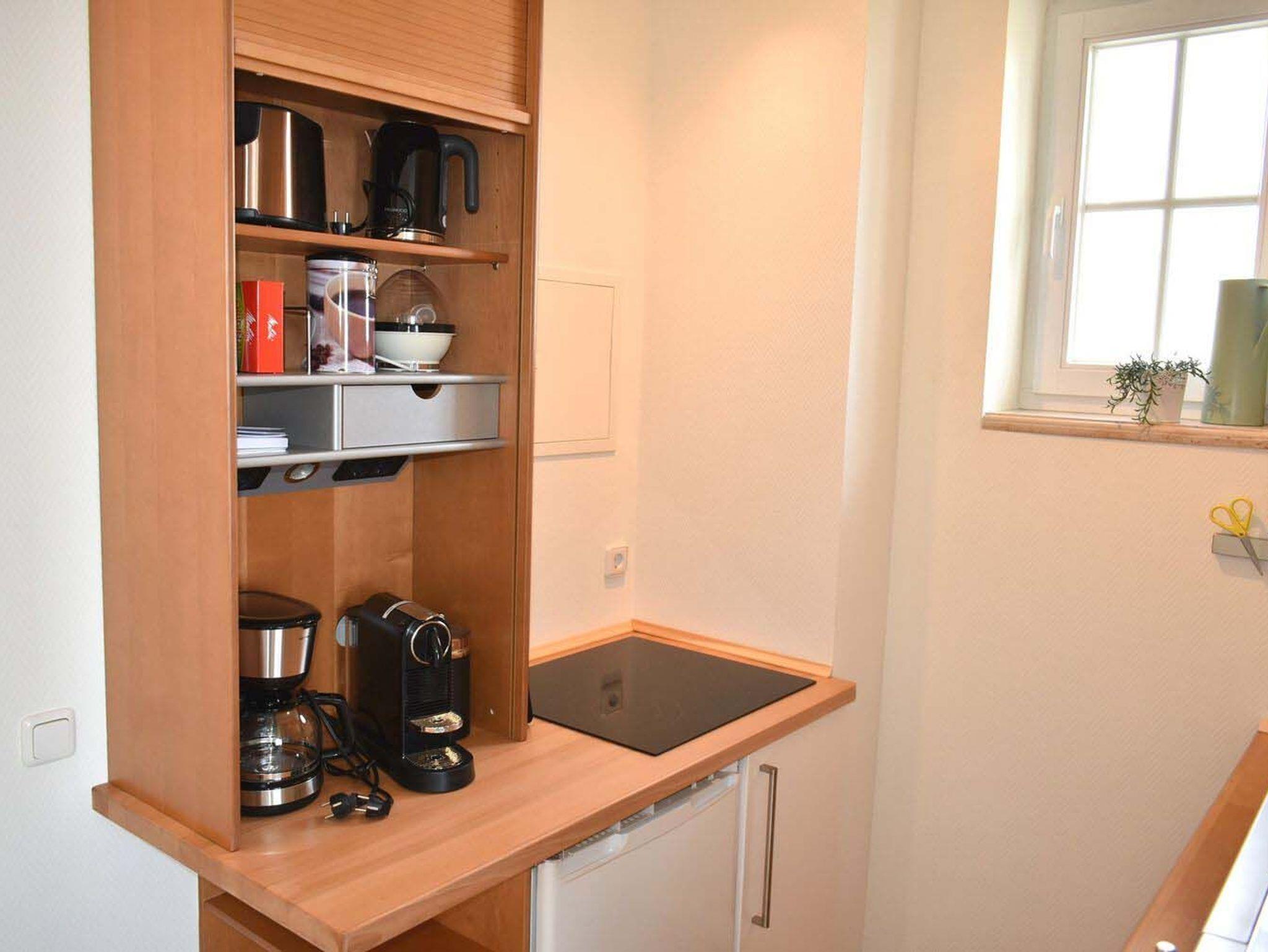 Küche: Eierkocher, Einbauküche, Kaffeemaschine, Kochtöpfe, Kühlschrank mit Gefrierfach, Wasserkocher