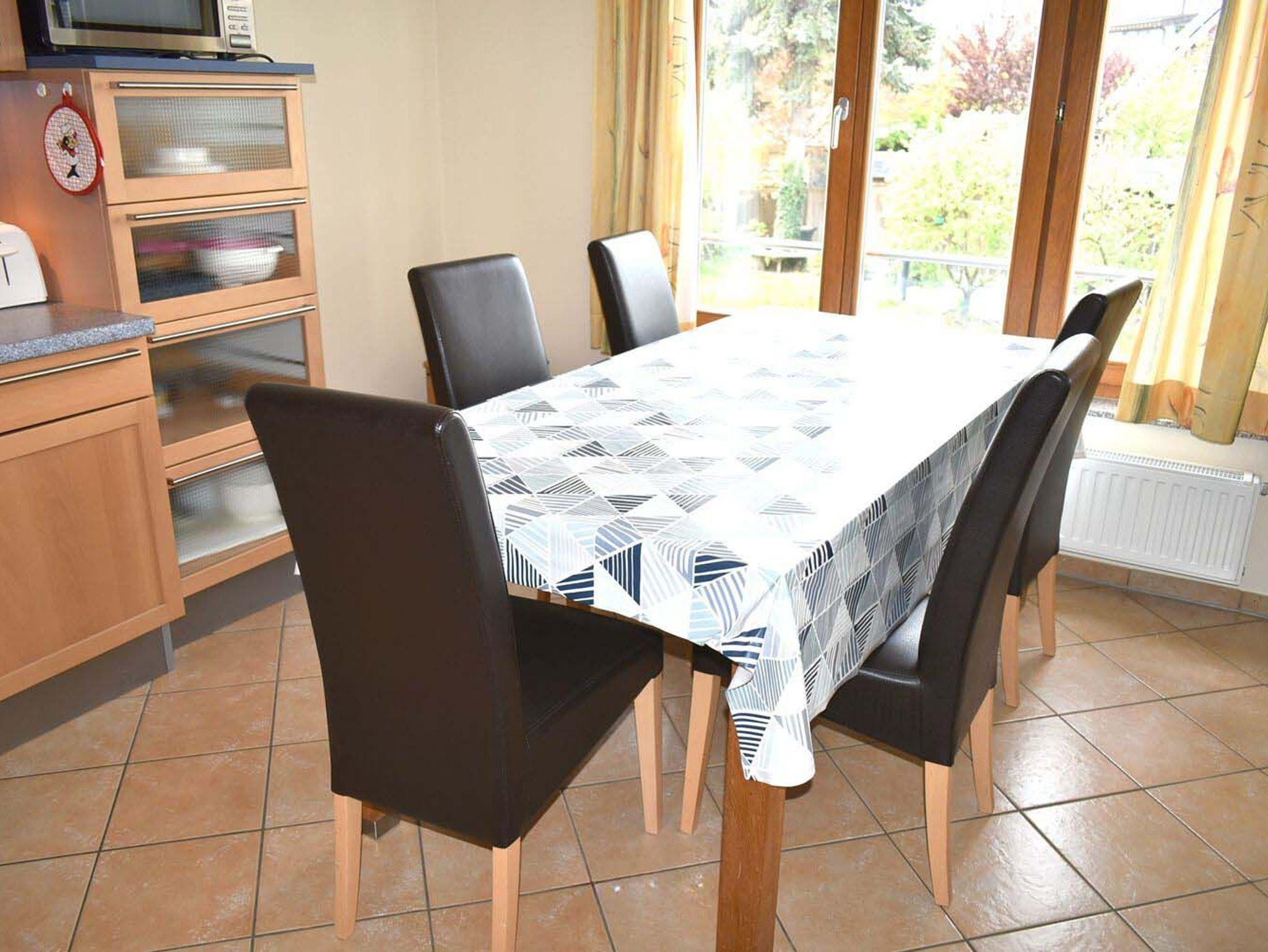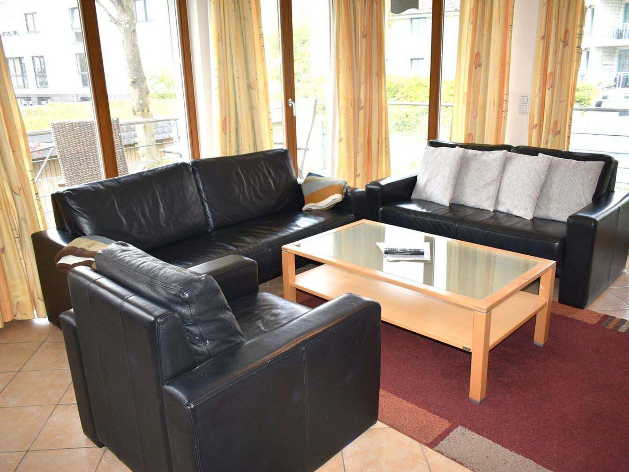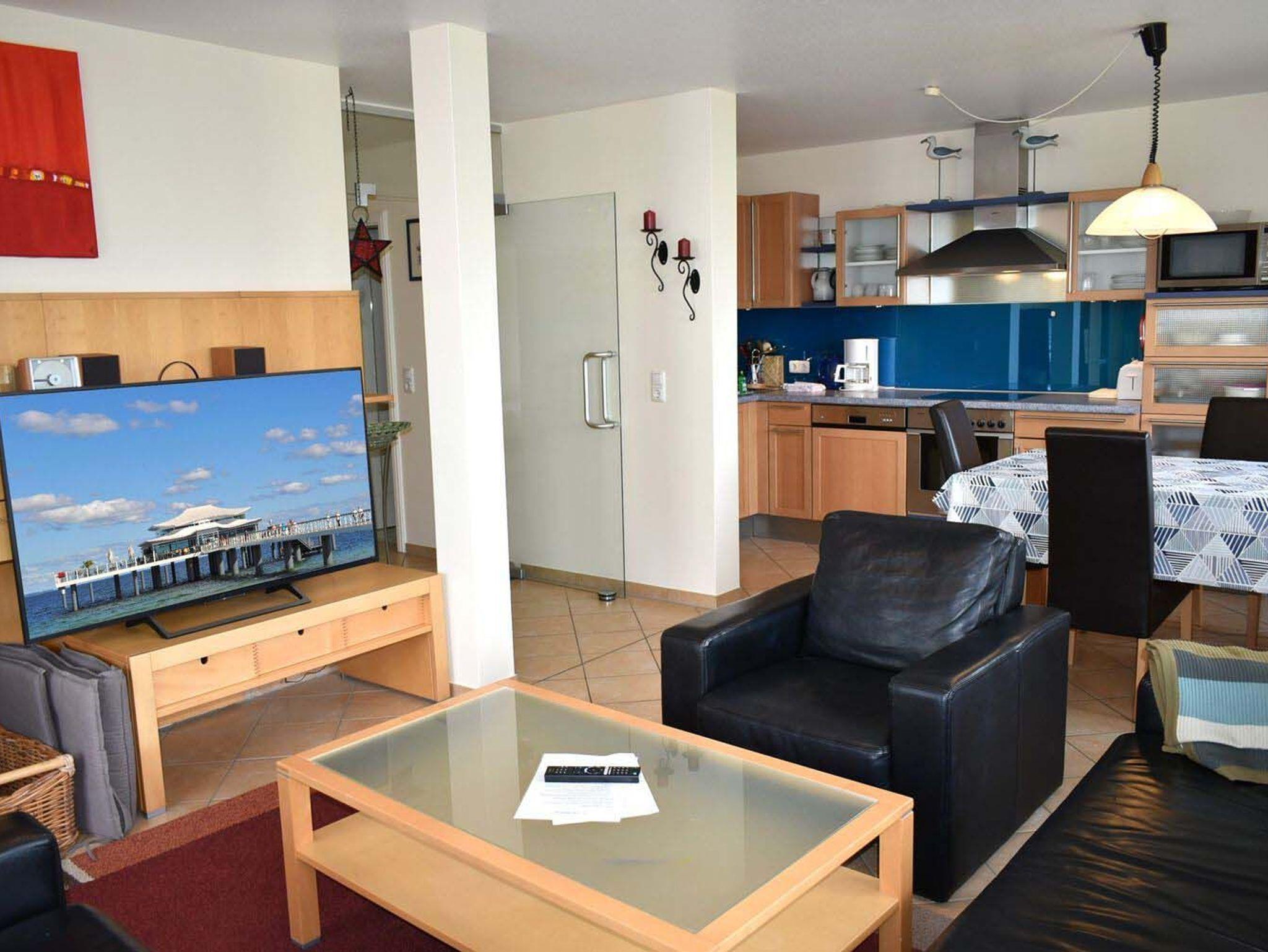 Wohnzimmer: 4 Plattenherd mit Backofen, Couch, Einbauküche, Essecke, Geschirr, Hocker, Kaffeemaschine, Kochtöpfe, Kühlfach für Getränke, Kühlschrank, Mikrowelle, Sat-TV, Schrank, Sessel, Spülmaschine, Tisch, Wasserkocher