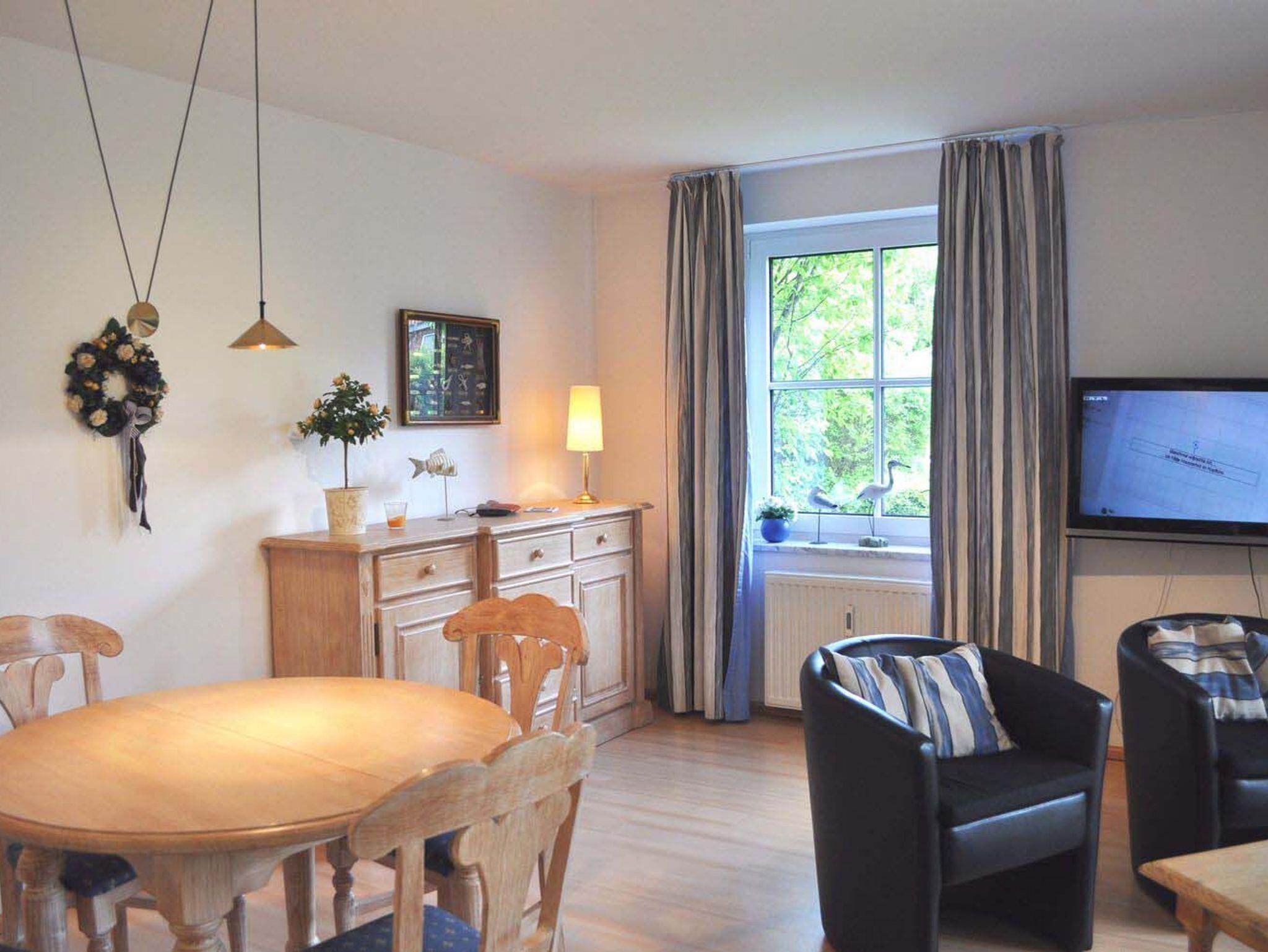 Wohnzimmer: 2 Sessel, 4 Stühle, Anrichte, Couchtisch, Einbauküche, Esstisch, Flachbildschirm, Geschirr, Kaffeemaschine, Kochtöpfe, Mikrowelle, Sat-TV, Schlafcouch, Spülmaschine, Stehlampe, Tischlampe, Toaster, Wasserkocher