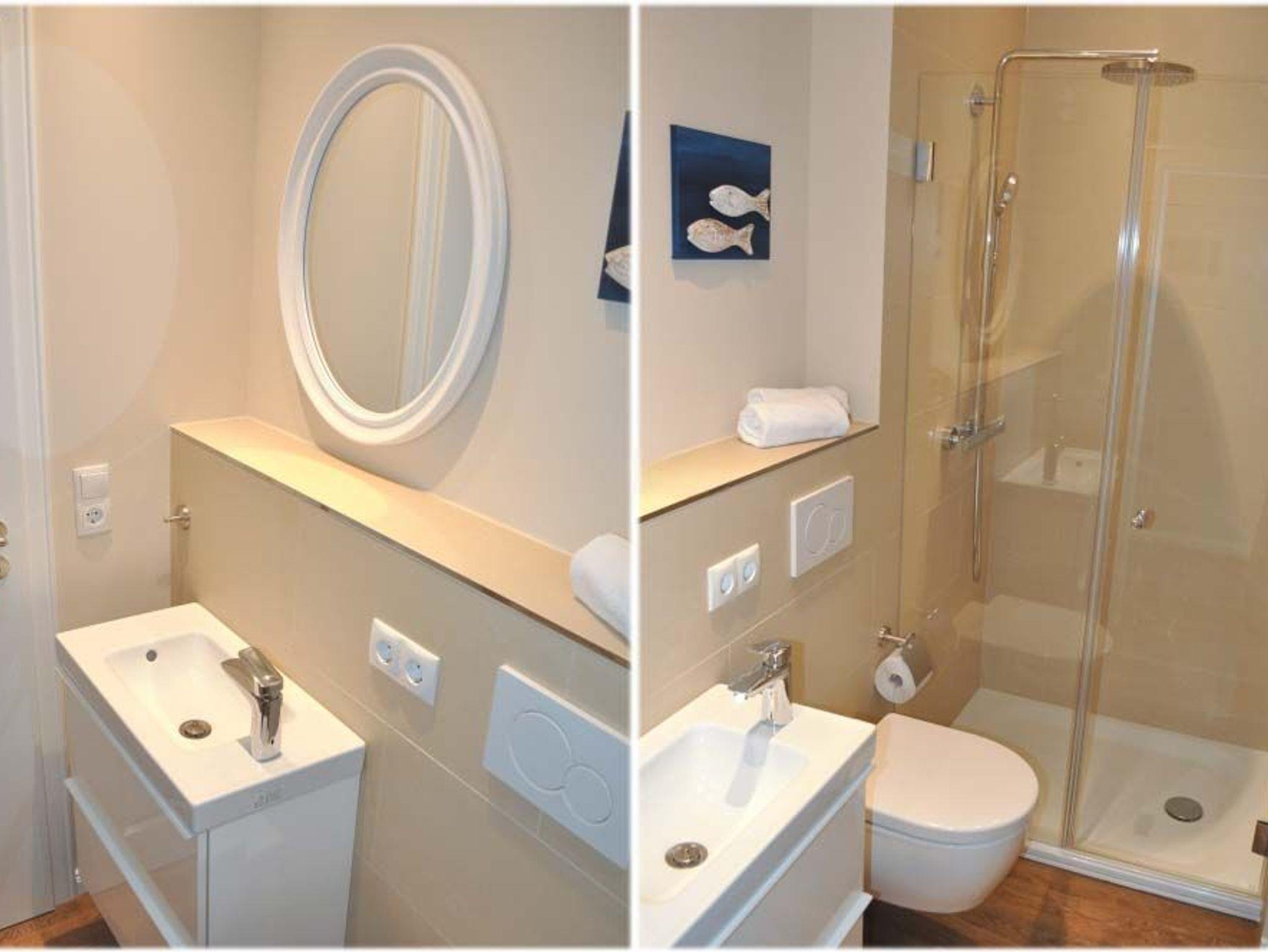 Bad 1: Duschkabine, Fön, Kosmetikspiegel, Regen-Dusche, Spiegel, Unterschrank, Waschtisch, WC
