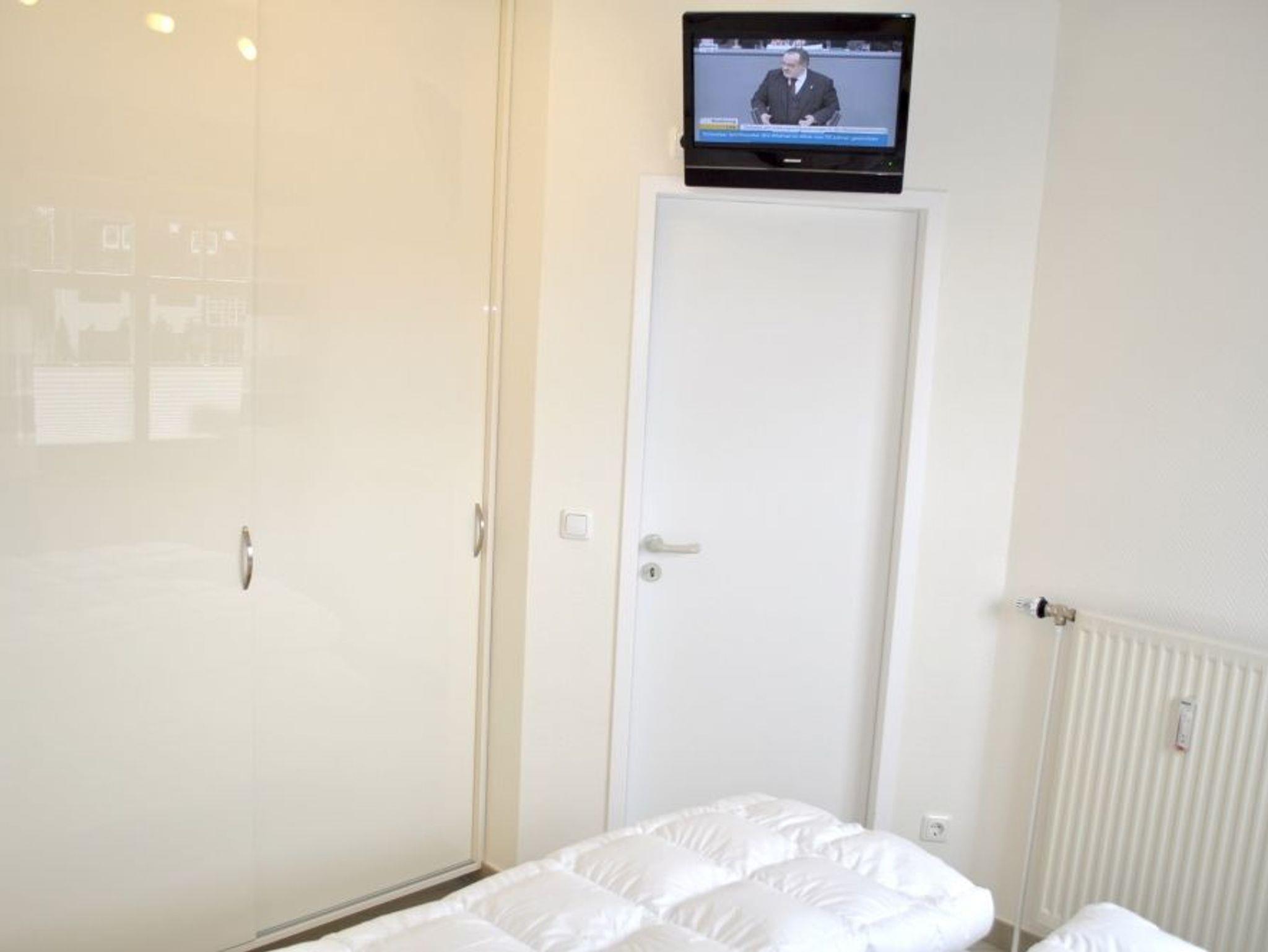 Schlafzimmer 1: 1 Matratze, 2 Nachttische, Doppelbett 2,00 x 1,60 m, Einbaukleiderschrank, Flachbildschirm, Hocker, Kabel-TV