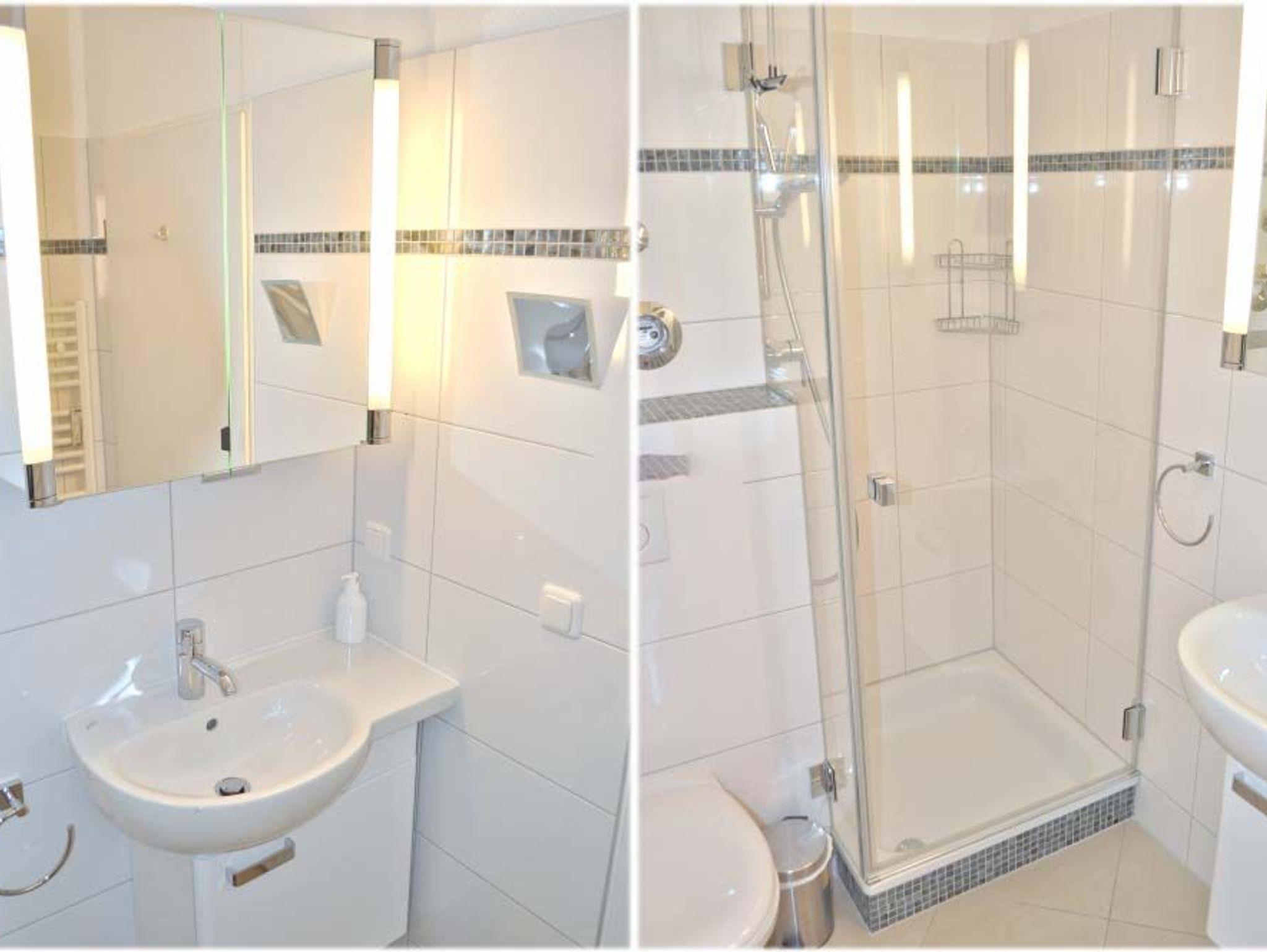 Bad 1: Dusche, Duschkabine, Fön, Kosmetikspiegel, Spiegelschrank, Waschtisch, WC