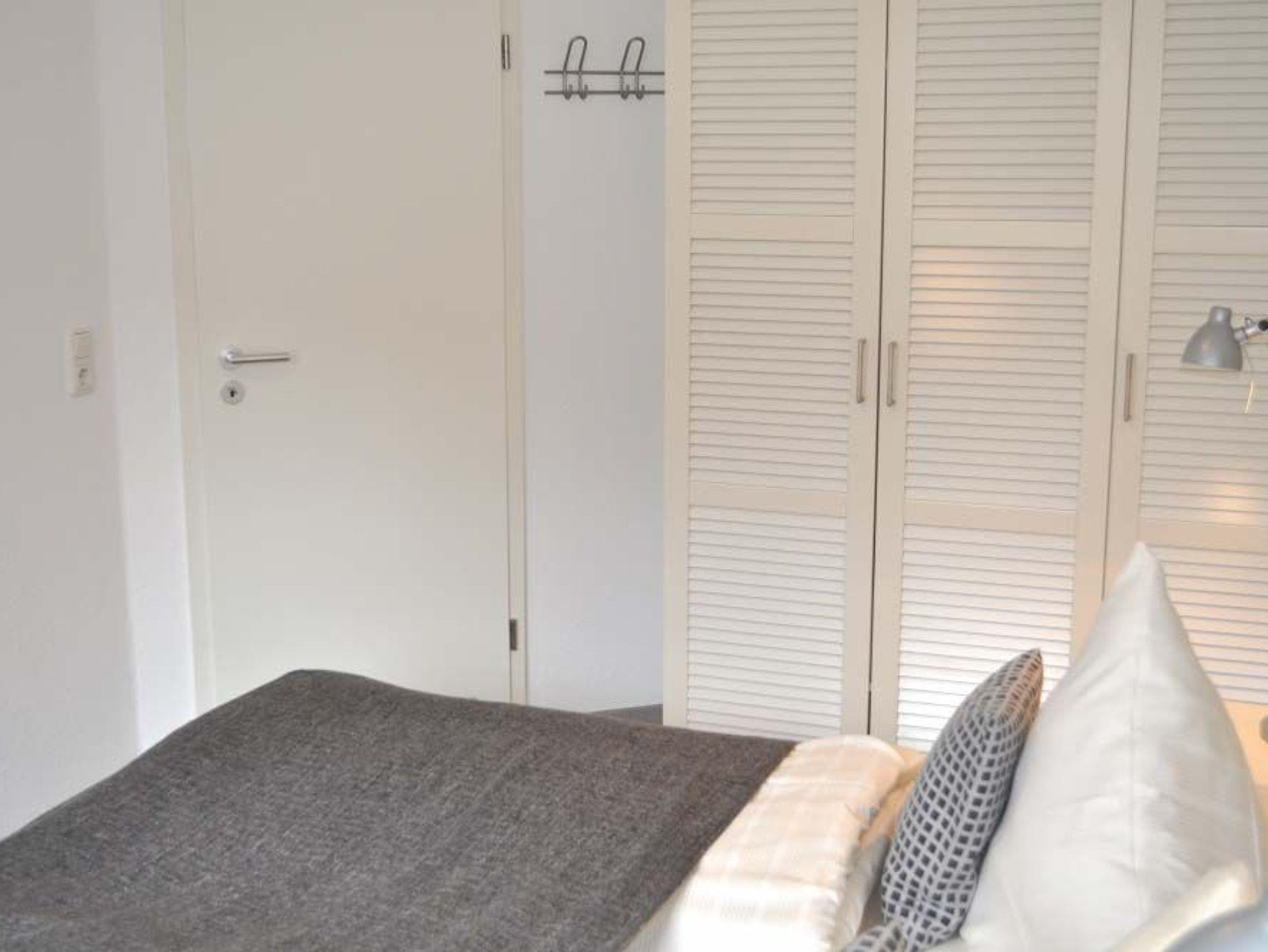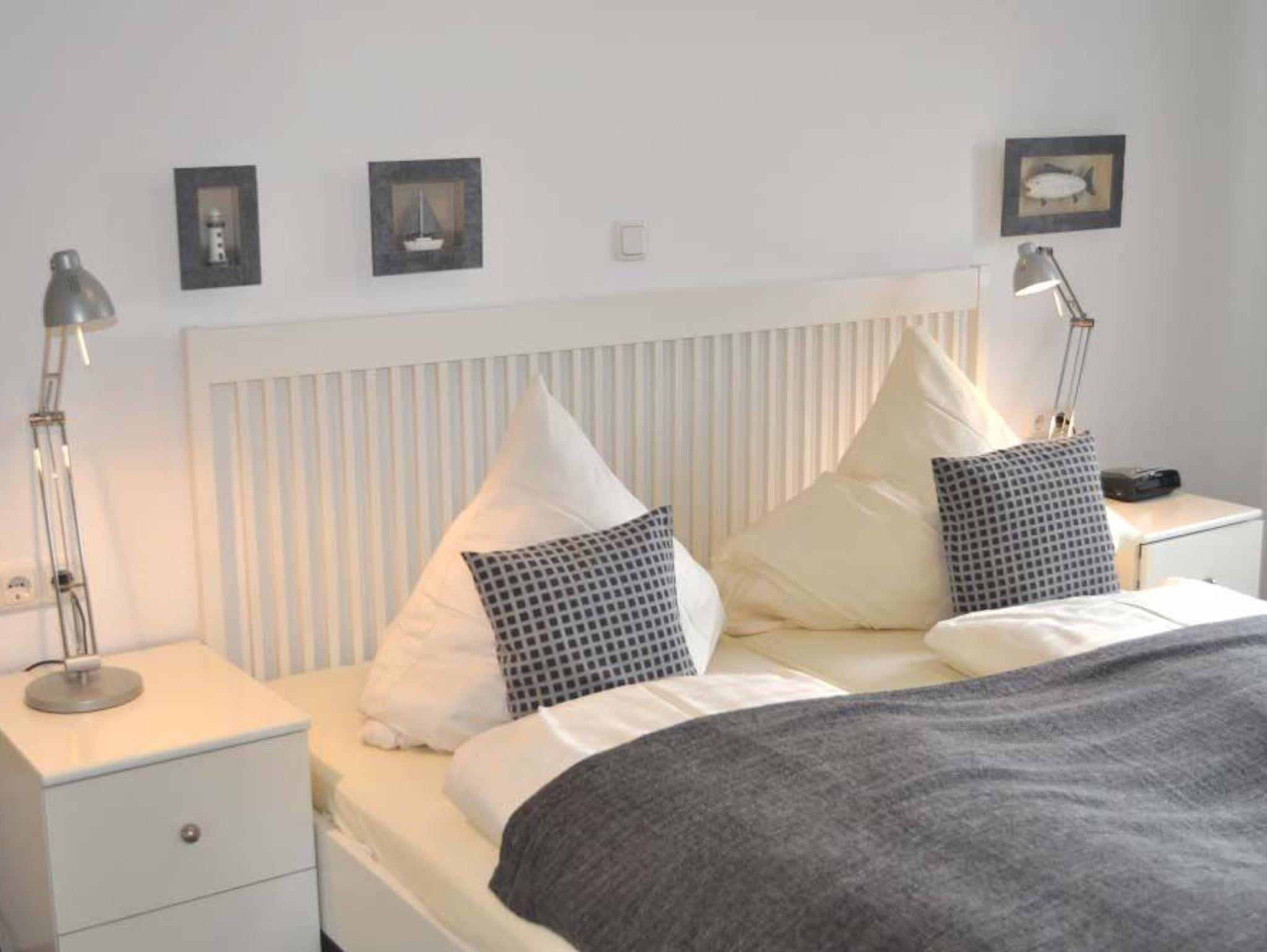 Schlafzimmer 1: 2 Matratzen, 2 Nachttische, Doppelbett 2,00 x 1,80 m, Kleiderschrank, Radiowecker, Stuhl
