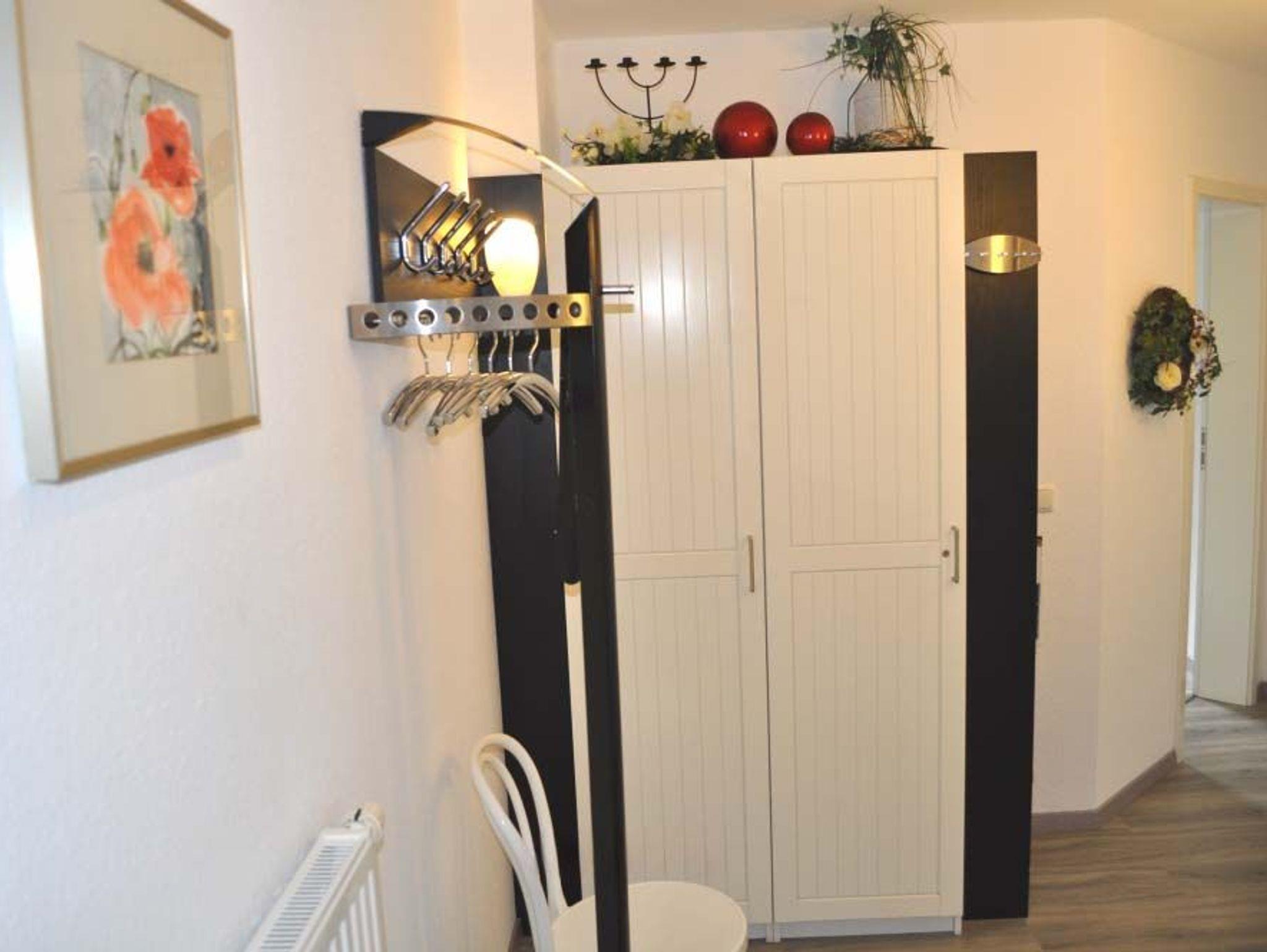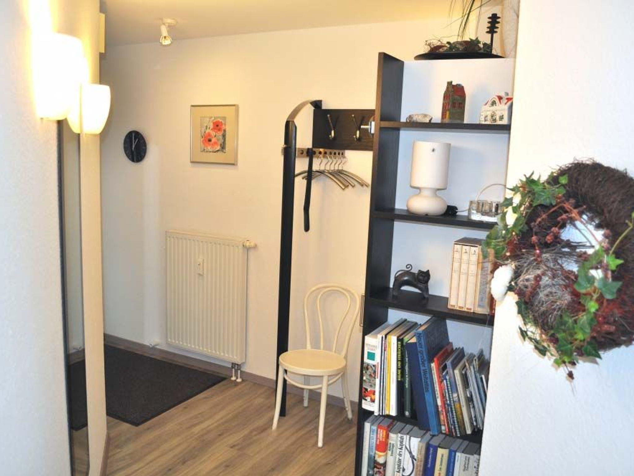 Flur: Garderobe, Regal mit Bücher, Schrank, Spiegel, Staubsauger, Tischlampe