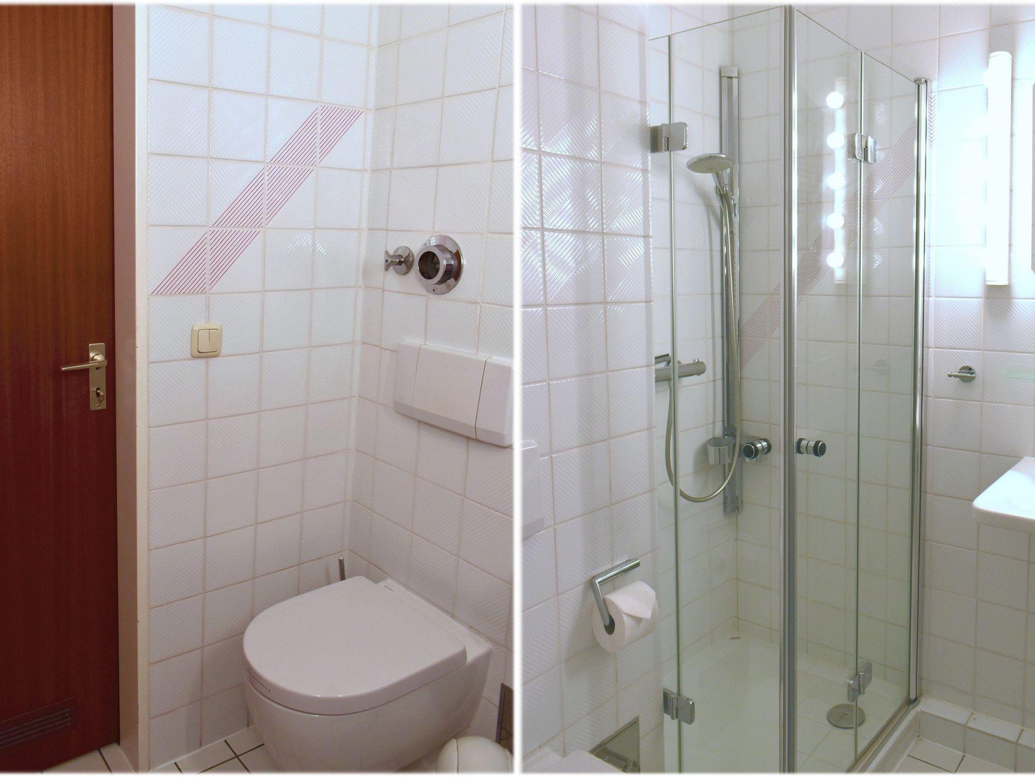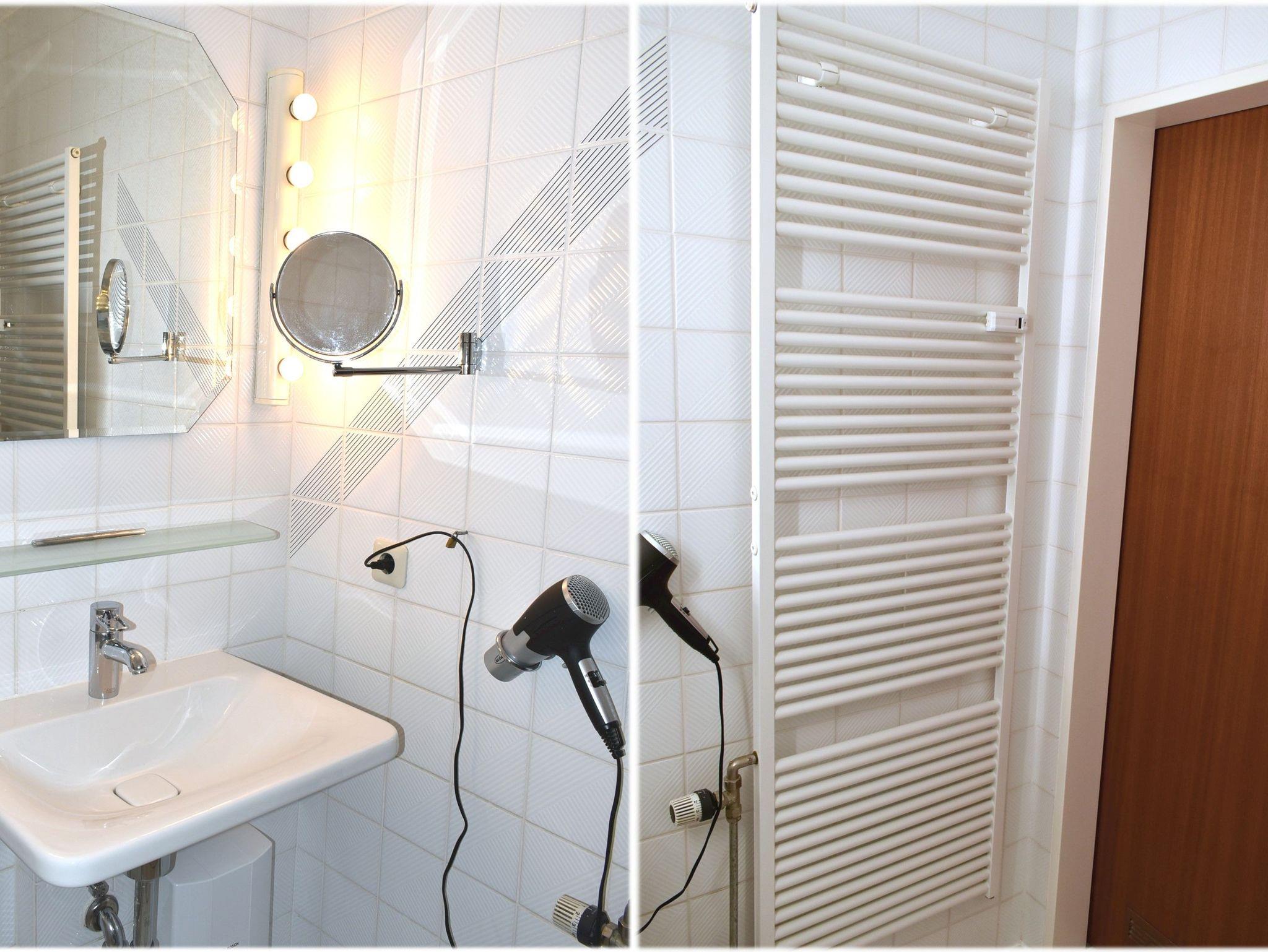 Bad 1: Fön, Handtuchheizung, Spiegelschrank, Waschbecken, WC