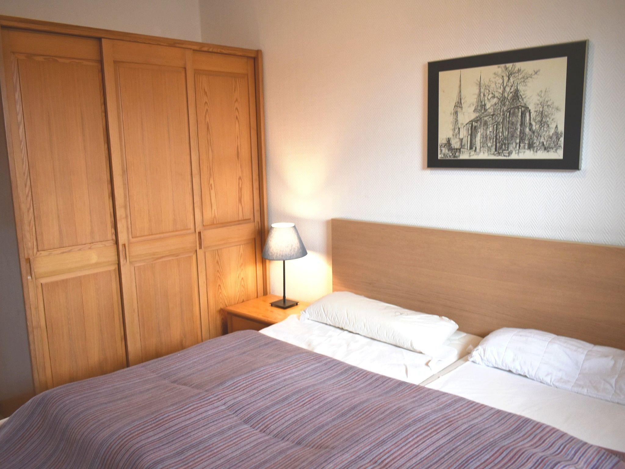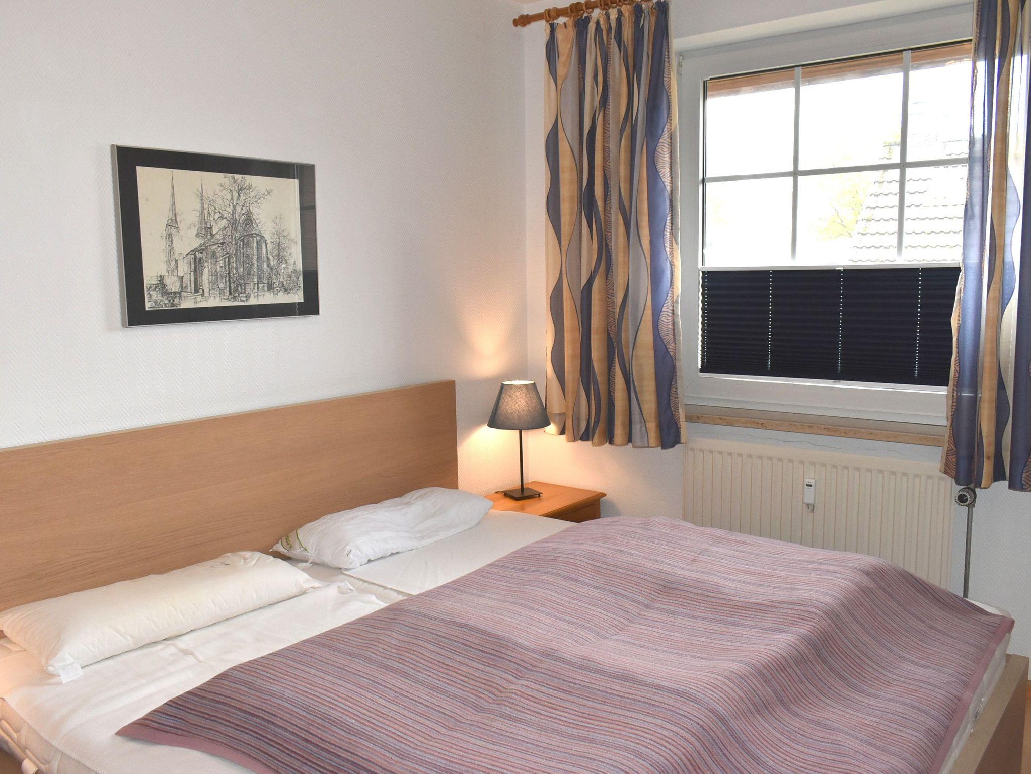 Schlafzimmer 1: 2 Matratzen, 2 Nachttische, 2 Nachttischlampen, Doppelbett 2,00 x 1,80 m, Kleiderschrank, Verdunklungsplissee