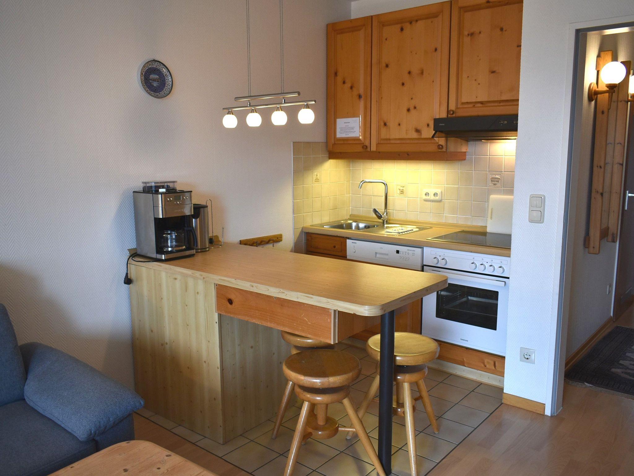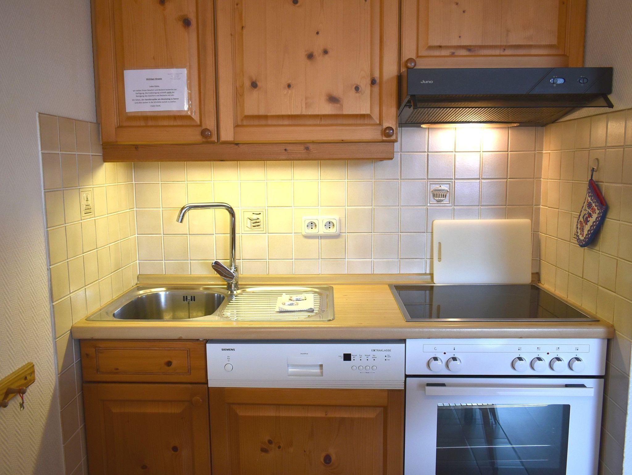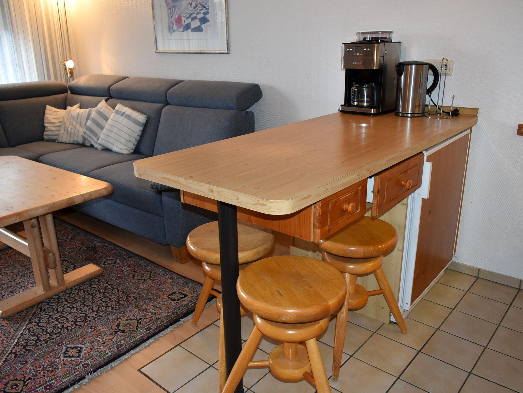 Wohnzimmer: 4 Plattenherd mit Ceranfeld und Backofen, Dunstabzugshaube, Eckschlafcouch, Flachbildschirm, Kabel-TV, Kaffeemaschine, Kochtöpfe, Kühlschrank mit 3* Gefrierfach, Mikrowelle, Plissees, Schrank, Spülmaschine, Stehlampe, Stereoanlage, Toaster, Wasserkocher