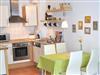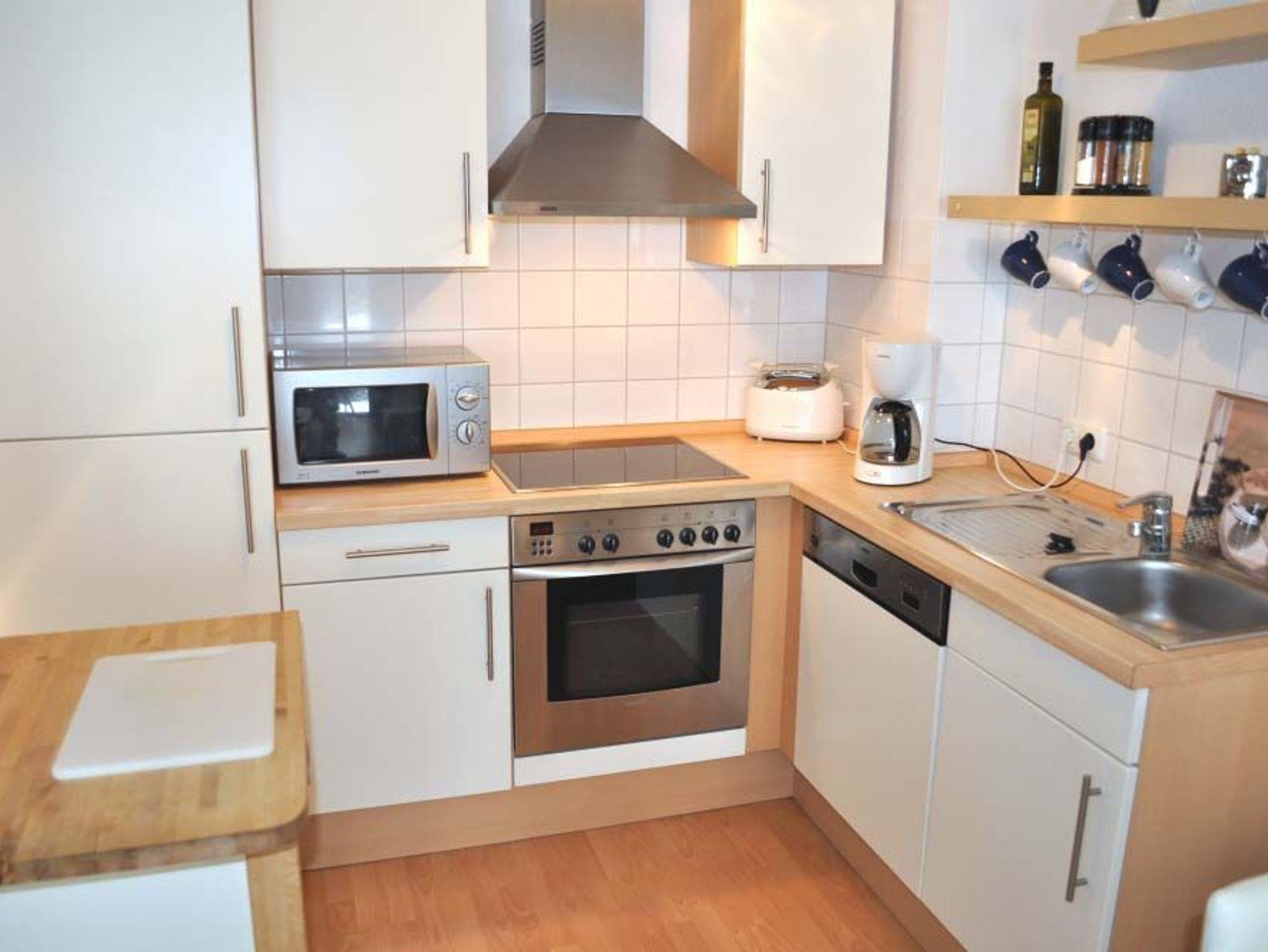 Wohnzimmer: 2 Sessel, 2 Stehlampen, 4 Plattenherd mit Ceranfeld und Backofen, 4 Stühle, Couch, Couchtisch, Dunstabzugshaube, DVD-Player, Einbauküche, Esstisch, Flachbildschirm, Geschirr, Hängeregal, Kabel-TV, Kaffeemaschine, Kochtöpfe, Kühlschrank, Mikrowelle, Spülmaschine, Stereoanlage mit CD-Player, Toaster, TV-Bank, Vitrine, Wasserkocher